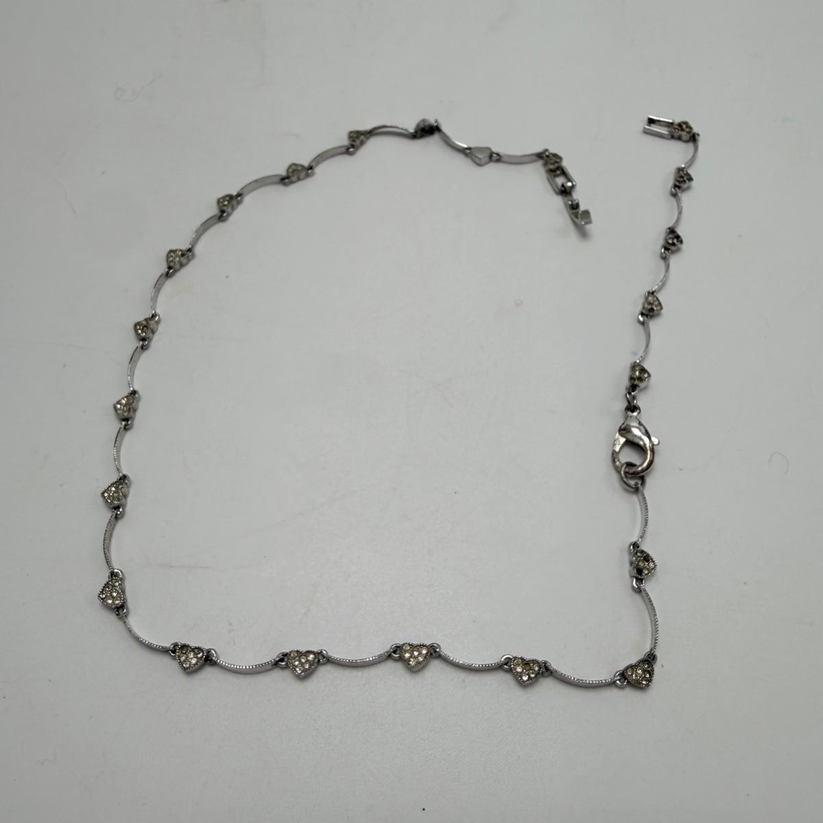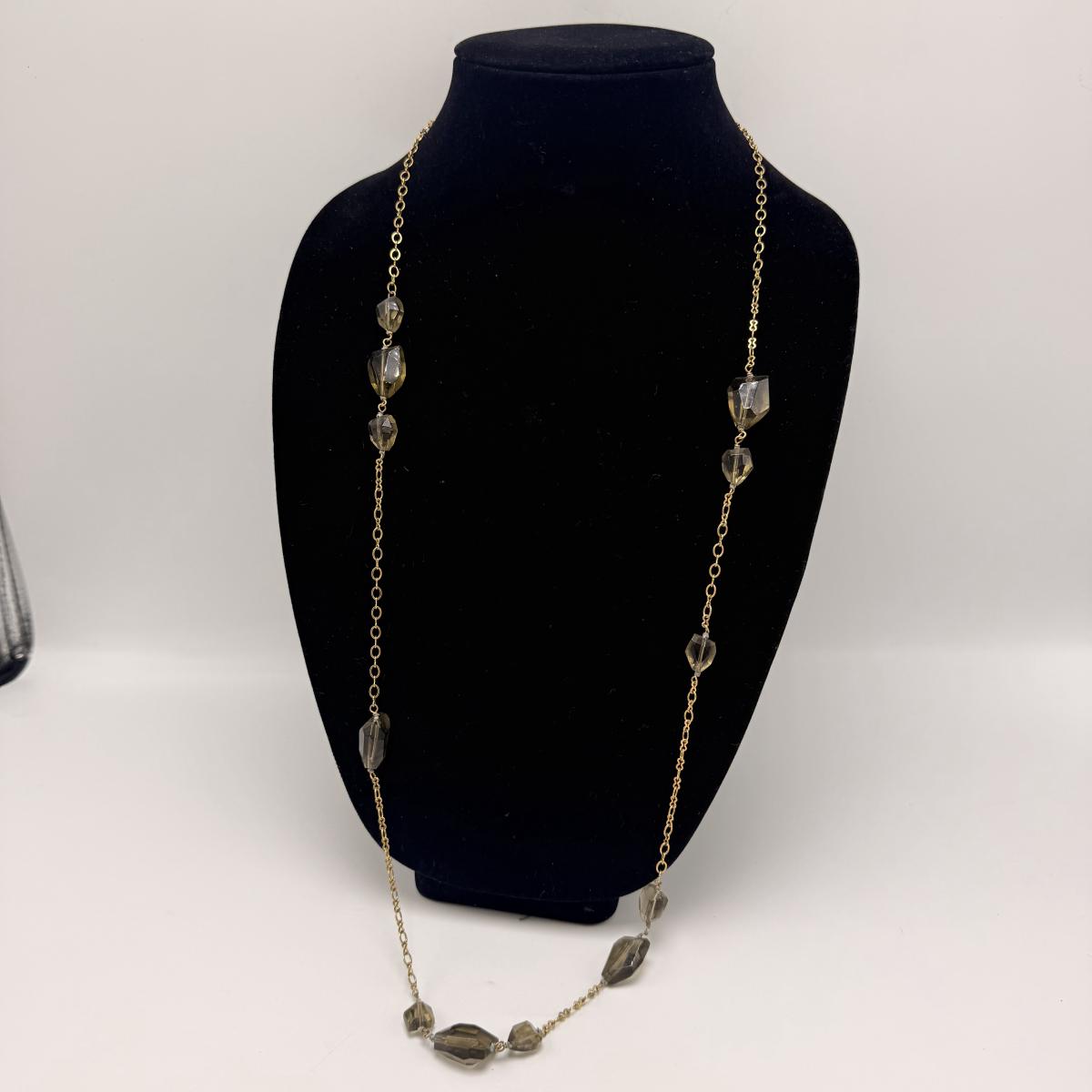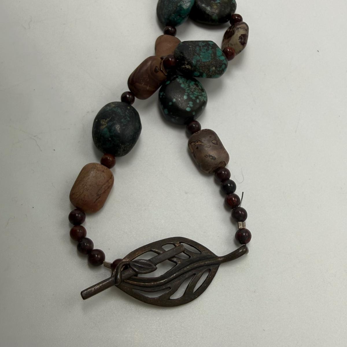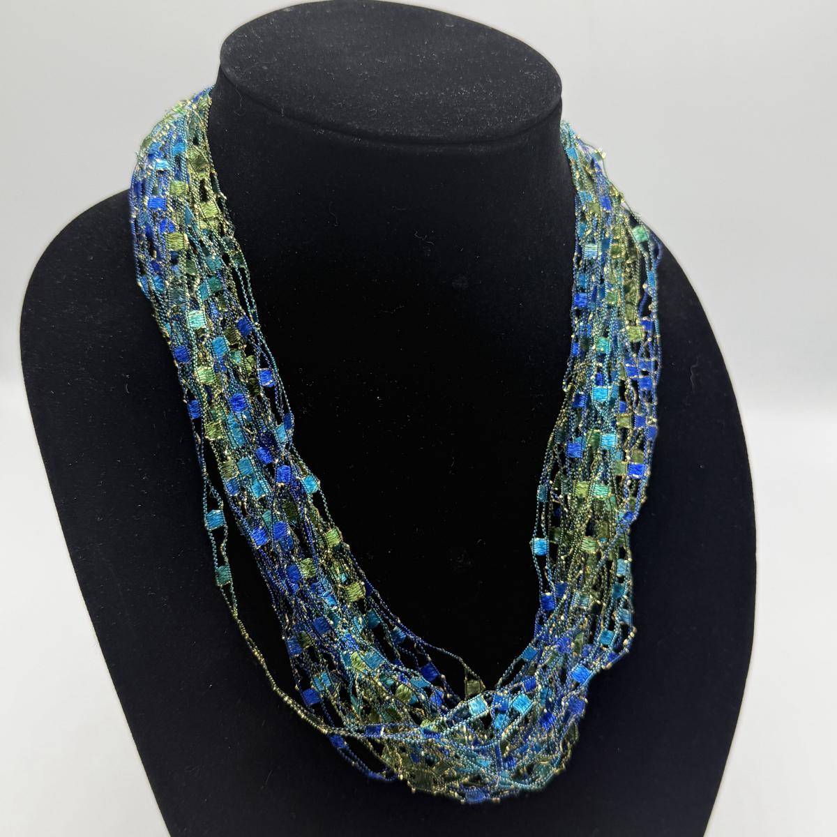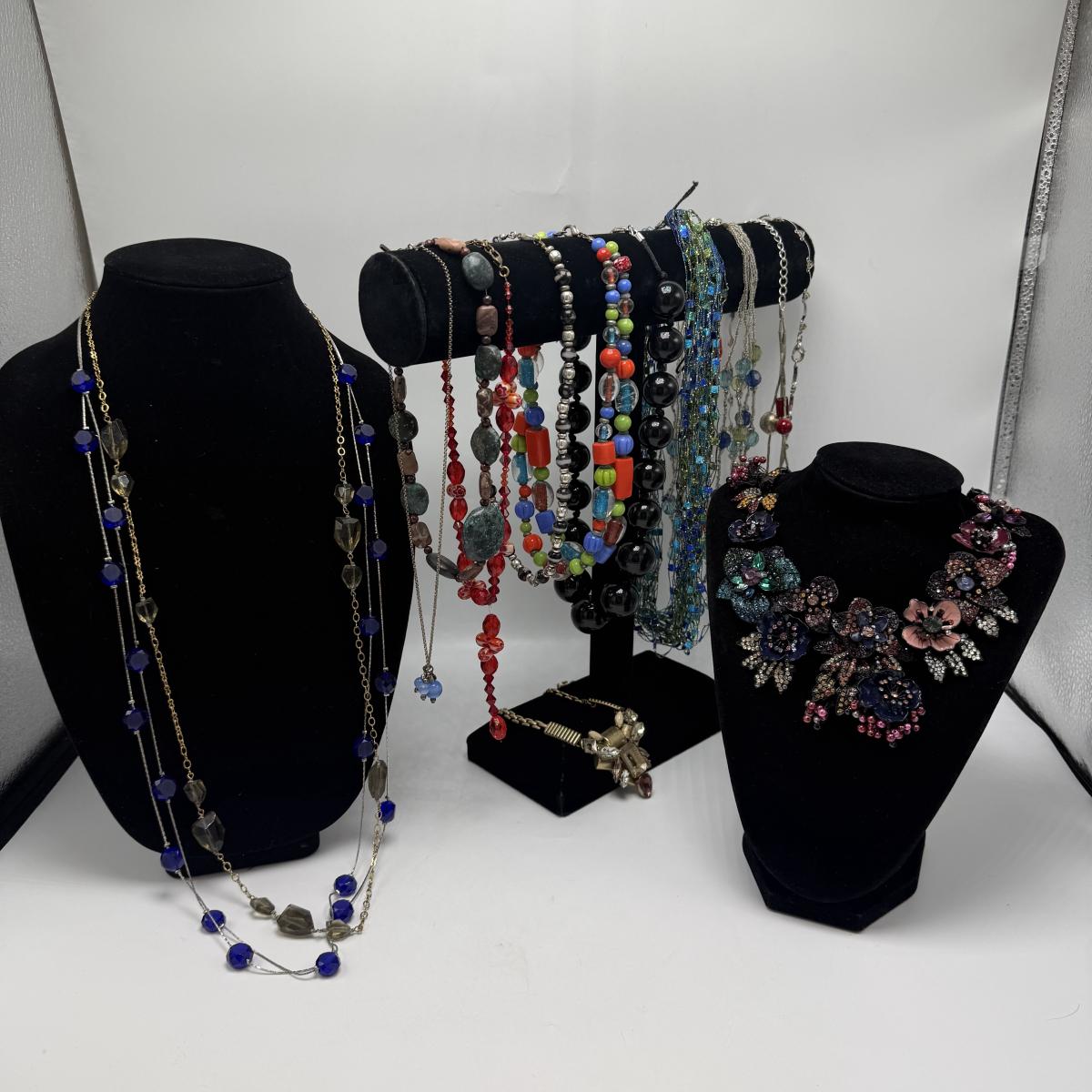 14 necklaces, most of which are beaded. One necklace has pendants on a silver chain. The flower and gemstone necklace has a Zara label. Also tags from J. Crew and Chico’s. There’s glass, natural stones, fiber, and more in the collection. The longest necklace is the double-stranded necklace with the blue beads at 36“. One necklace is missing some larger gemstones. The necklace with the hearts has two clasps. It’s missing some small gems.