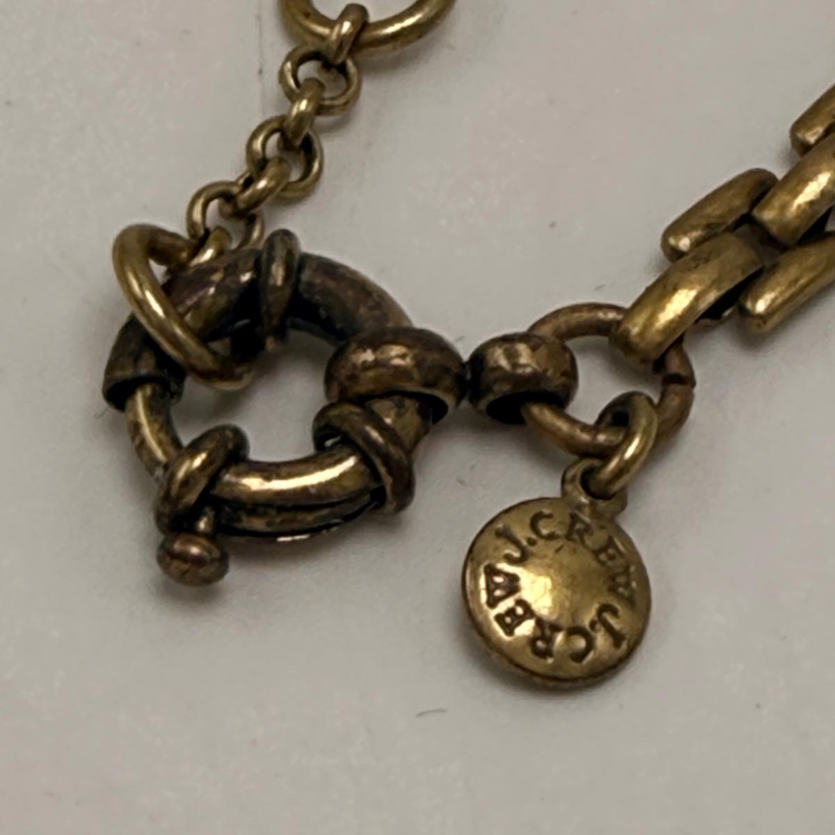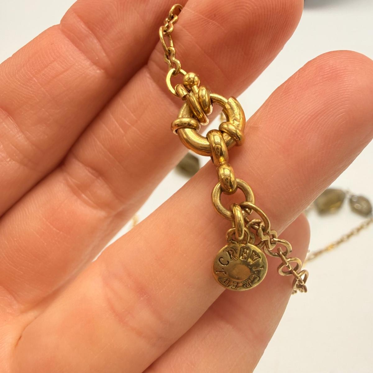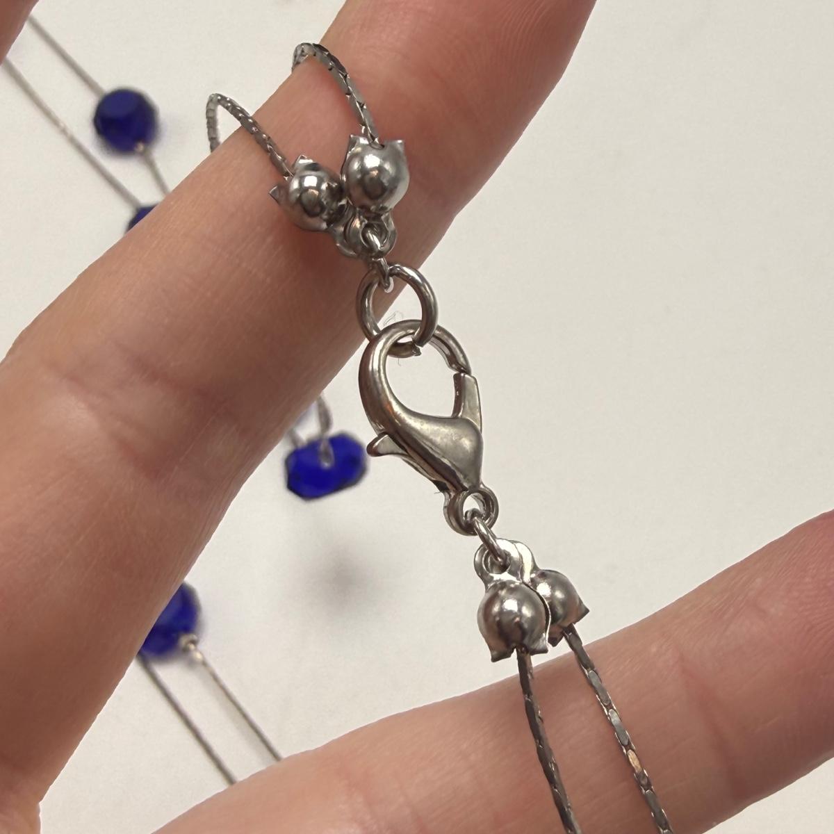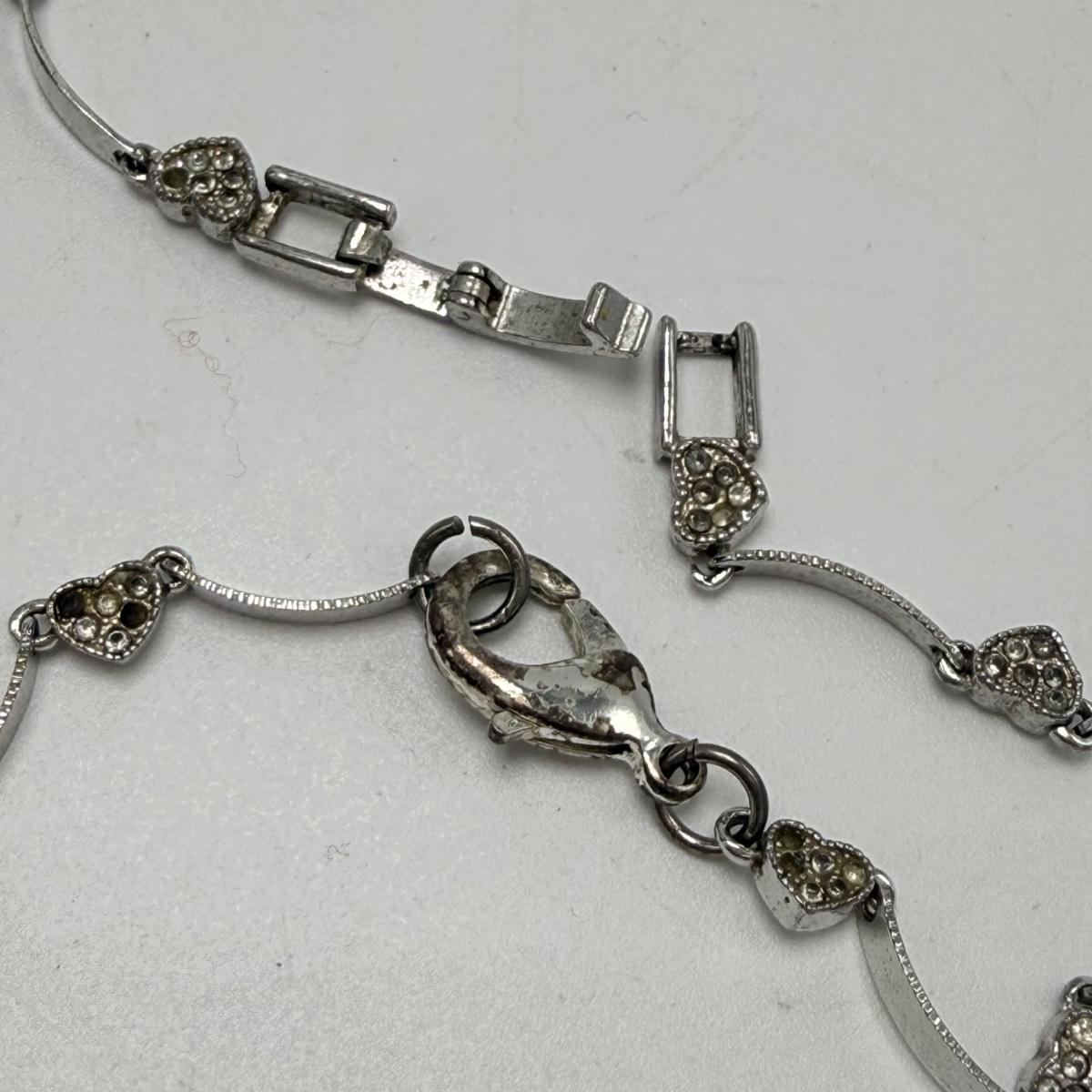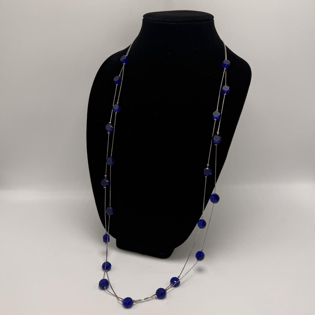 14 necklaces, most of which are beaded. One necklace has pendants on a silver chain. The flower and gemstone necklace has a Zara label. Also tags from J. Crew and Chico’s. There’s glass, natural stones, fiber, and more in the collection. The longest necklace is the double-stranded necklace with the blue beads at 36“. One necklace is missing some larger gemstones. The necklace with the hearts has two clasps. It’s missing some small gems.