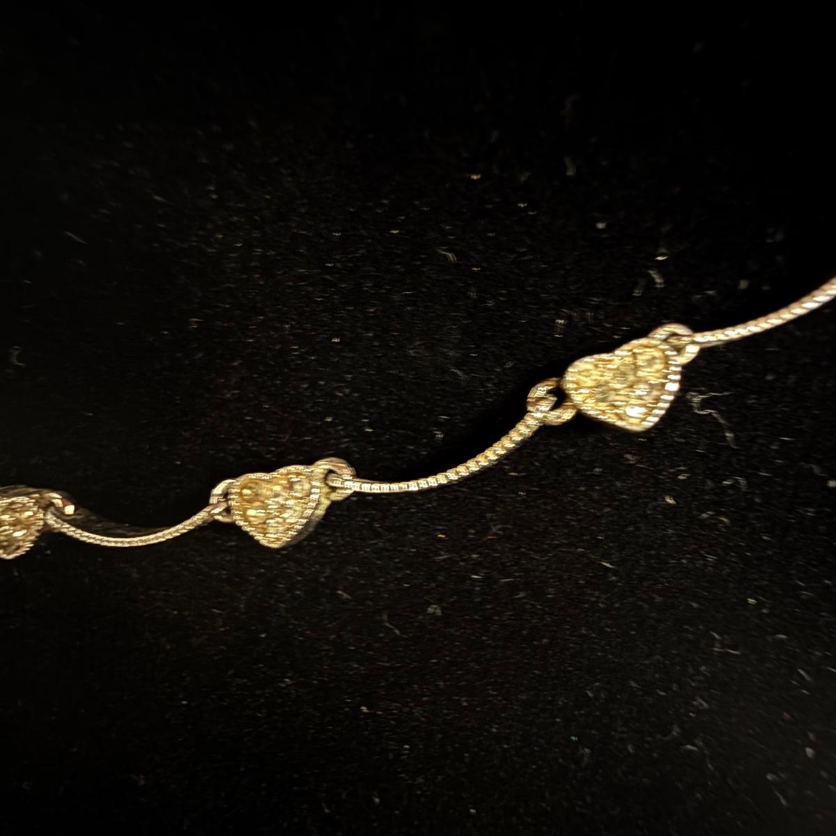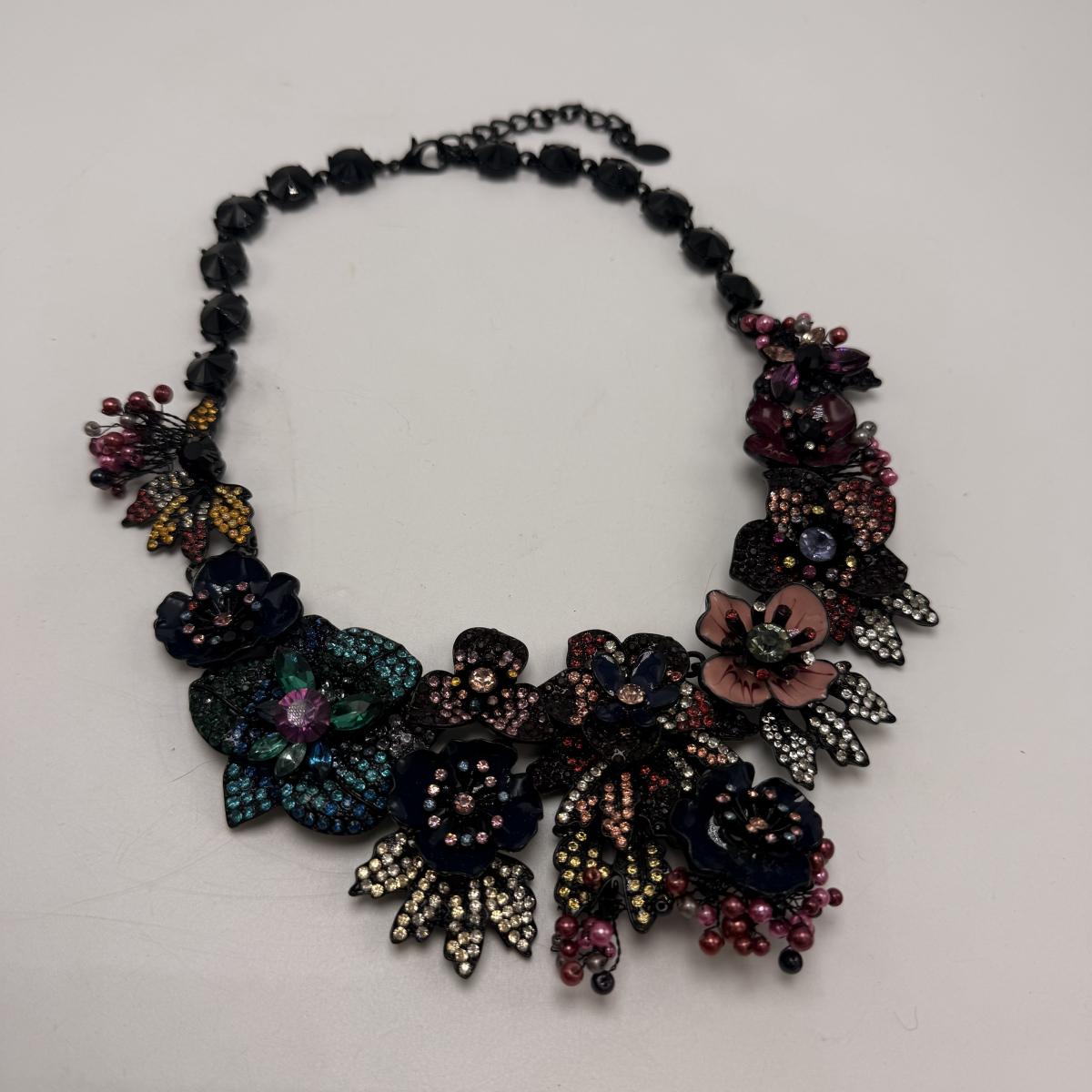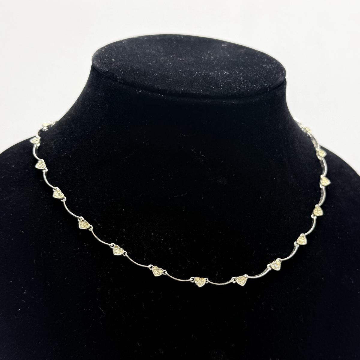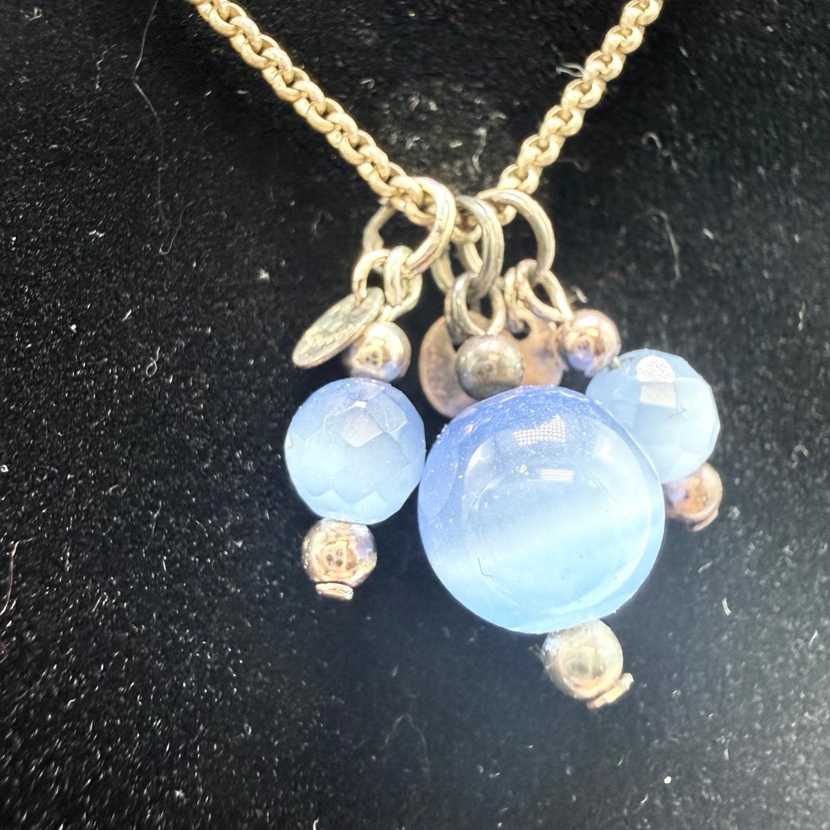 14 necklaces, most of which are beaded. One necklace has pendants on a silver chain. The flower and gemstone necklace has a Zara label. Also tags from J. Crew and Chico’s. There’s glass, natural stones, fiber, and more in the collection. The longest necklace is the double-stranded necklace with the blue beads at 36“. One necklace is missing some larger gemstones. The necklace with the hearts has two clasps. It’s missing some small gems.