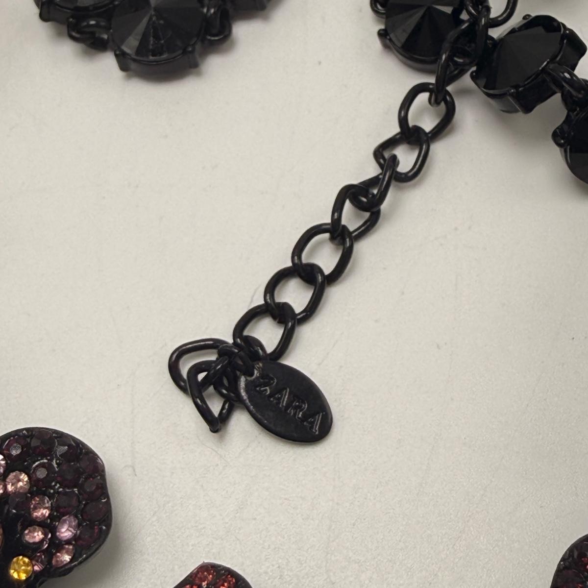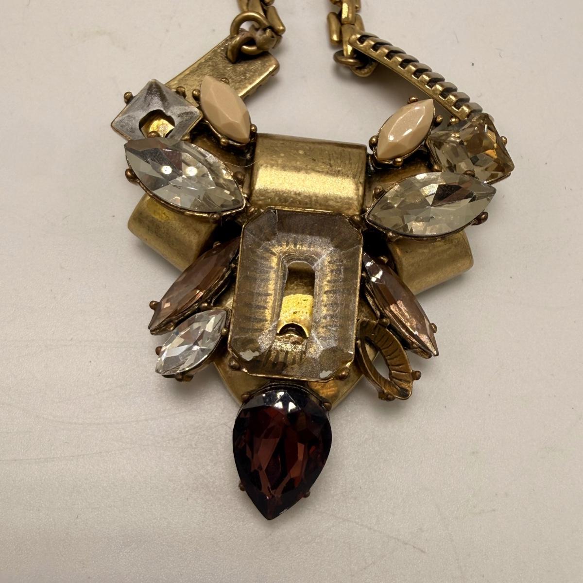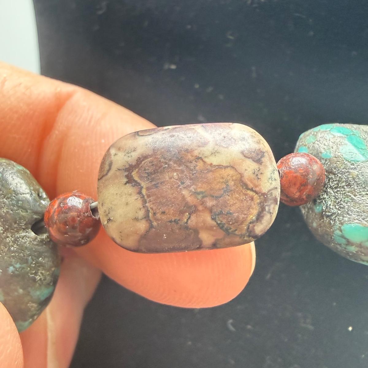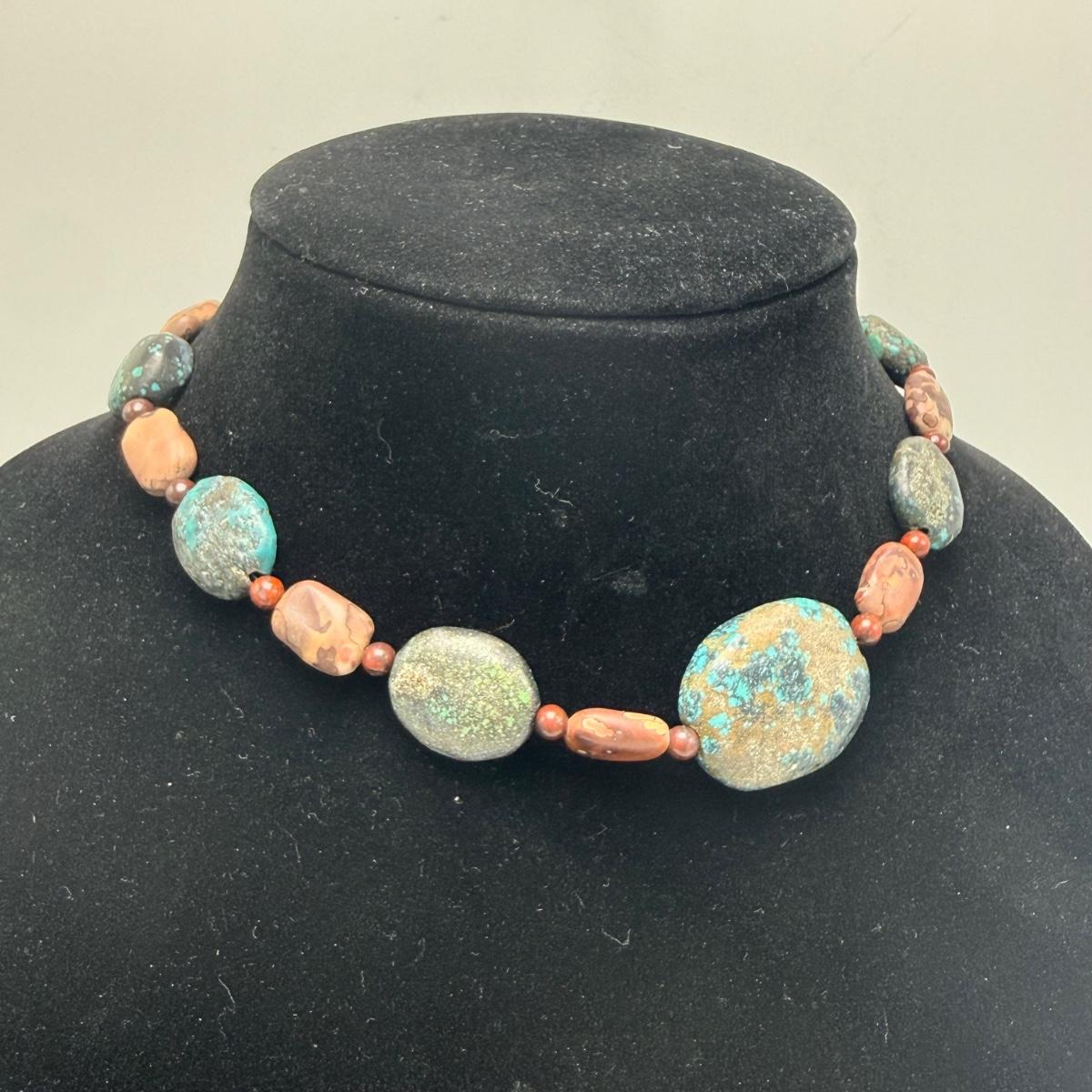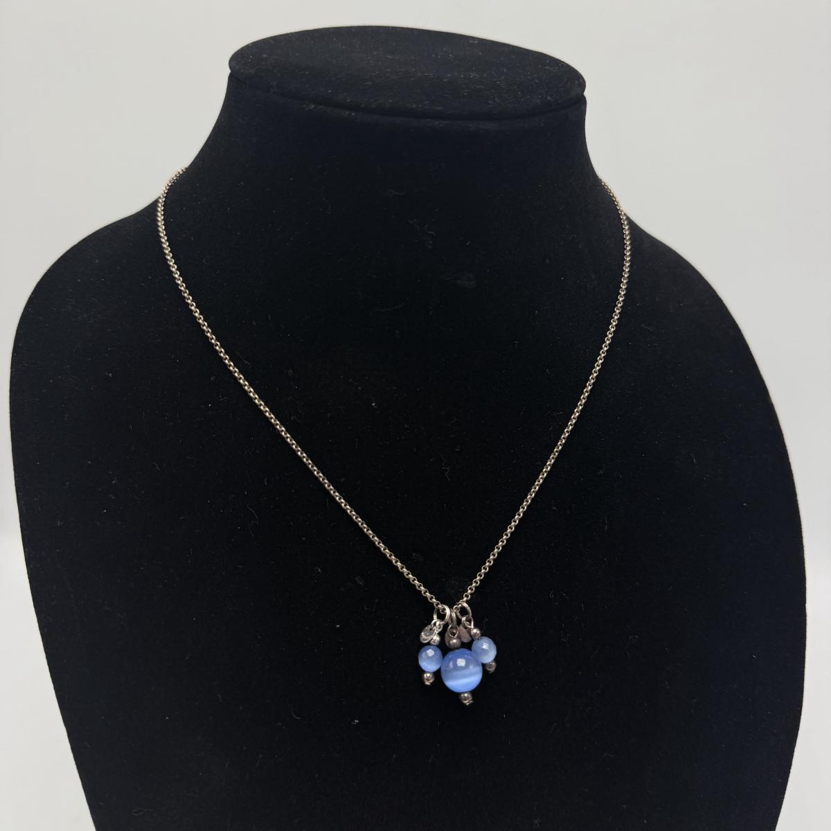 14 necklaces, most of which are beaded. One necklace has pendants on a silver chain. The flower and gemstone necklace has a Zara label. Also tags from J. Crew and Chico’s. There’s glass, natural stones, fiber, and more in the collection. The longest necklace is the double-stranded necklace with the blue beads at 36“. One necklace is missing some larger gemstones. The necklace with the hearts has two clasps. It’s missing some small gems.