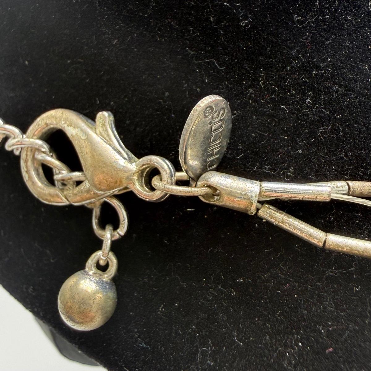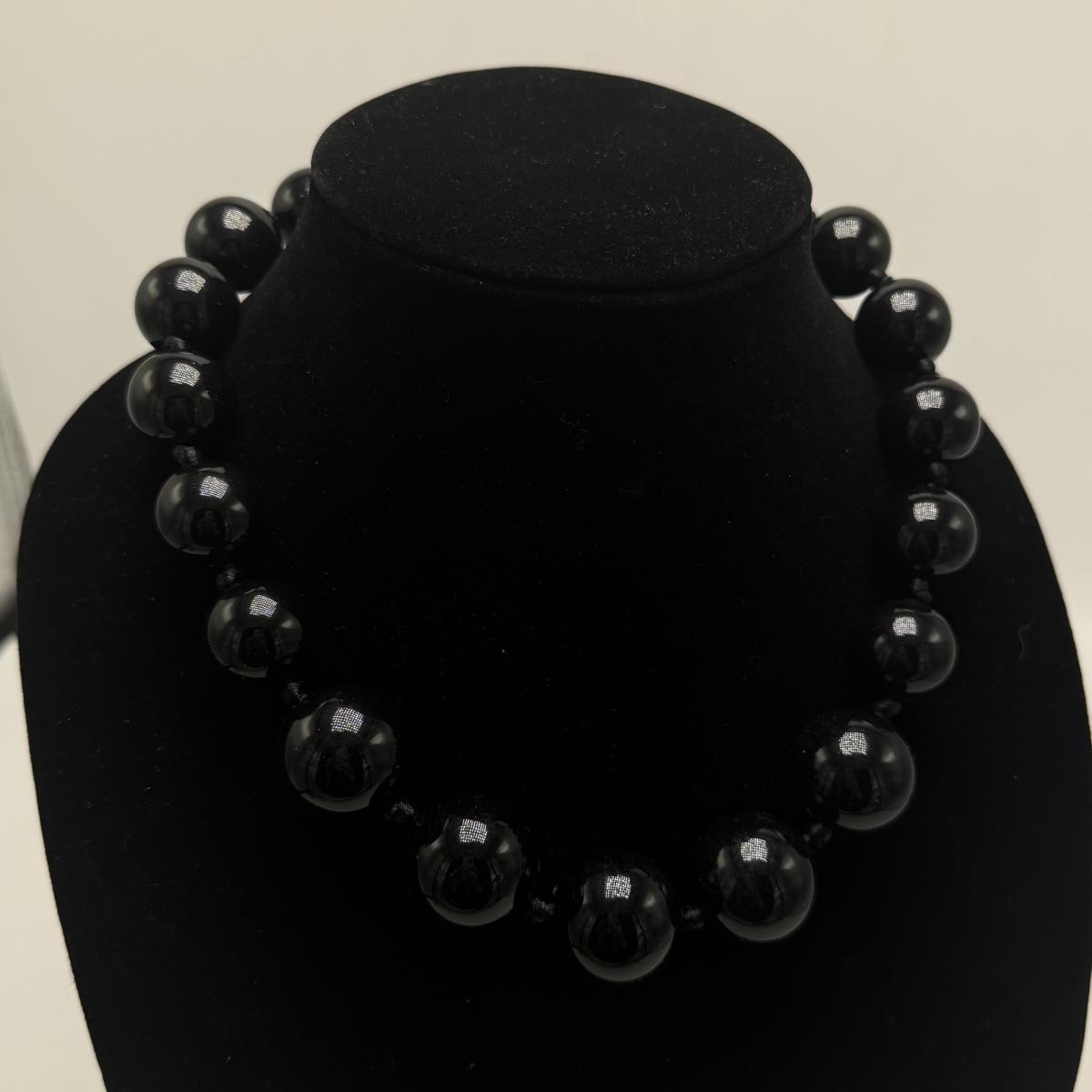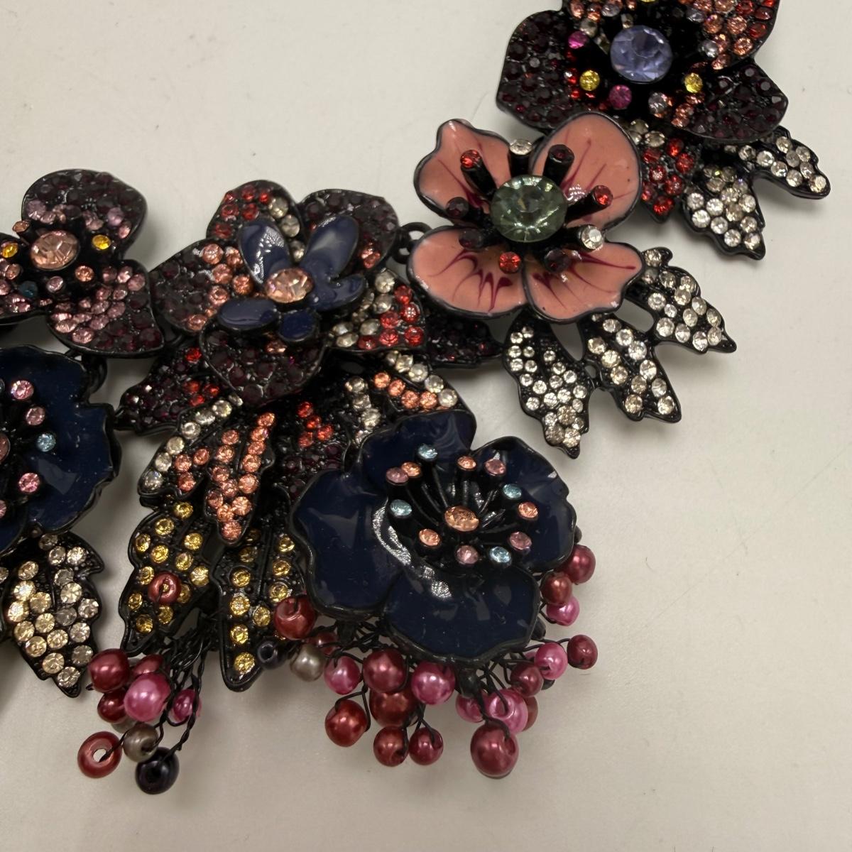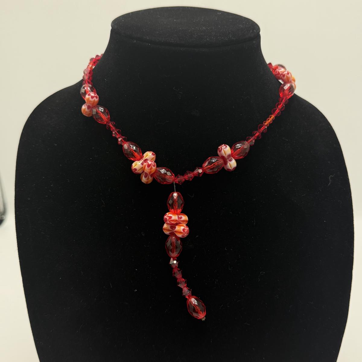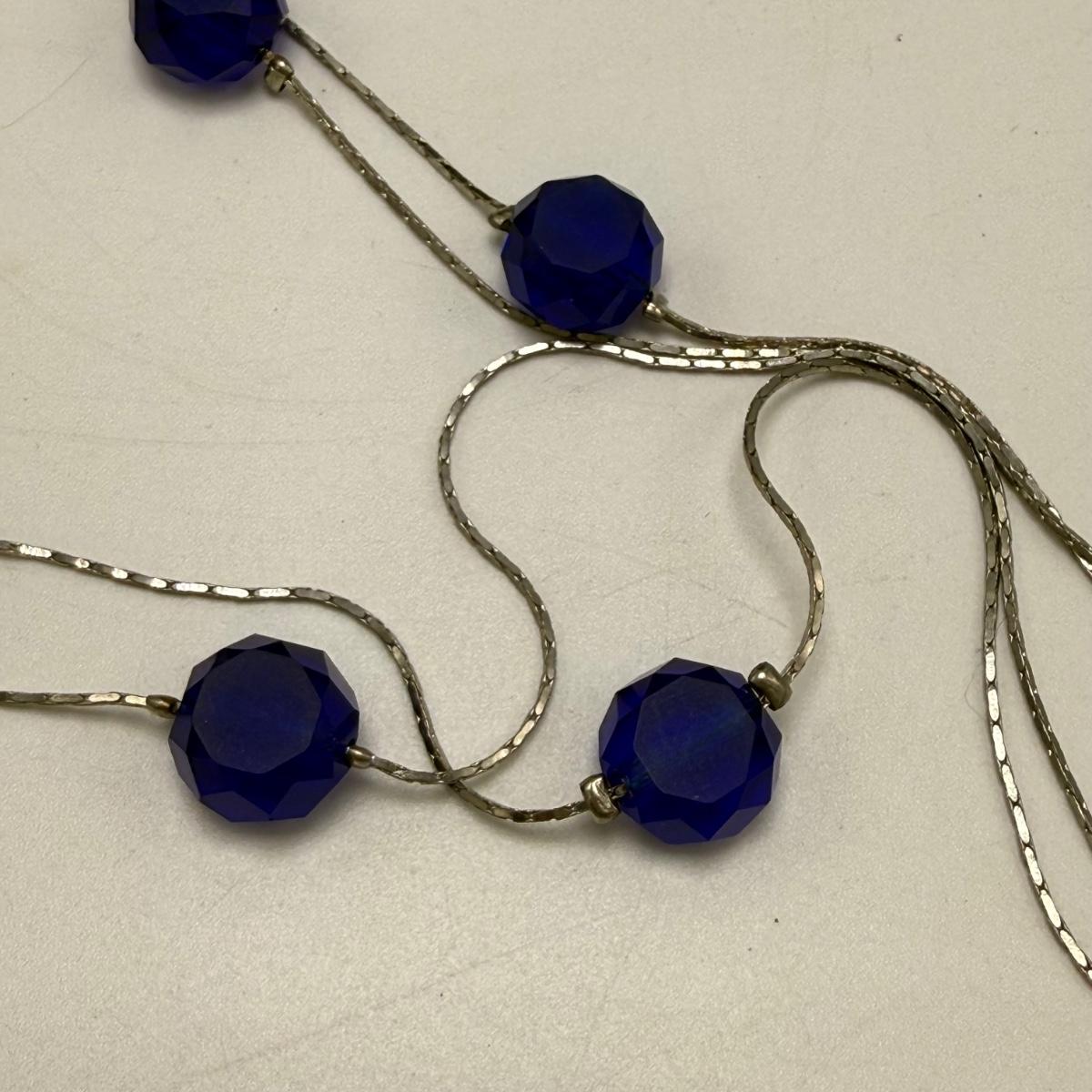 14 necklaces, most of which are beaded. One necklace has pendants on a silver chain. The flower and gemstone necklace has a Zara label. Also tags from J. Crew and Chico’s. There’s glass, natural stones, fiber, and more in the collection. The longest necklace is the double-stranded necklace with the blue beads at 36“. One necklace is missing some larger gemstones. The necklace with the hearts has two clasps. It’s missing some small gems.