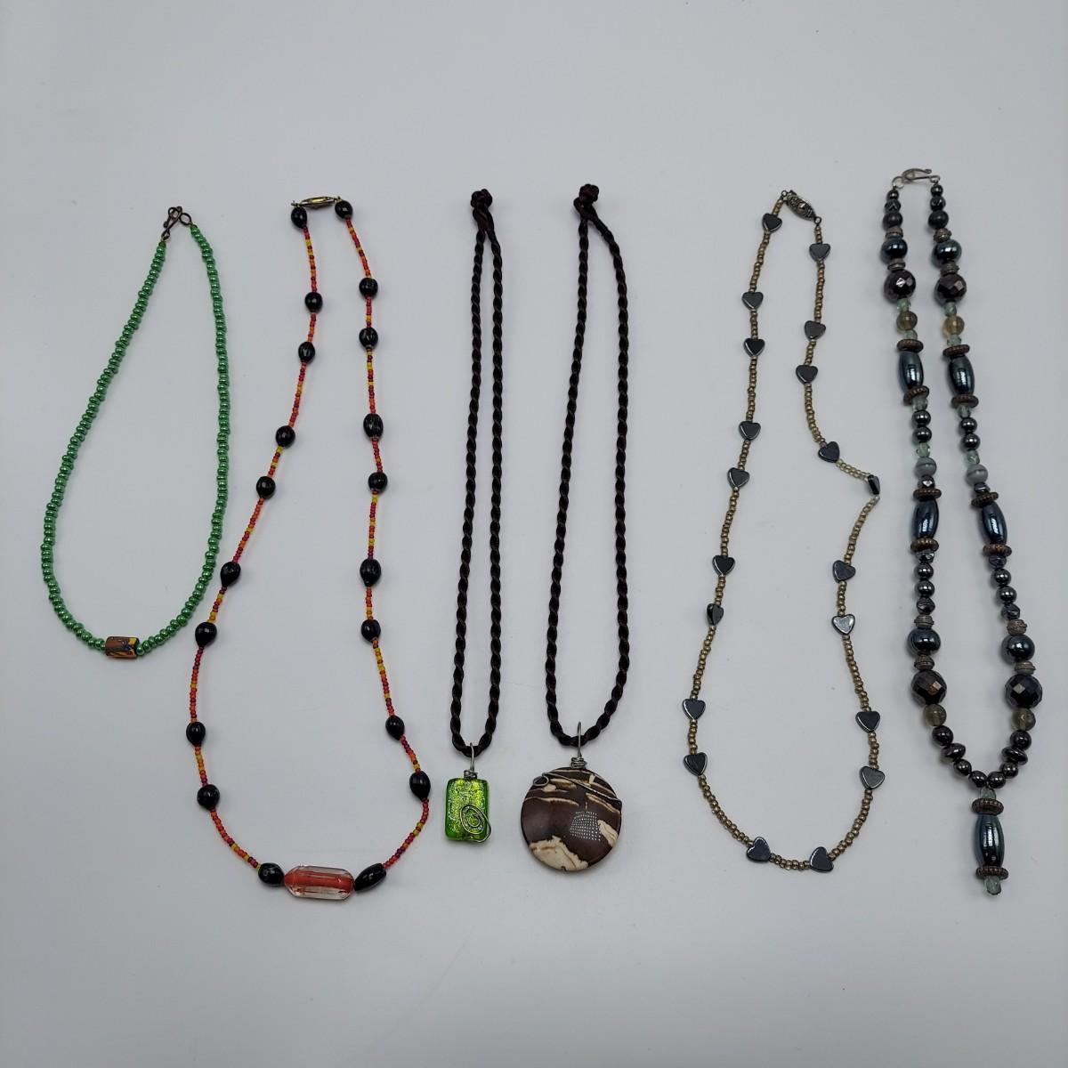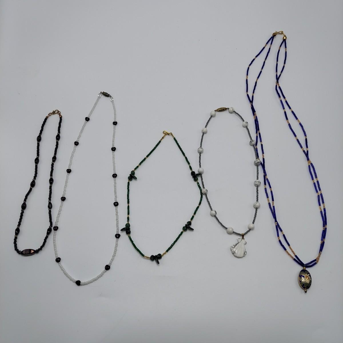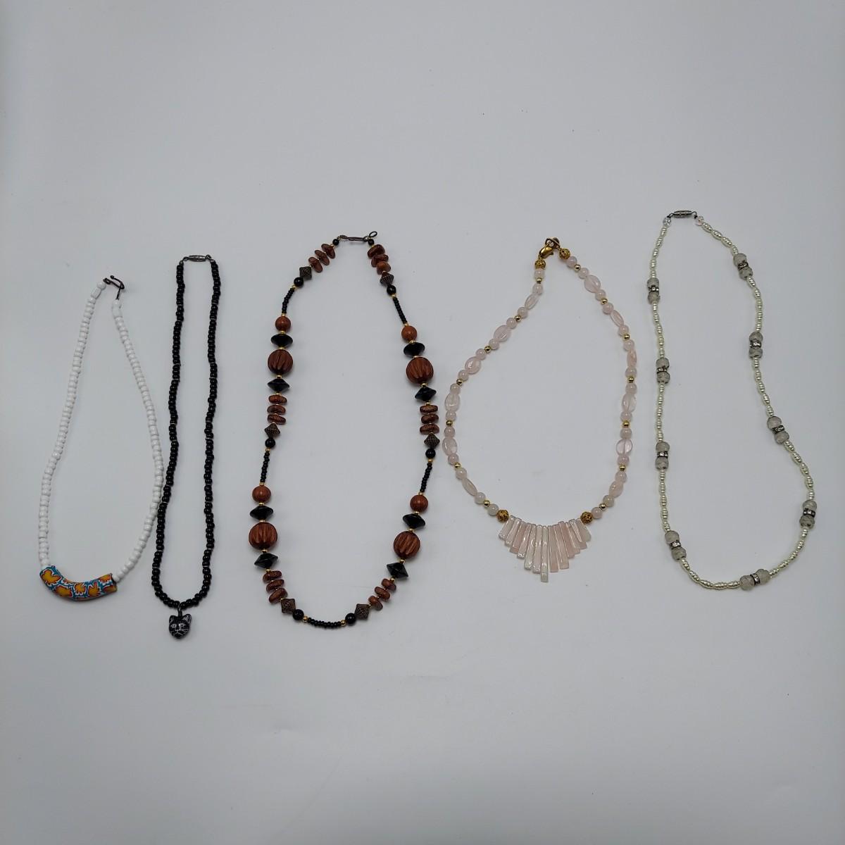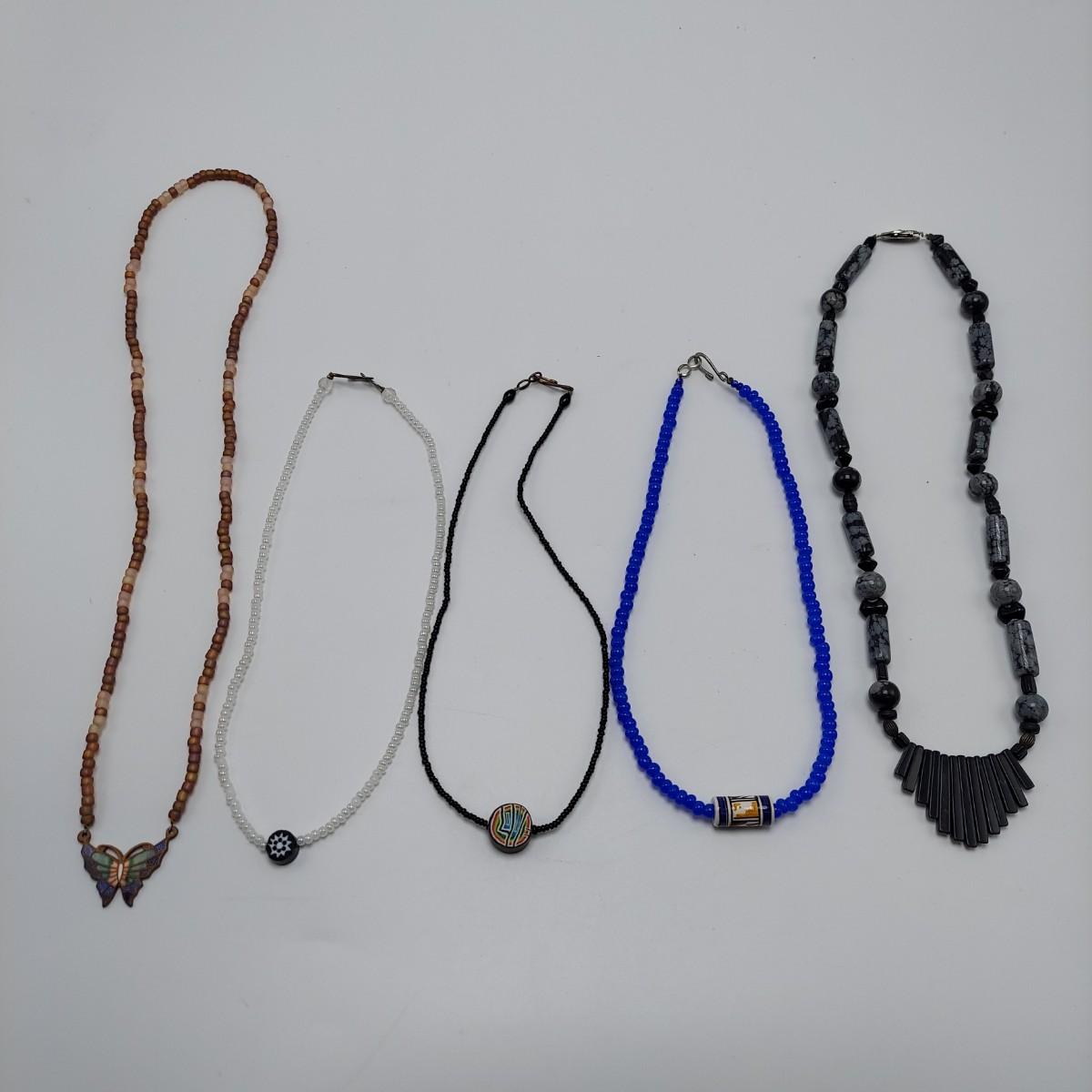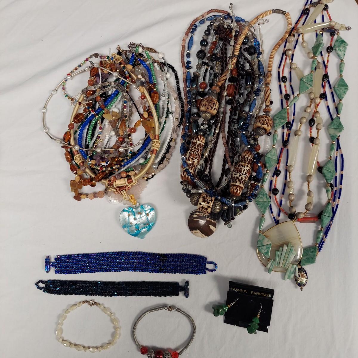 Lot includes one pair of dangle earrings for pierced ears, four bracelets and 30+ beaded necklaces. There are several short, medium and long necklaces. They range from 15” long (shortest) to 28” long (longest). There are plastic and glass beads as well as some that appear to be stones. Please see photos for details. Shipping available. All sales are final. No returns or refunds. Please bid accordingly.