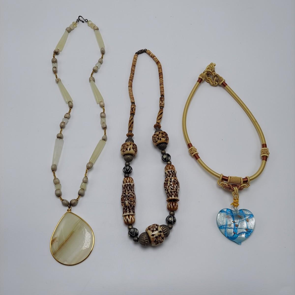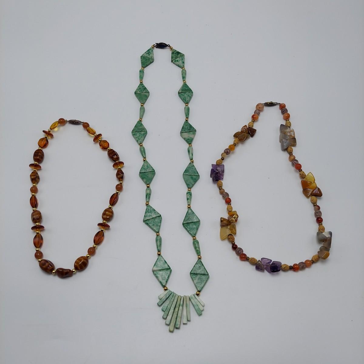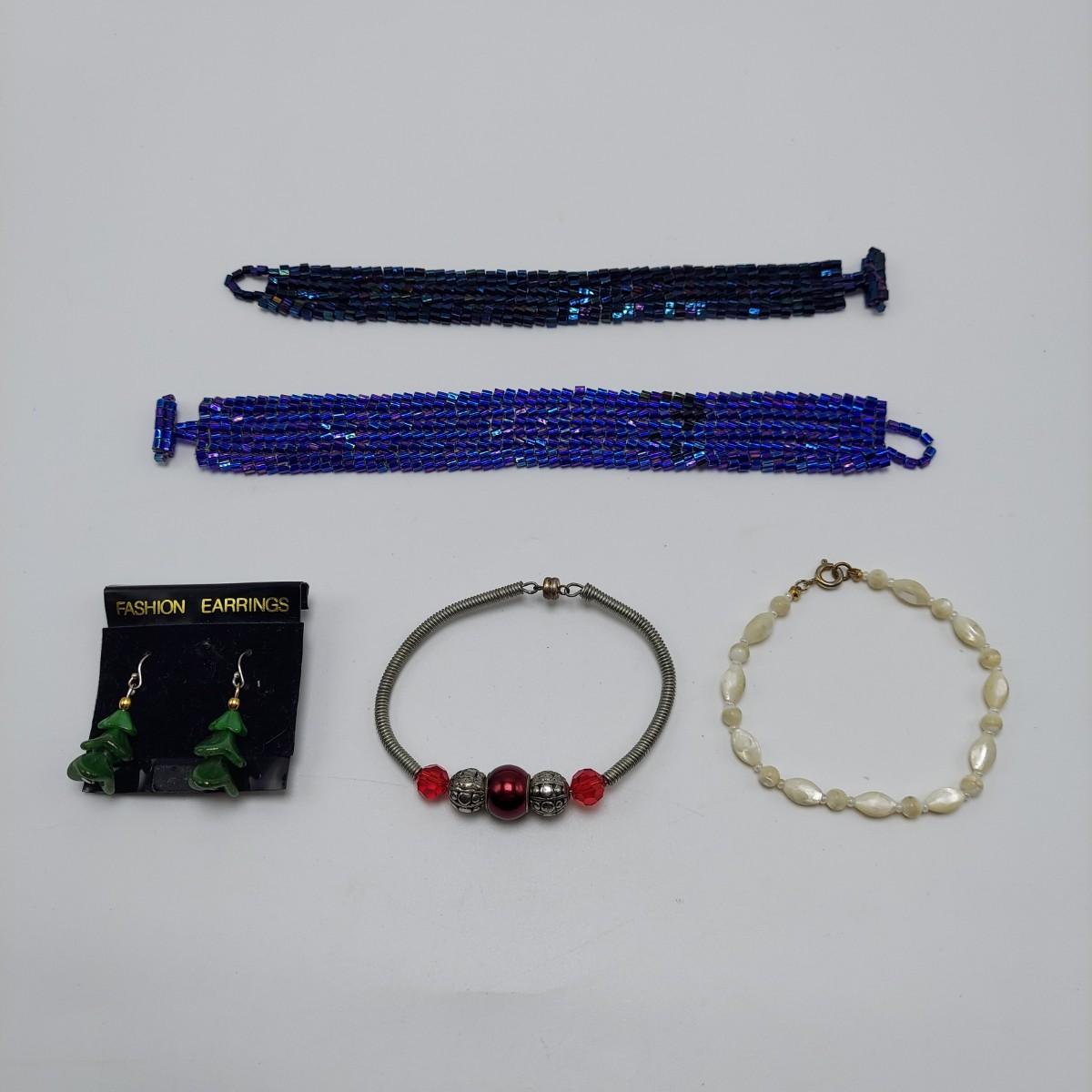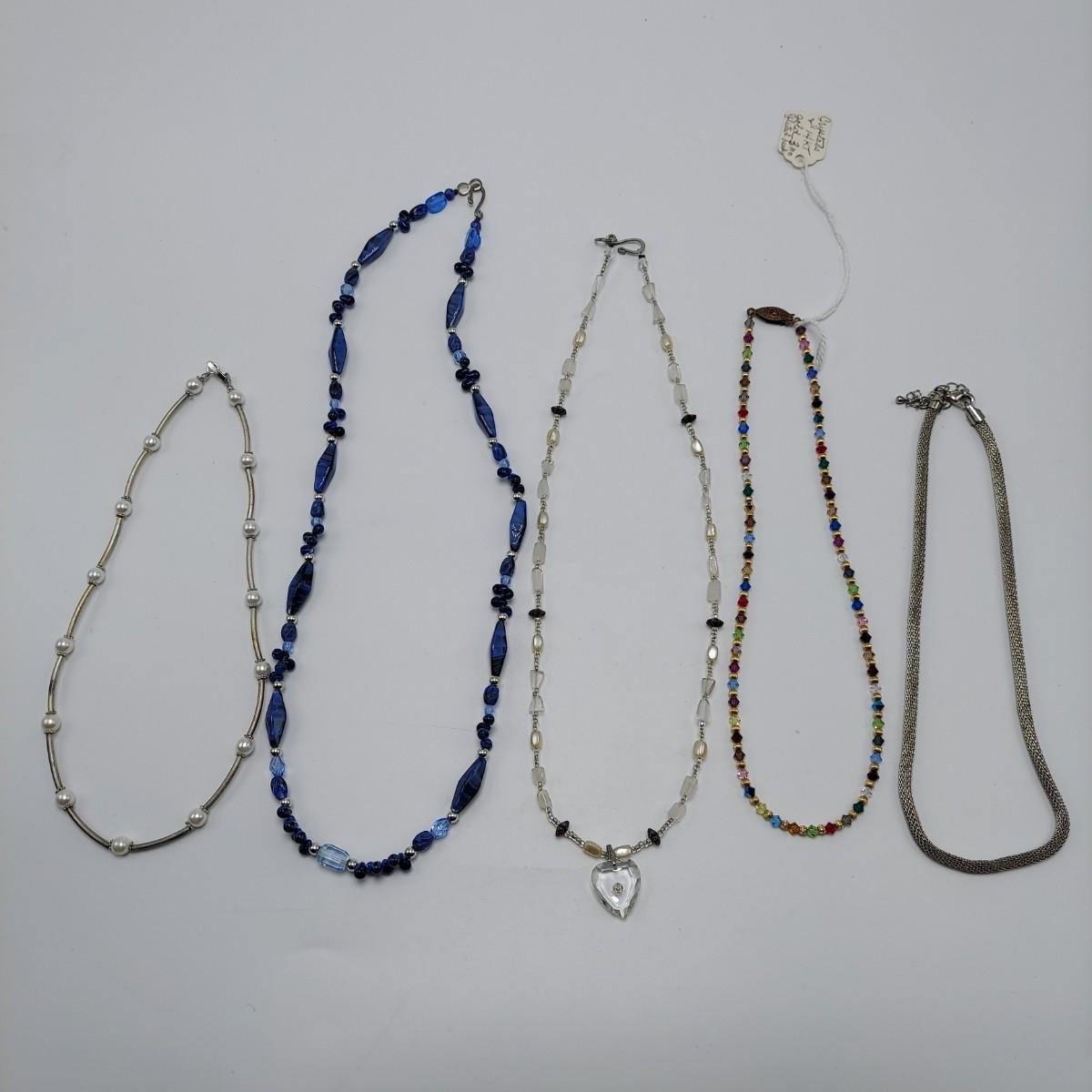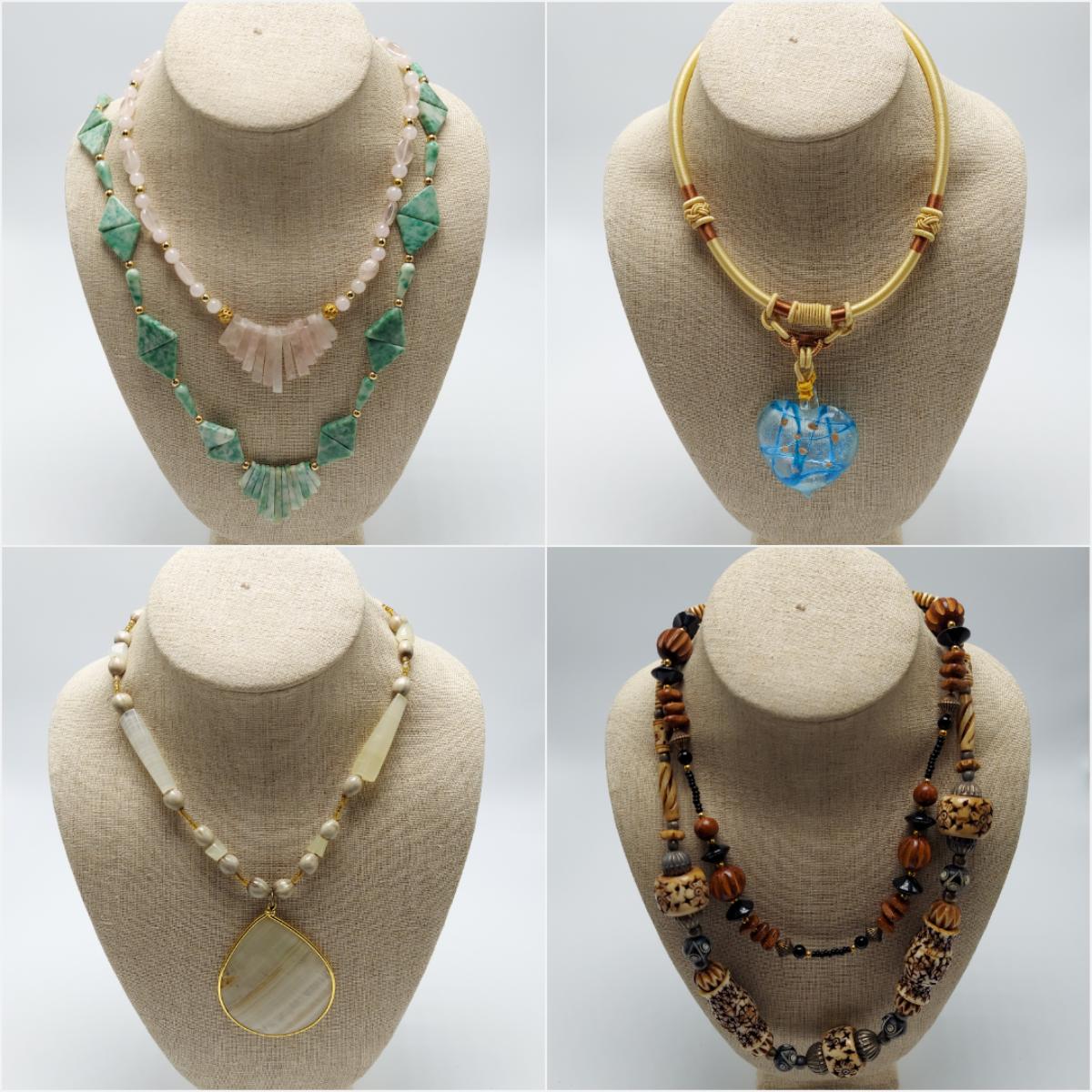 Lot includes one pair of dangle earrings for pierced ears, four bracelets and 30+ beaded necklaces. There are several short, medium and long necklaces. They range from 15” long (shortest) to 28” long (longest). There are plastic and glass beads as well as some that appear to be stones. Please see photos for details. Shipping available. All sales are final. No returns or refunds. Please bid accordingly.