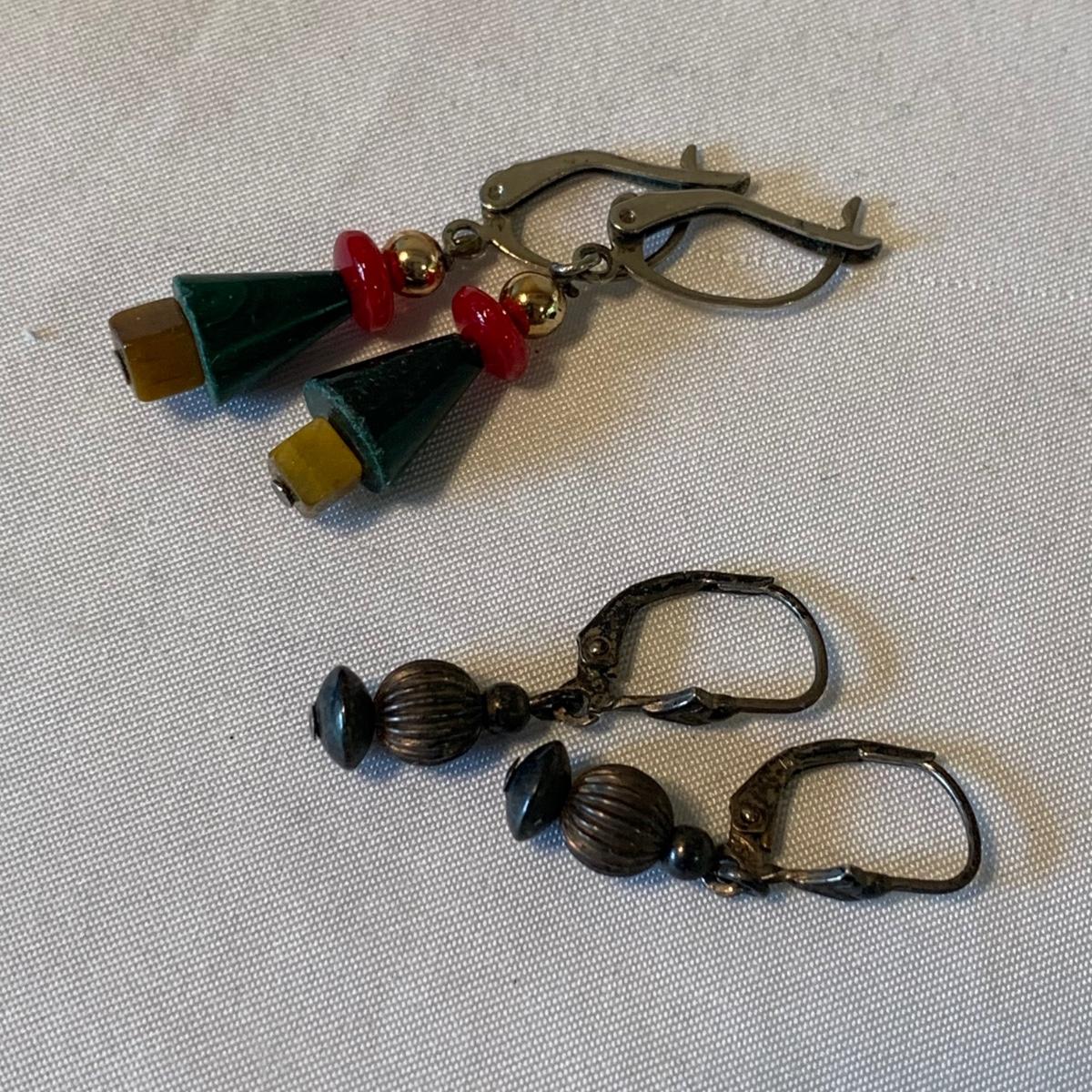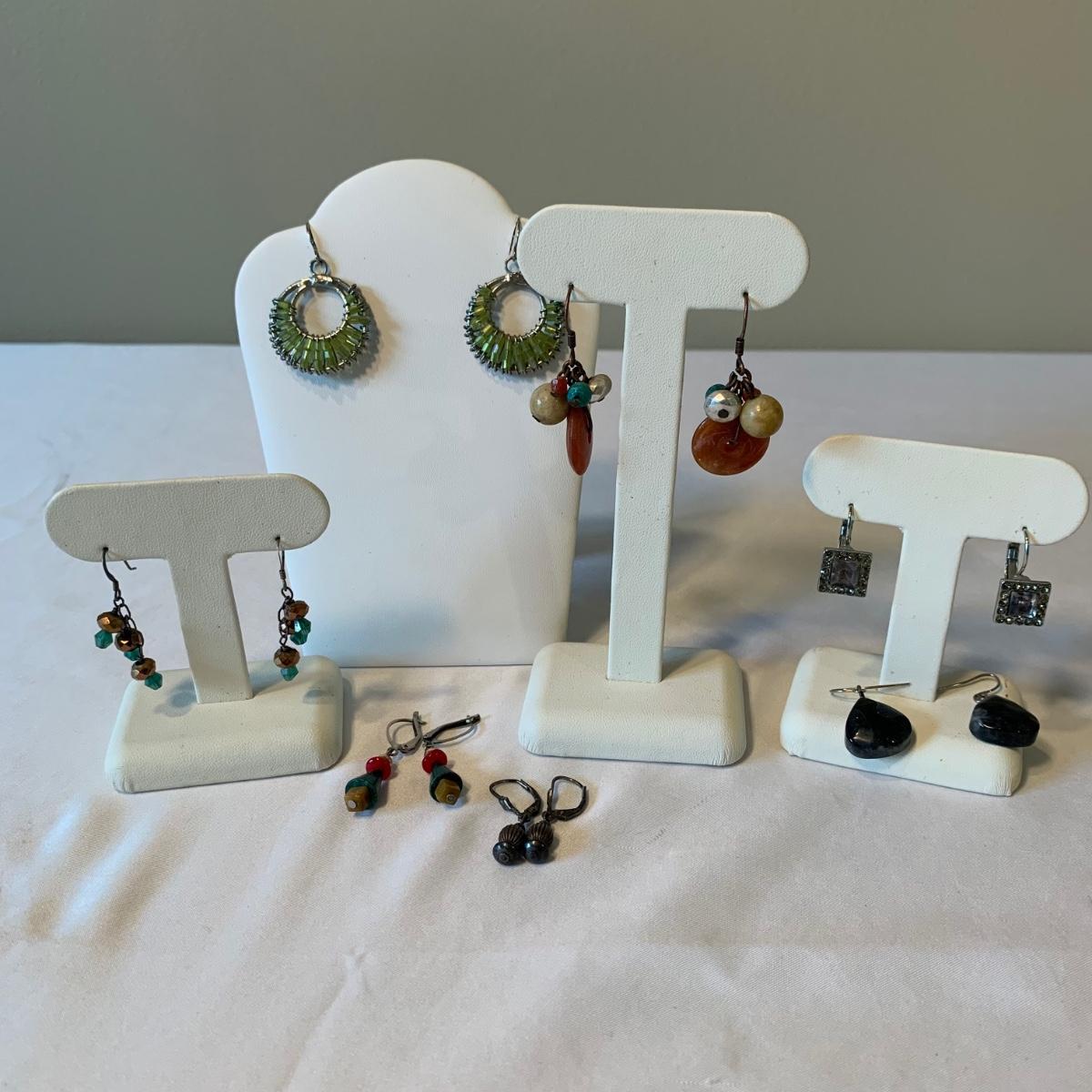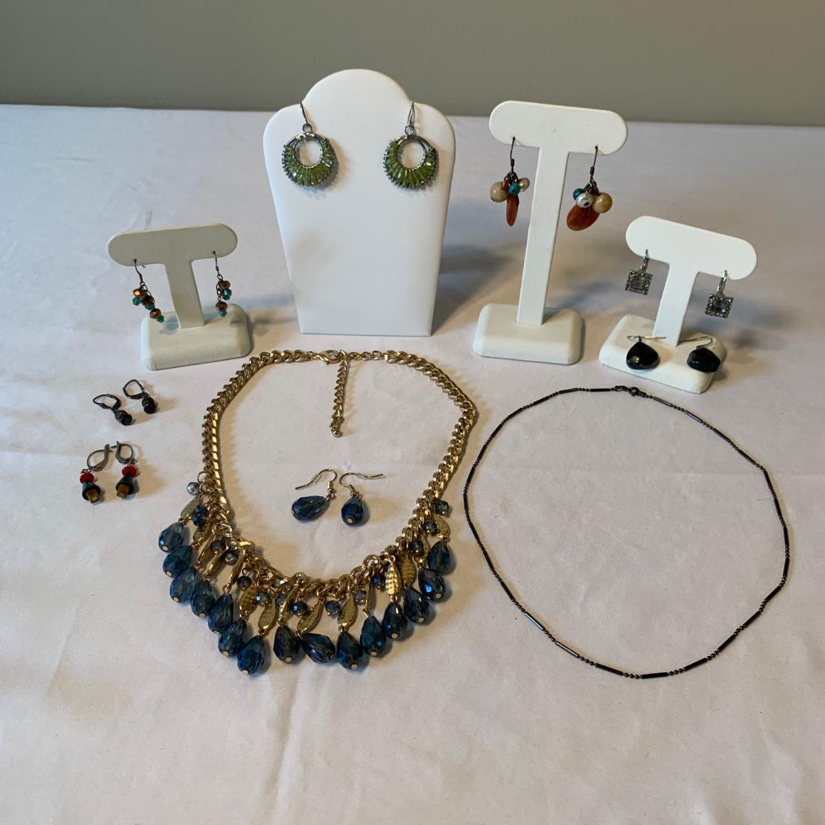 This collection has two beaded necklaces, one of which has a matching pair of earrings, as well as seven more pairs of beaded earrings for pierced ears (eight pairs of earrings total). Both necklaces are about 18” long. The clasp of one necklace is marked 925.
