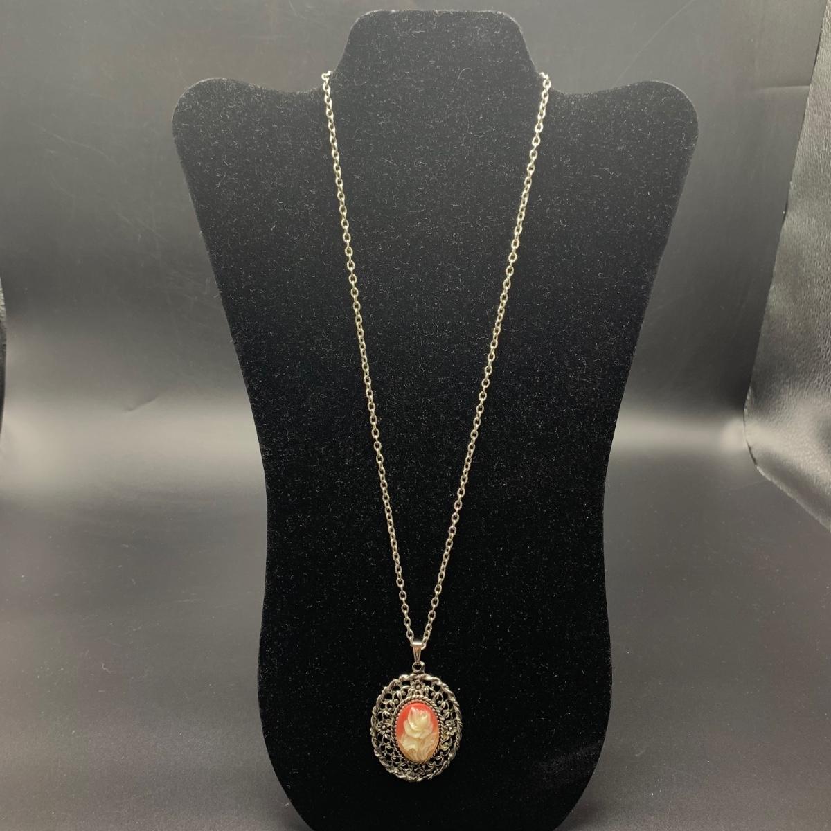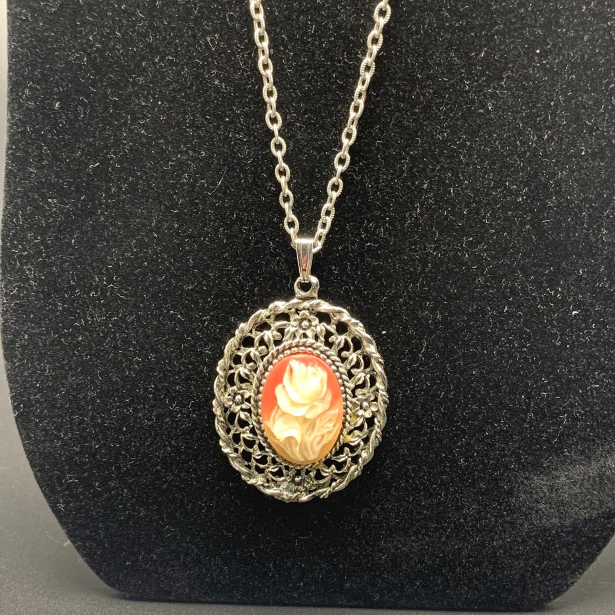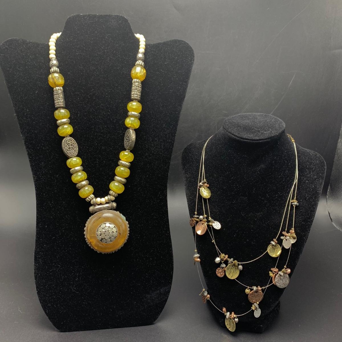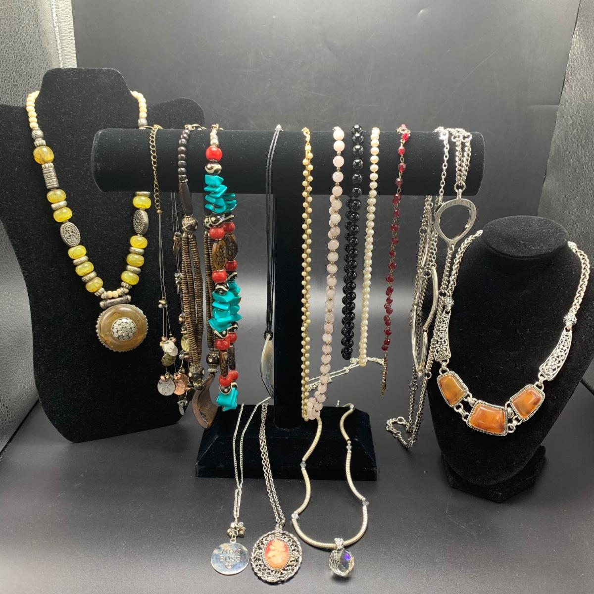 A variety of necklaces in many different colors, shapes, styles, sizes, and lengths. Some with wooden beads and pendants, some metal beads, some pearlescent beads. One cameo style pendant, one prism style pendant set in 925 Sterling. Lengths range from 16” to 38”. Shipping available.