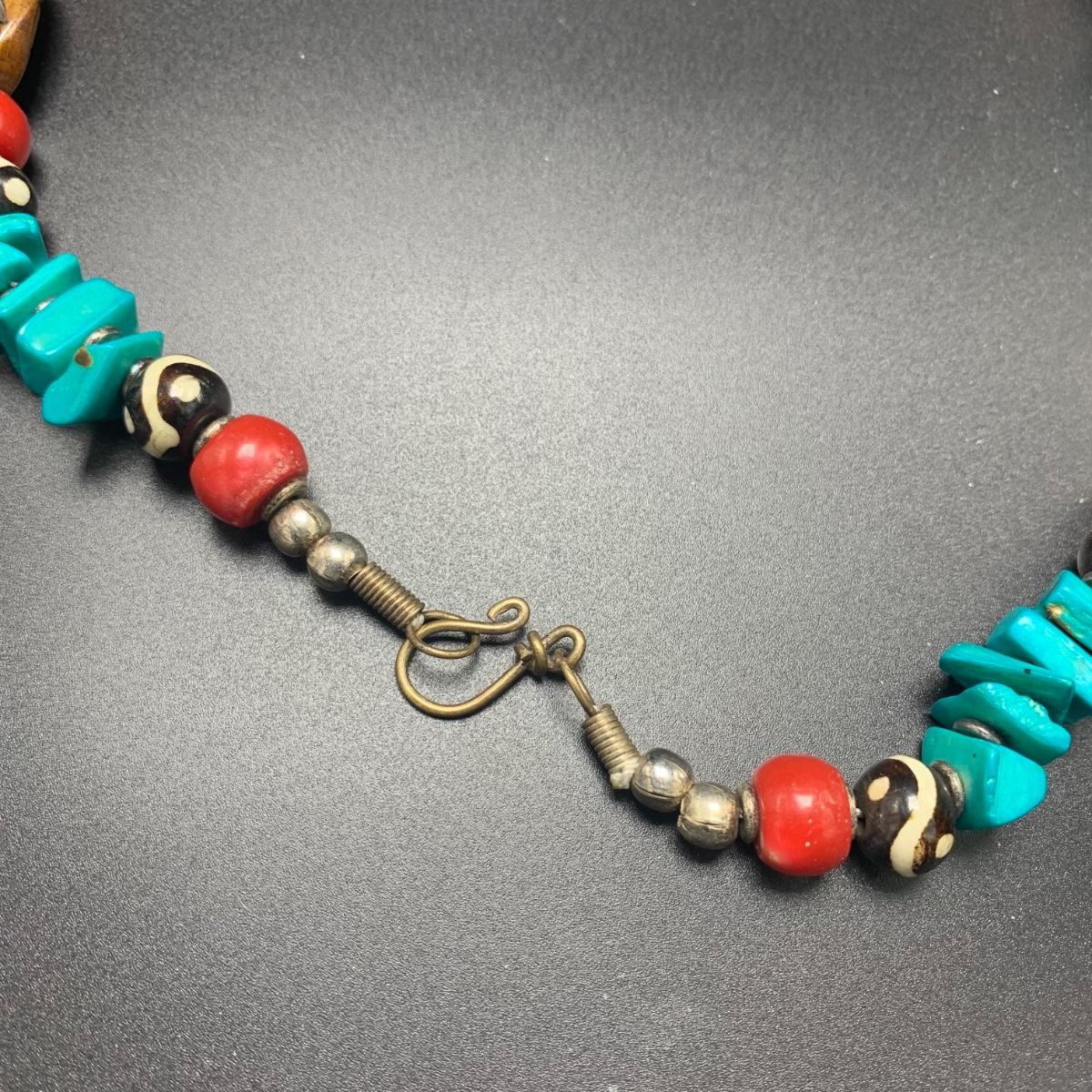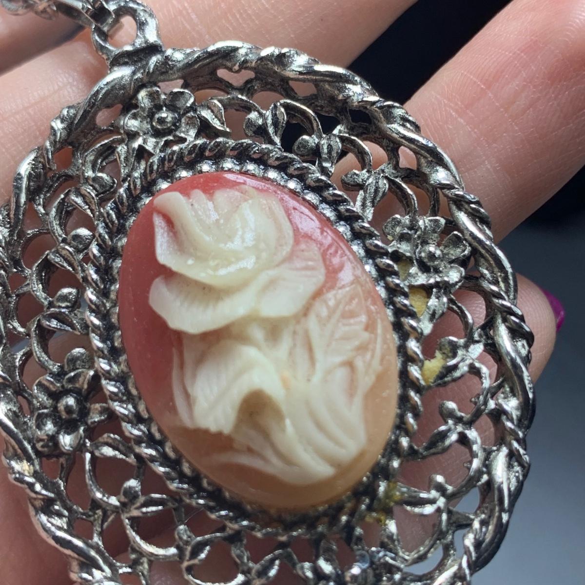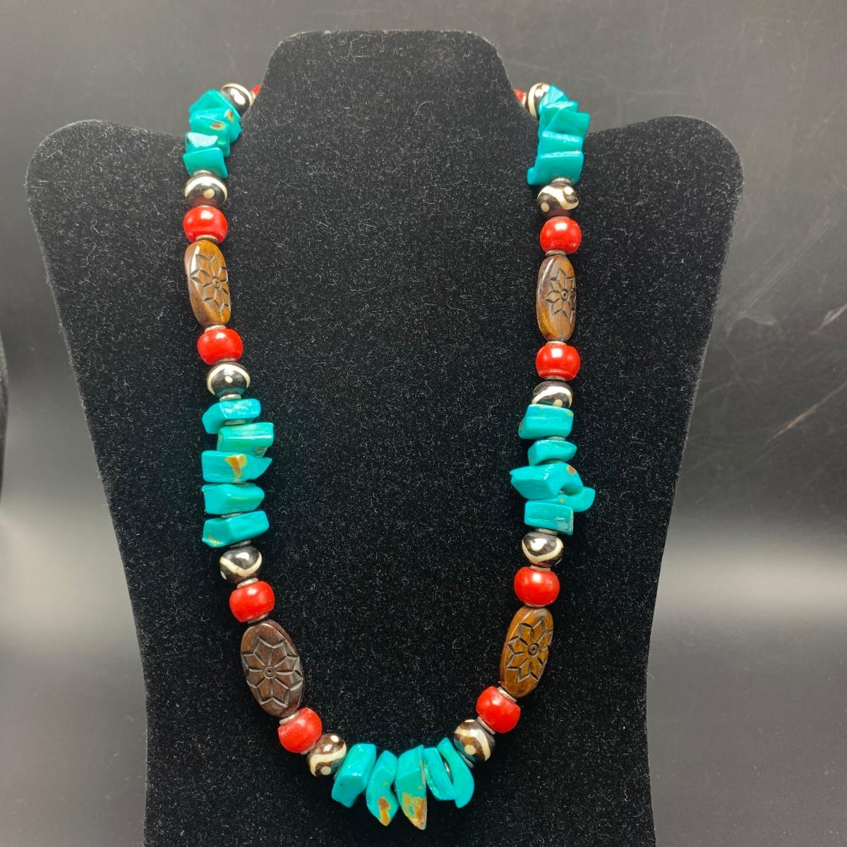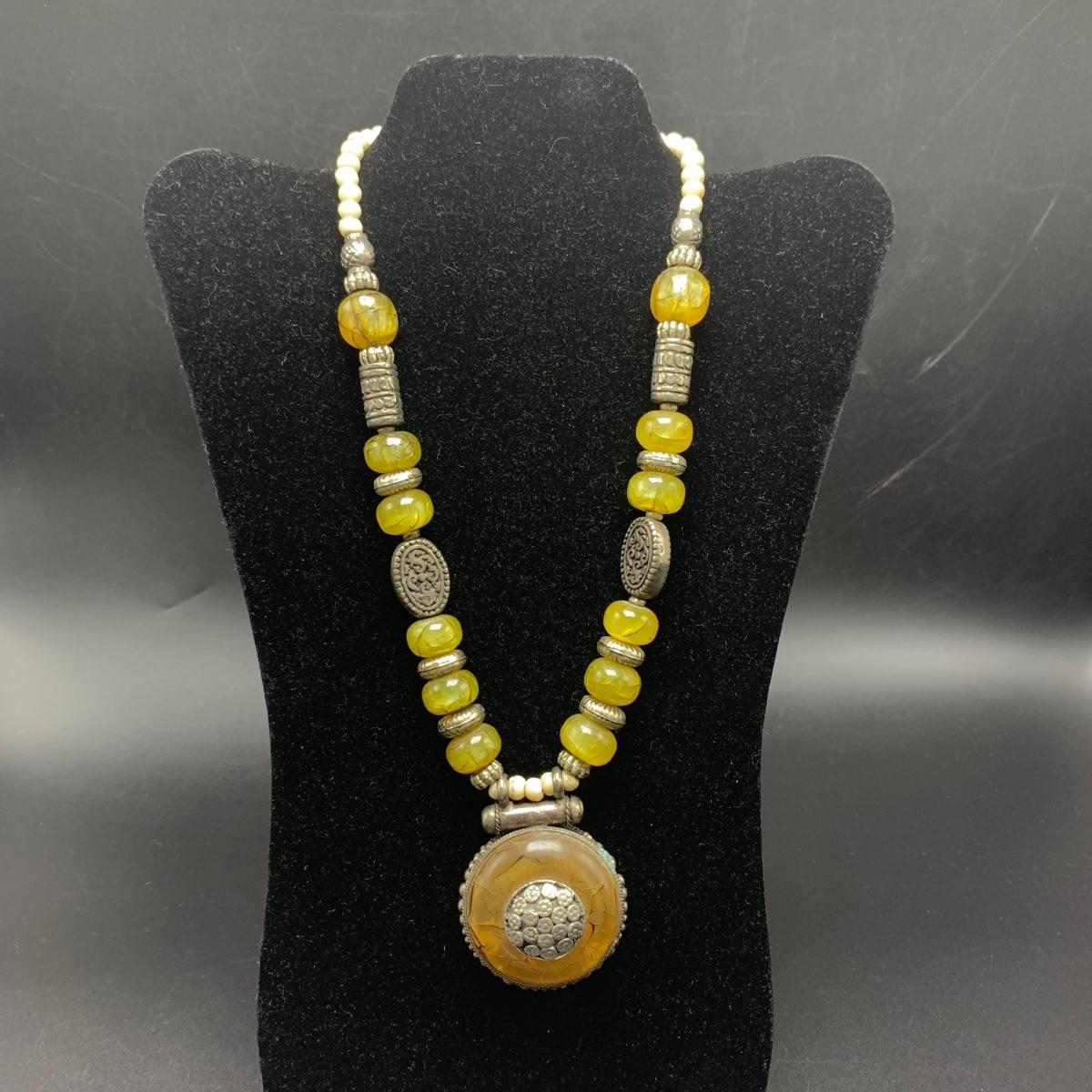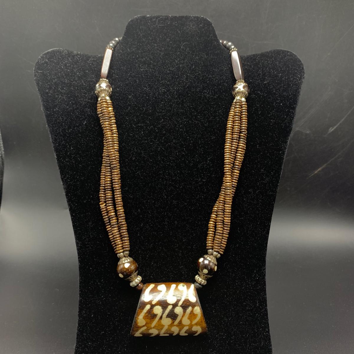 A variety of necklaces in many different colors, shapes, styles, sizes, and lengths. Some with wooden beads and pendants, some metal beads, some pearlescent beads. One cameo style pendant, one prism style pendant set in 925 Sterling. Lengths range from 16” to 38”. Shipping available.