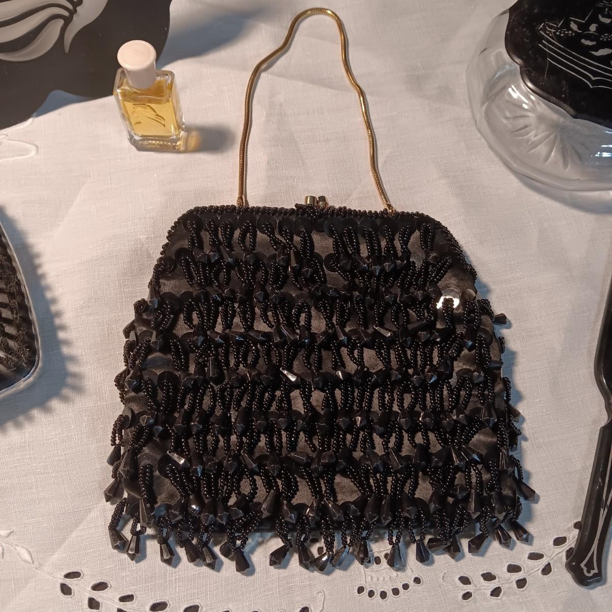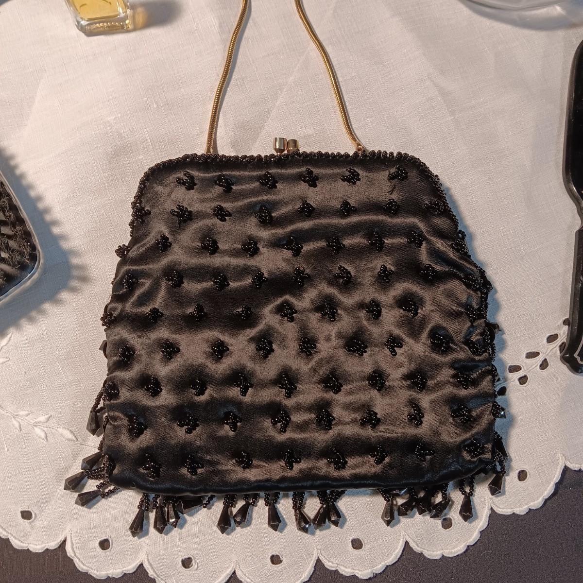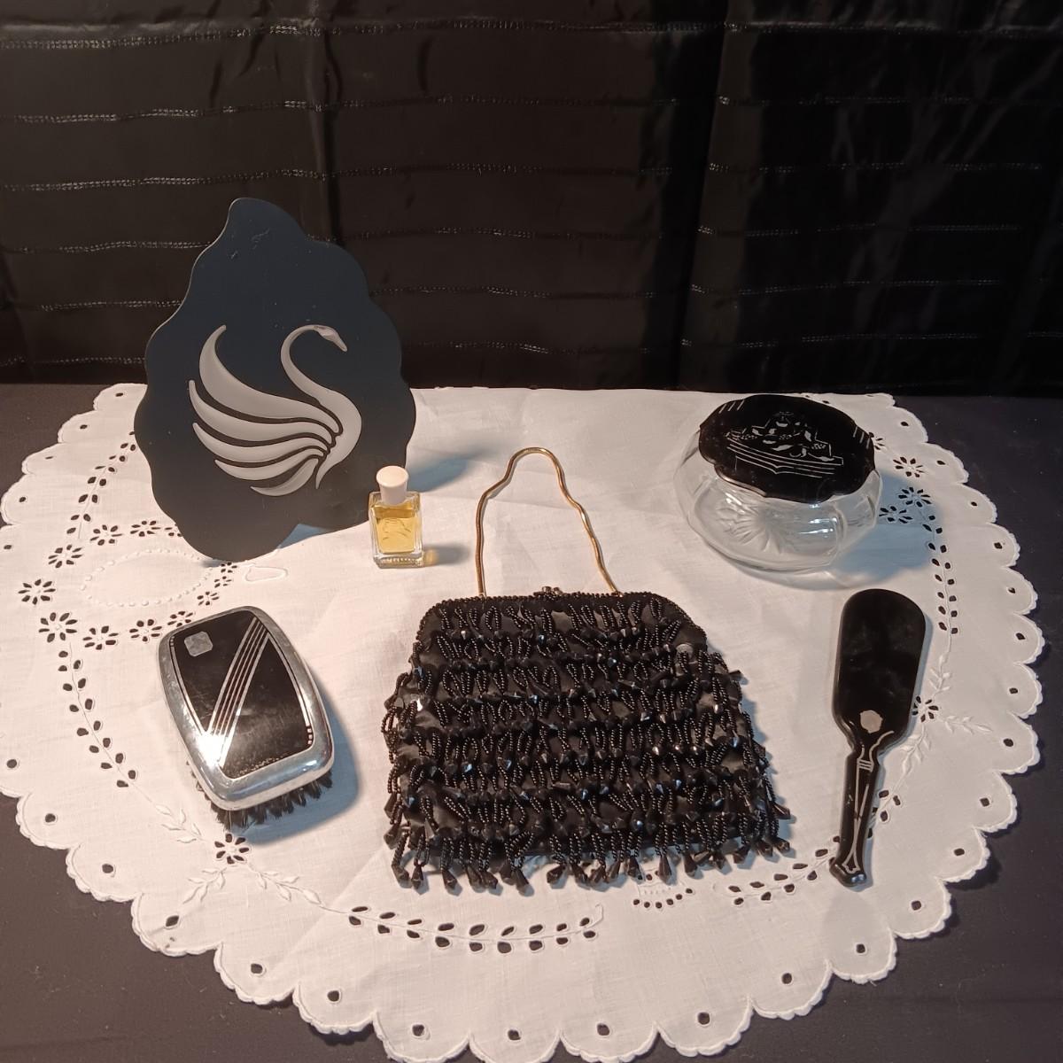 BEADED PURSE, HAND BRUSH, SHOE HORN, COTTON BALL BOWL AND SWAN CANDLE HOLDER