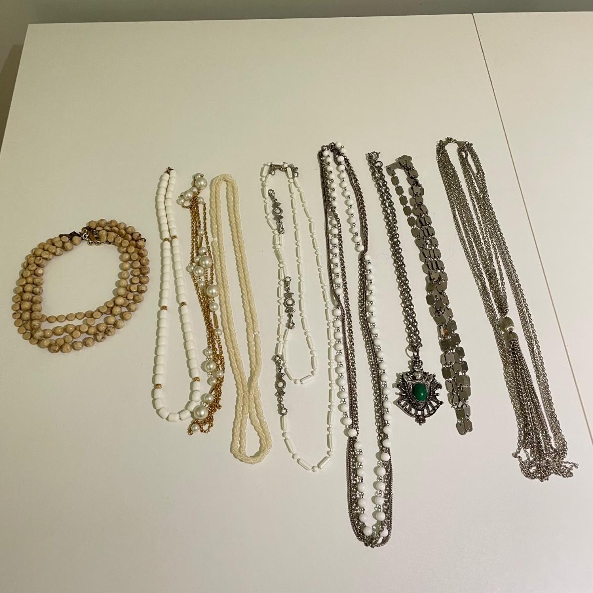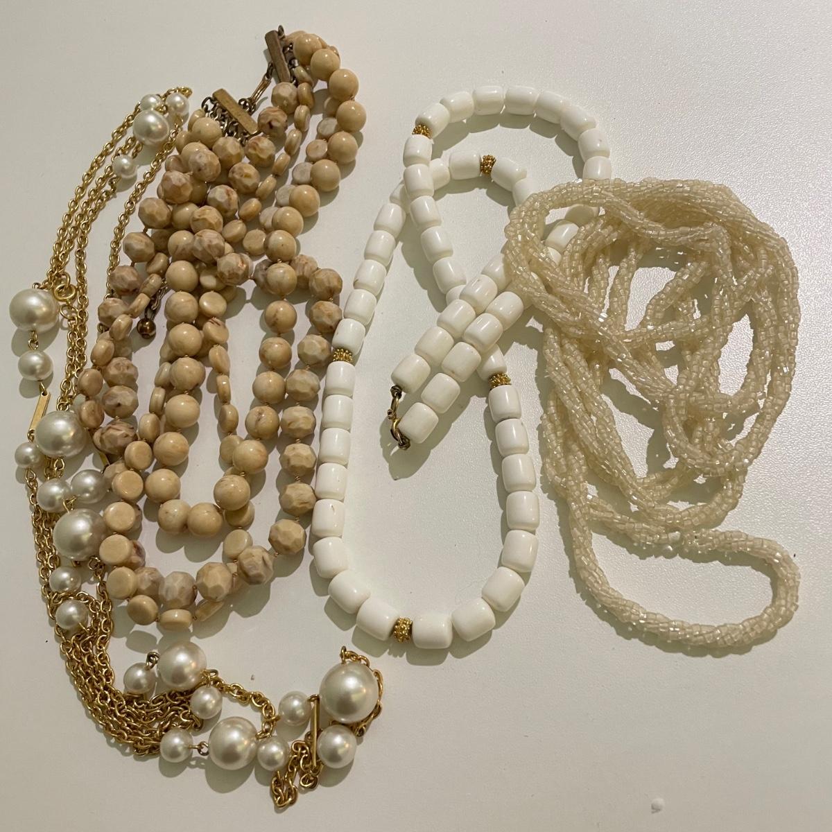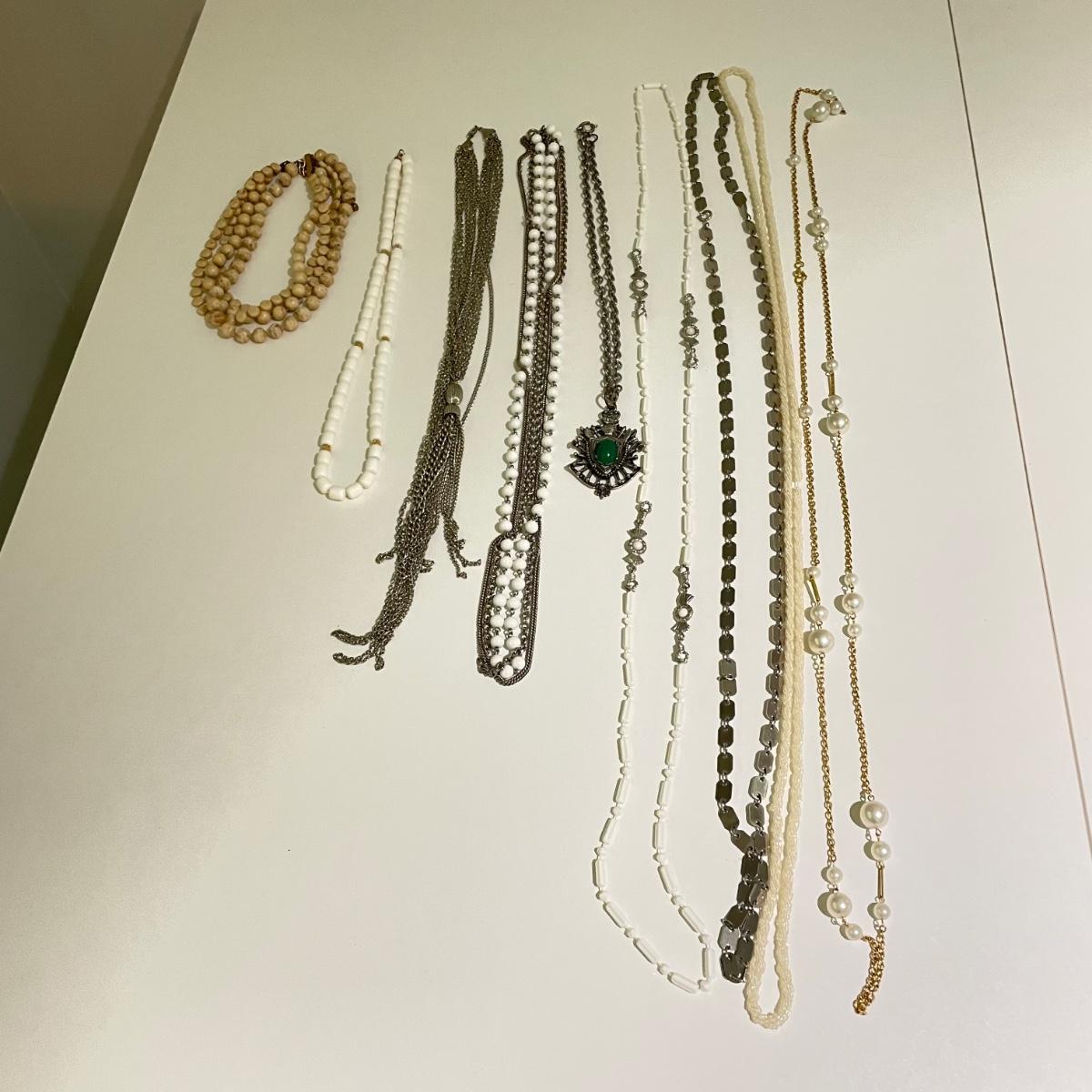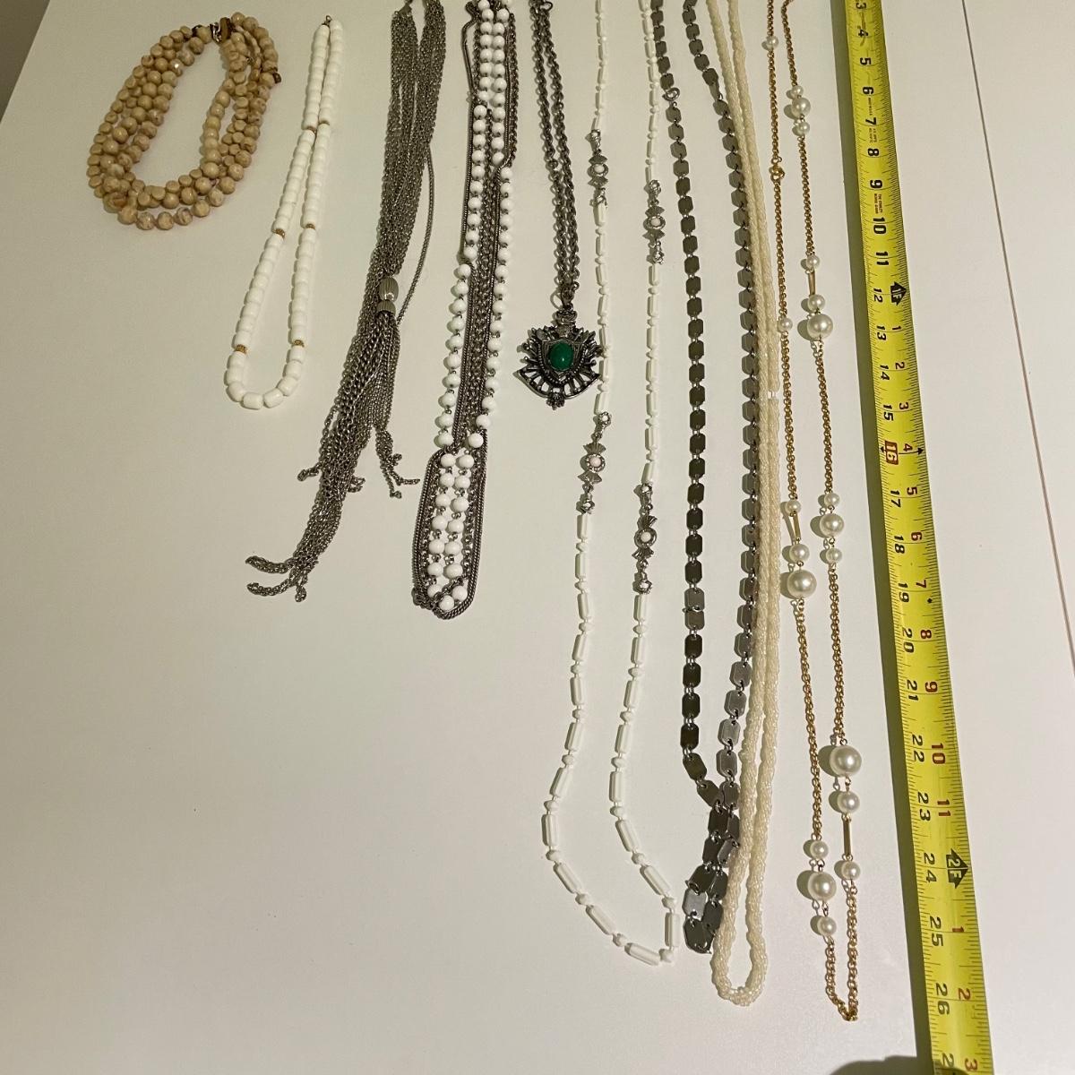 Nine nice necklaces ranging from 26” to 14”. Some have pearly beads and some are resin or possibly stone. Four are meant to be layered. See images. Shipping available.