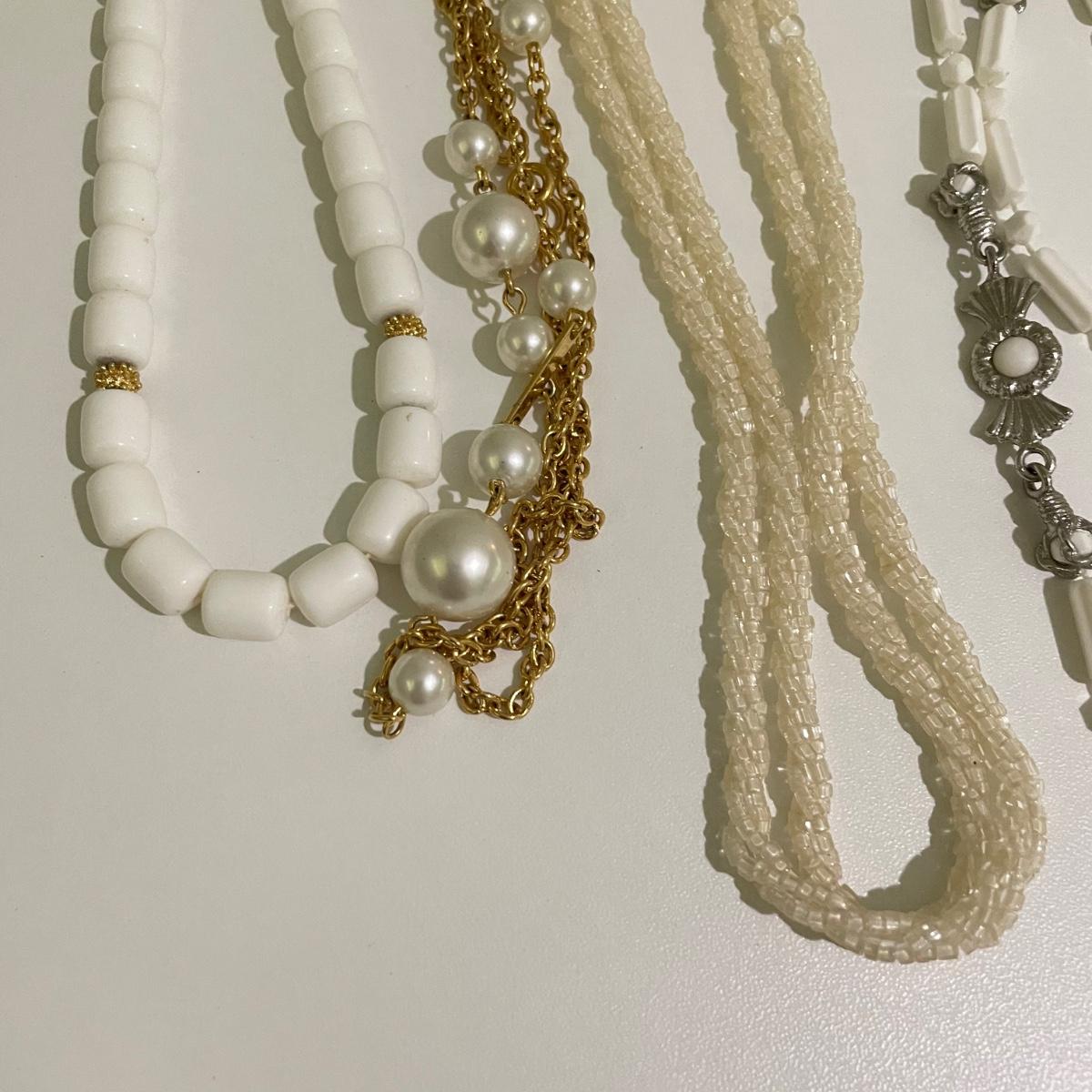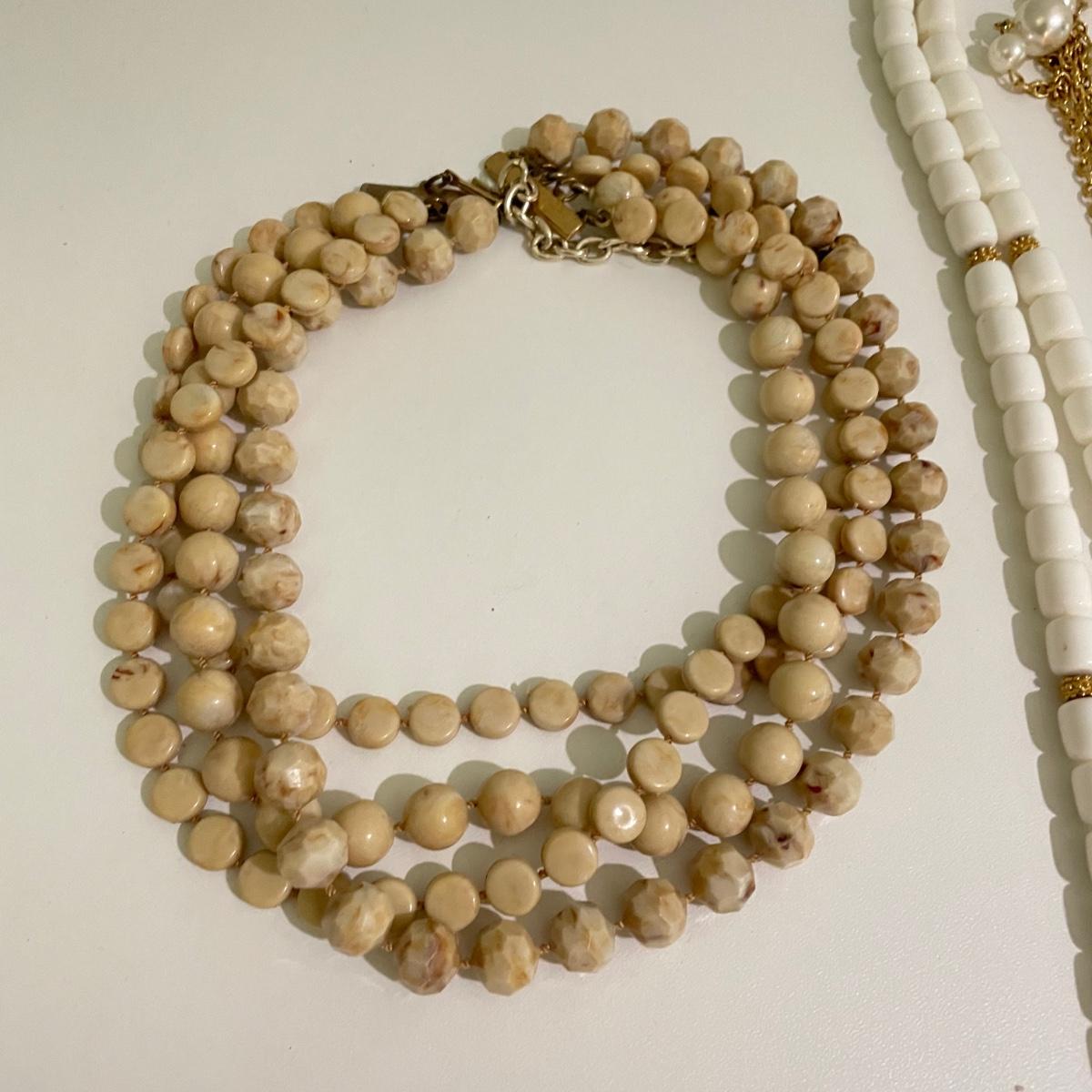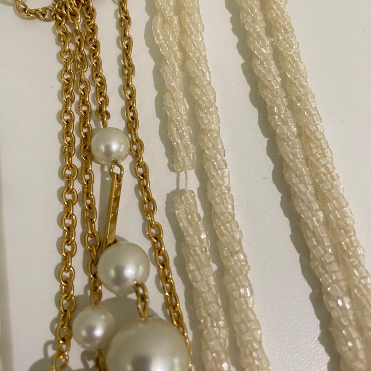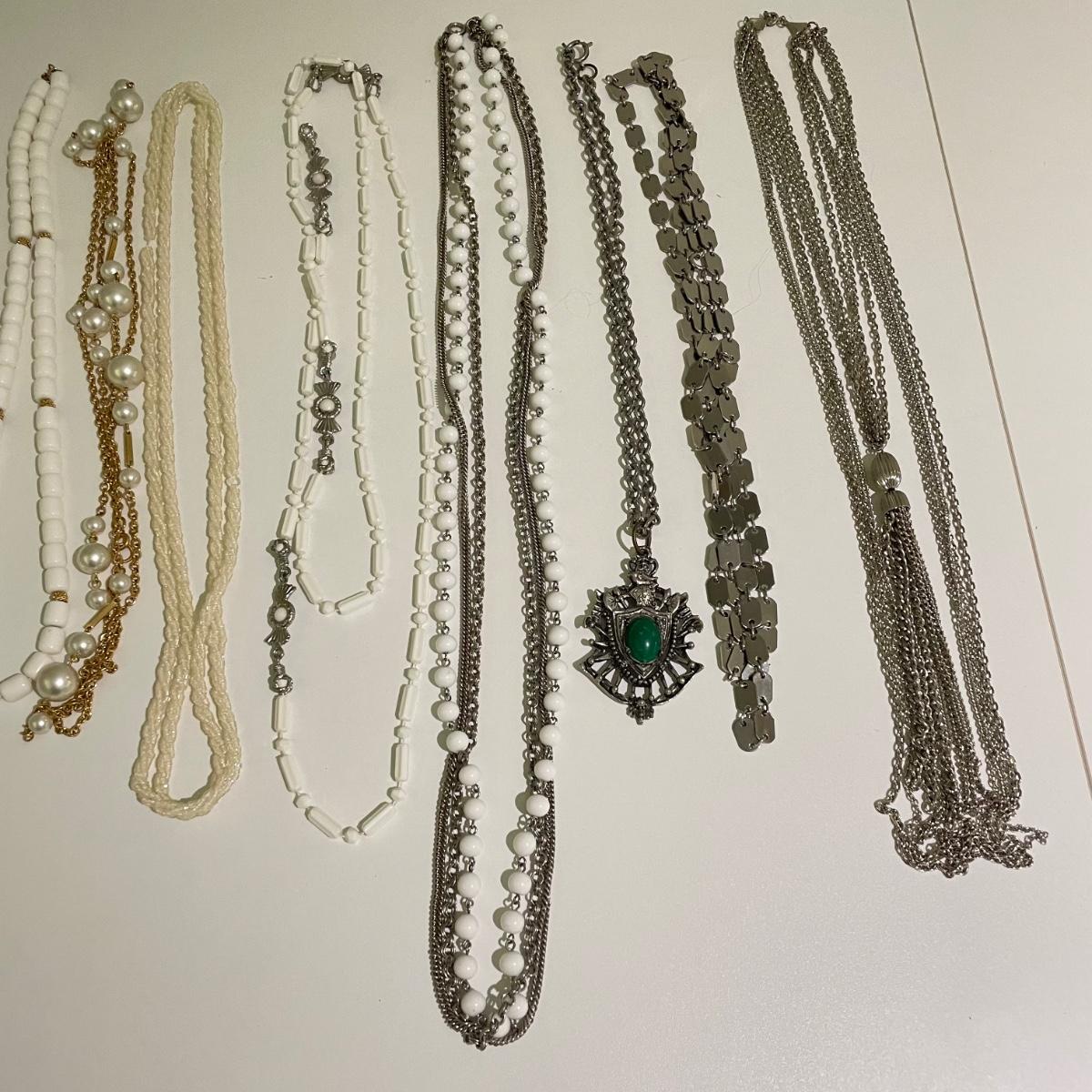 Nine nice necklaces ranging from 26” to 14”. Some have pearly beads and some are resin or possibly stone. Four are meant to be layered. See images. Shipping available.