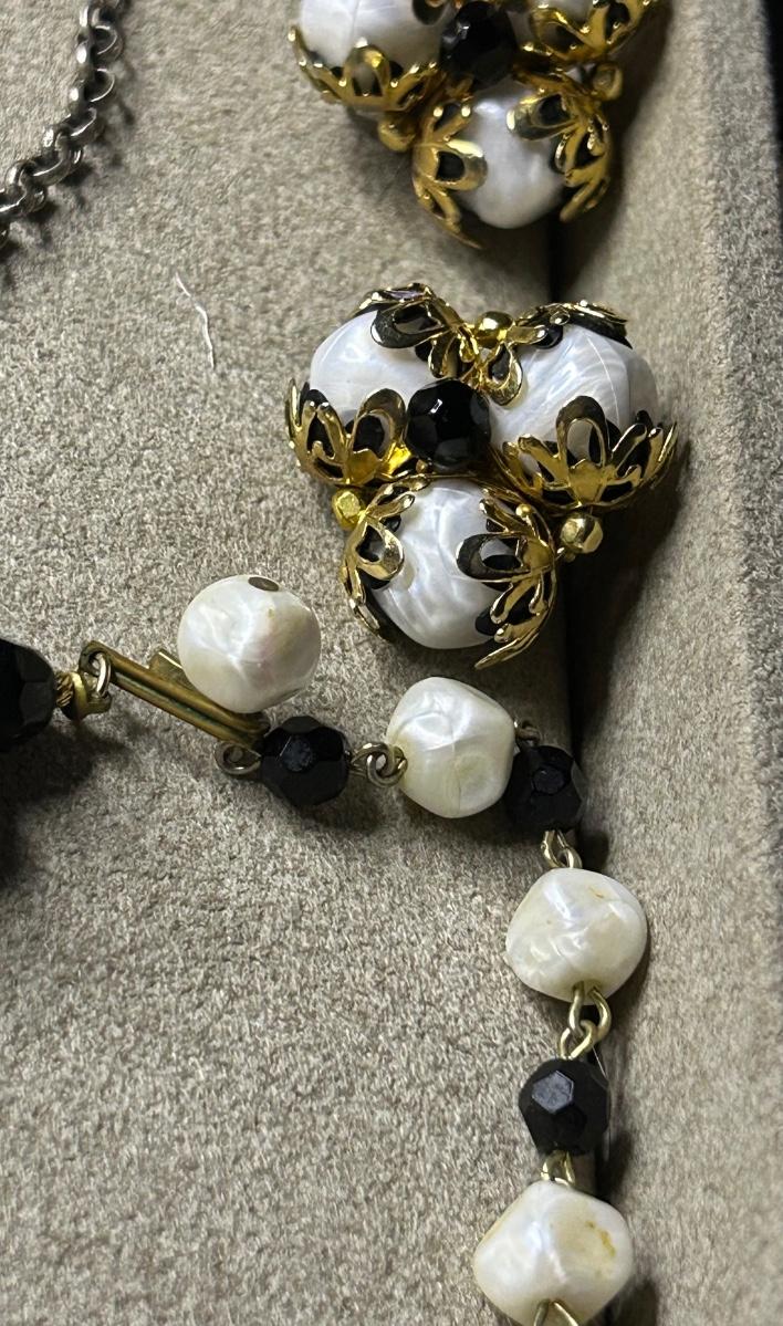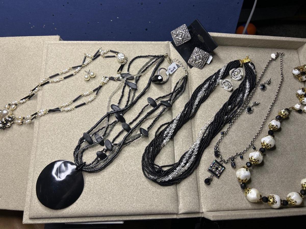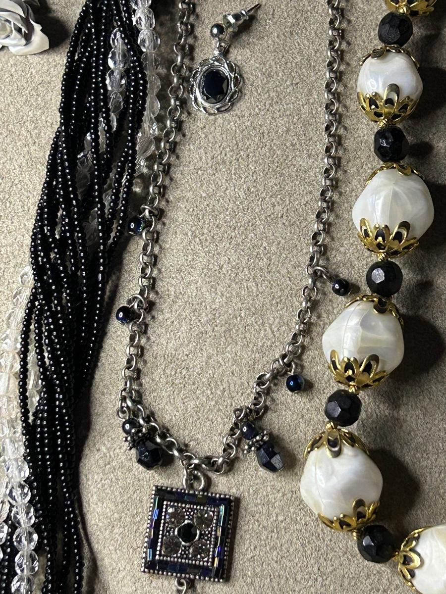 5 sets of earrings & necklaces & 1 adorable Kendra Scott rings 2 pair are clip ons & other 3 are pierced. The necklace w/ the rose earrings is Sarah Coventry, the black shell necklace is Coldwater Creek.