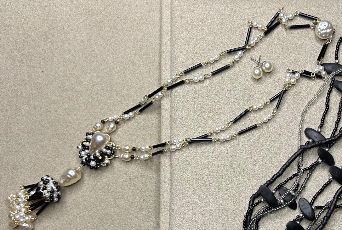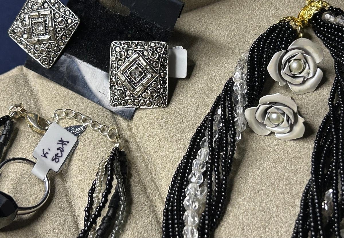 5 sets of earrings & necklaces & 1 adorable Kendra Scott rings 2 pair are clip ons & other 3 are pierced. The necklace w/ the rose earrings is Sarah Coventry, the black shell necklace is Coldwater Creek.