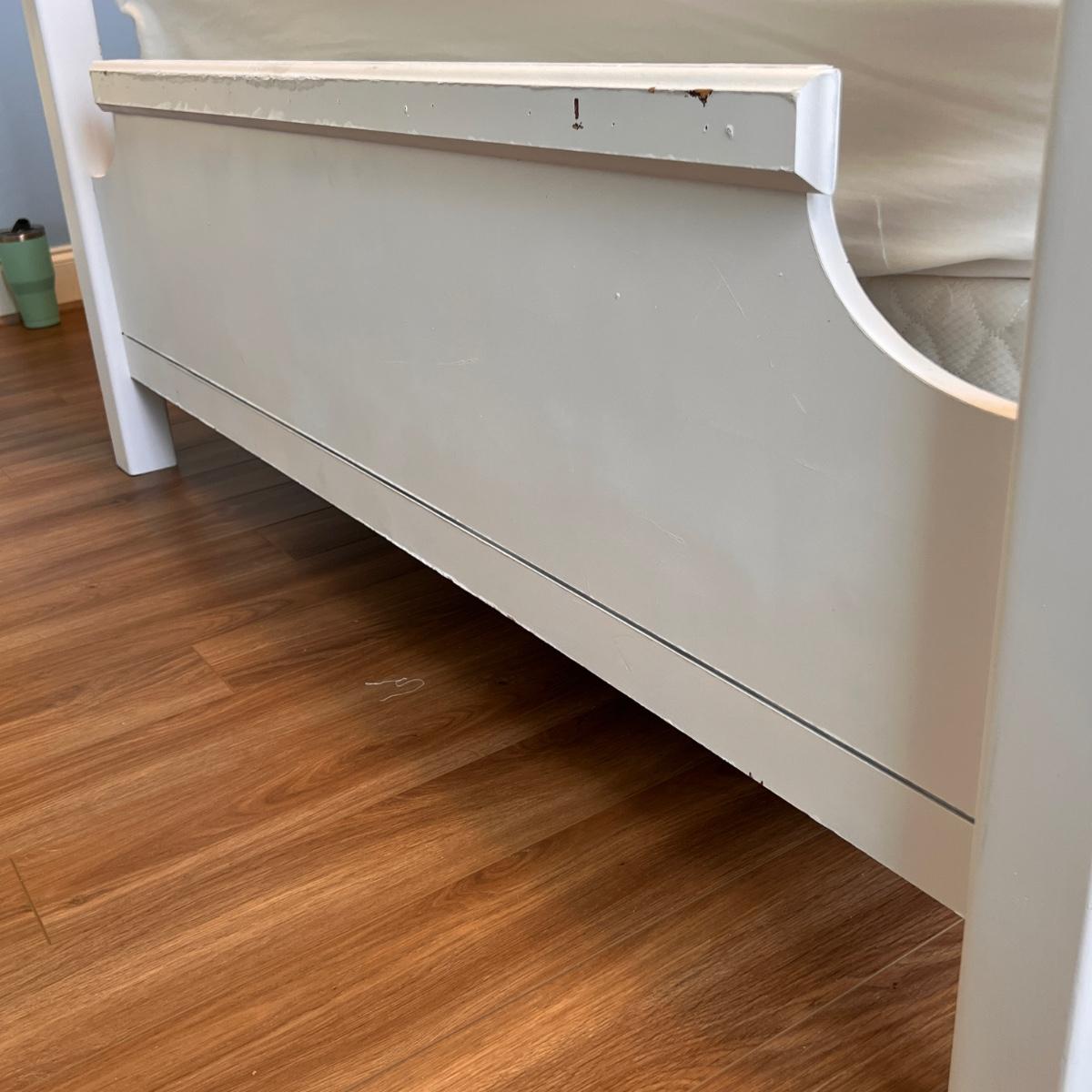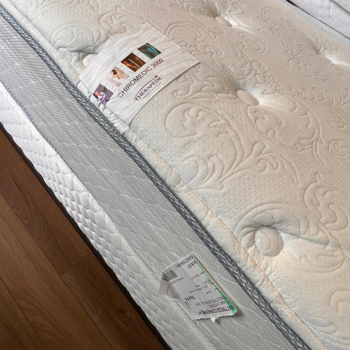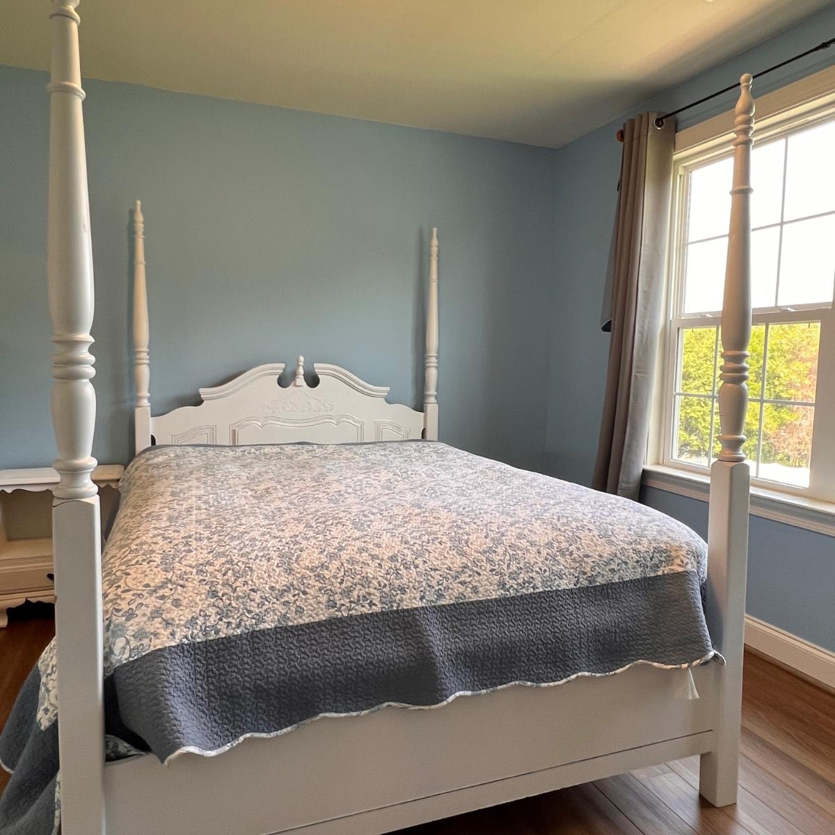 Painted white solid wood 4 poster bedframe with like new Queen Chiromedic 3000 Plush mattress and box Spring. Linens not included. In good used condition. Wood shows some scratches as shown in pics.