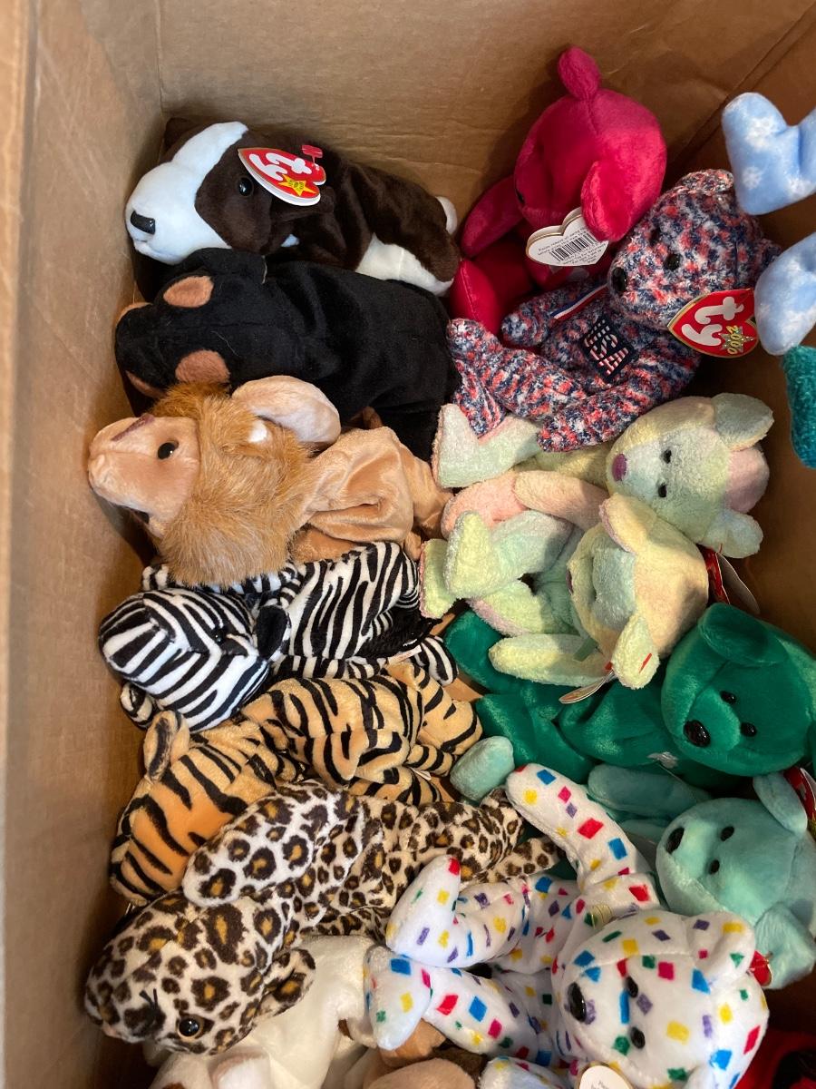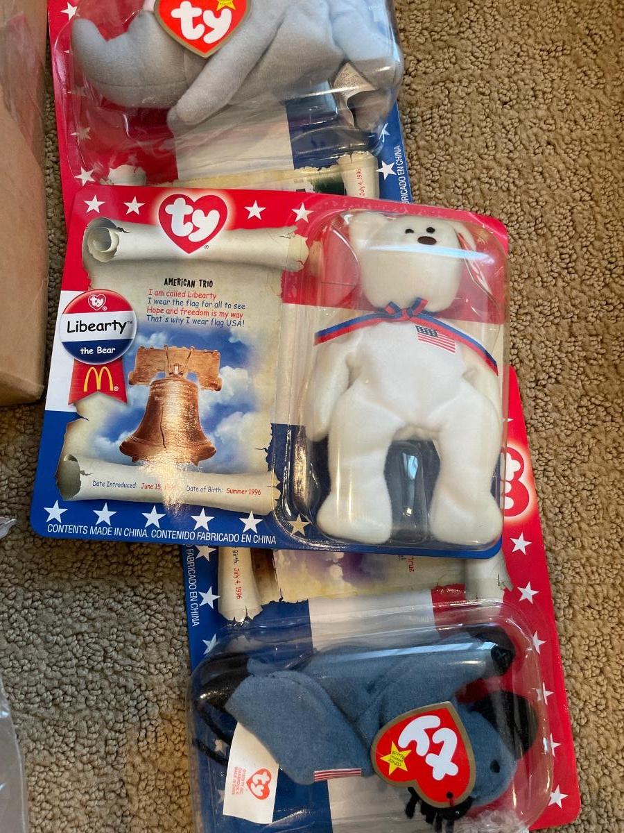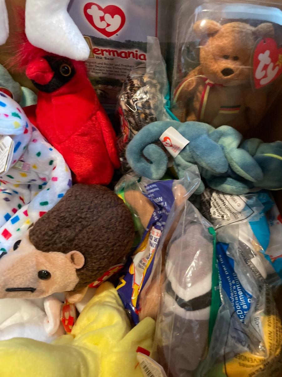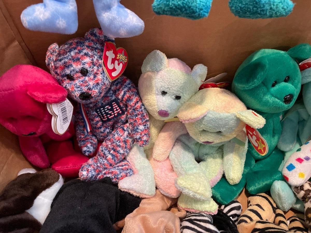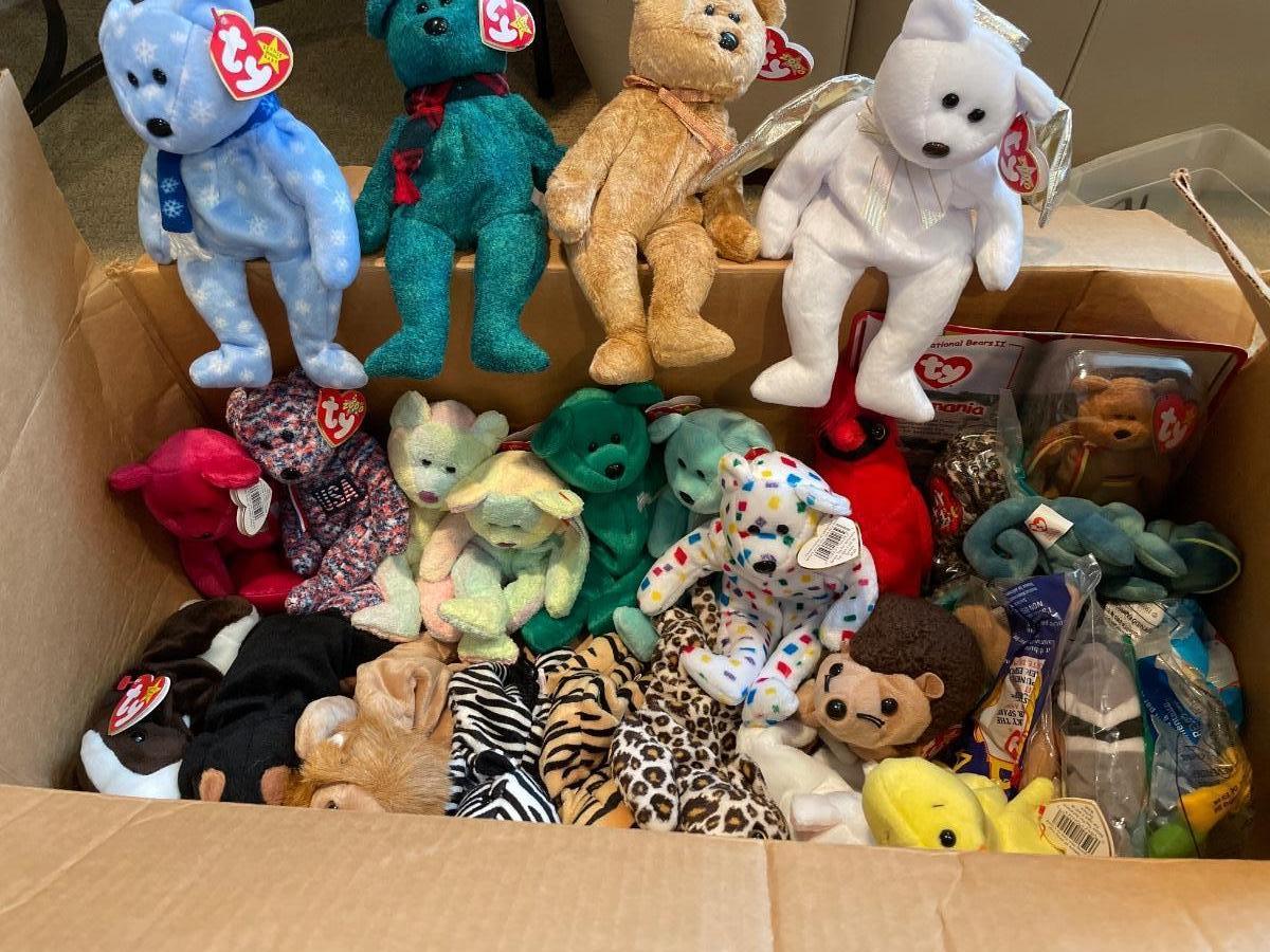 Box of multiple bear beanies and McDonald’s beanies. All were in plastic bags