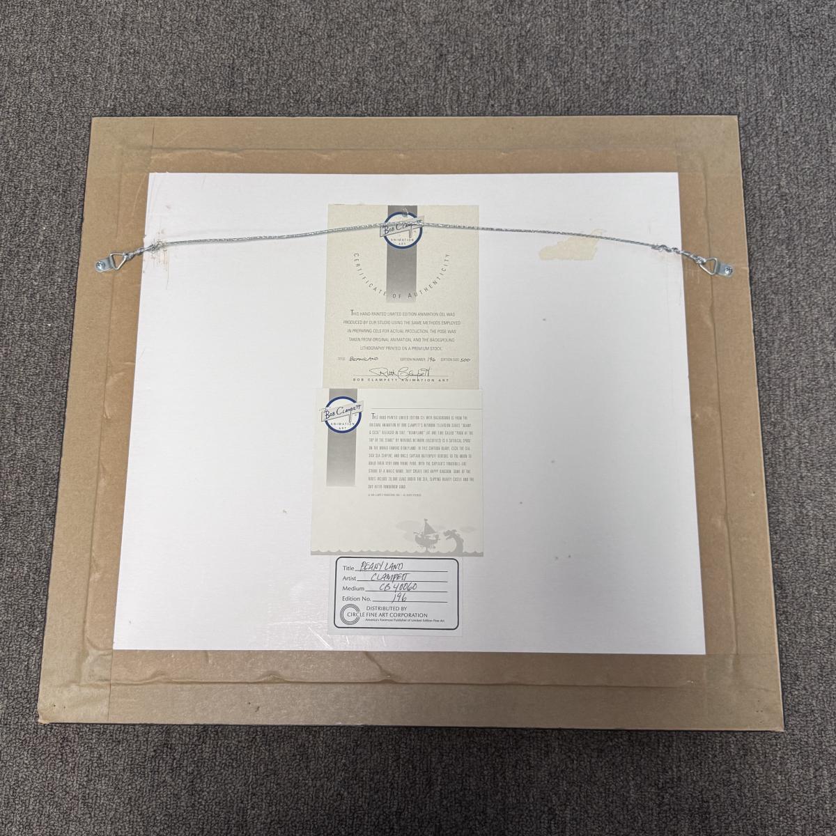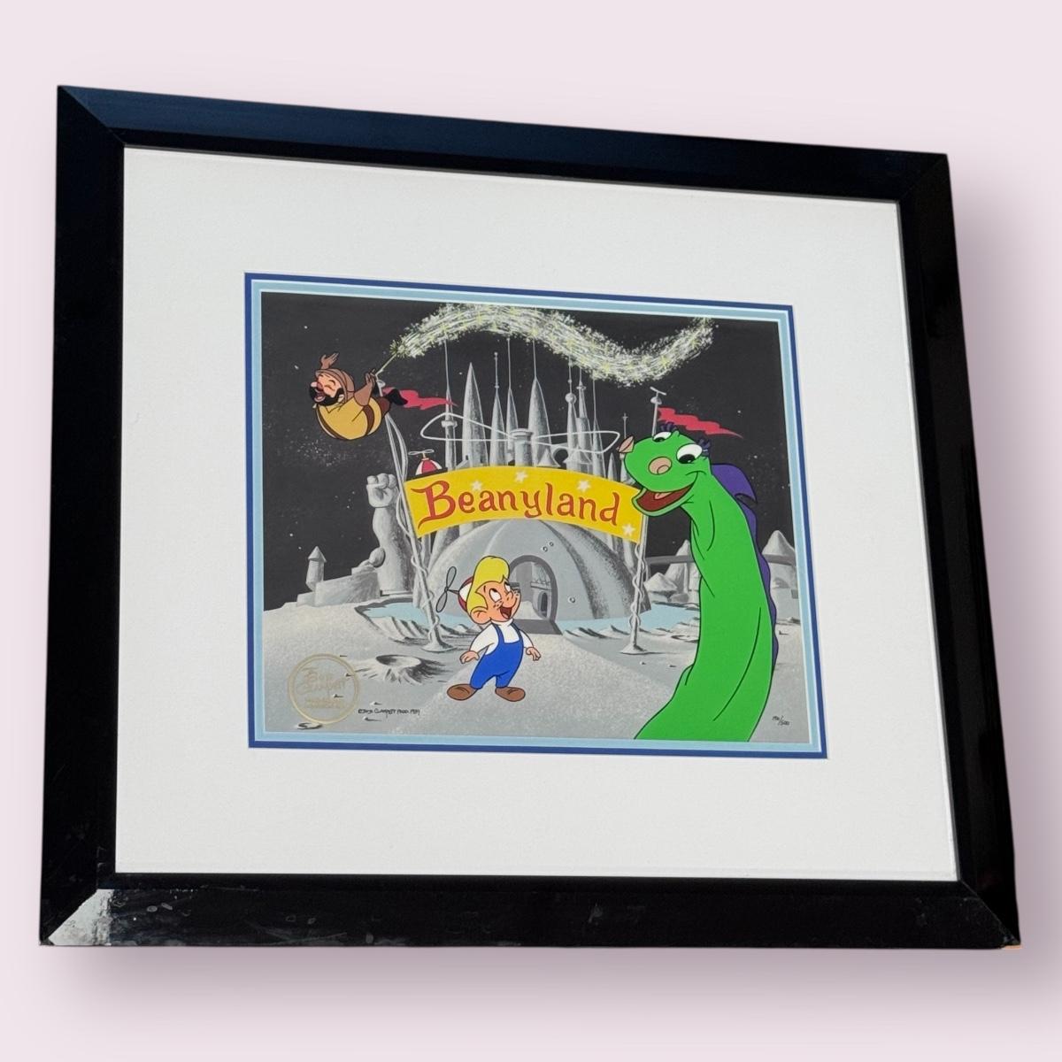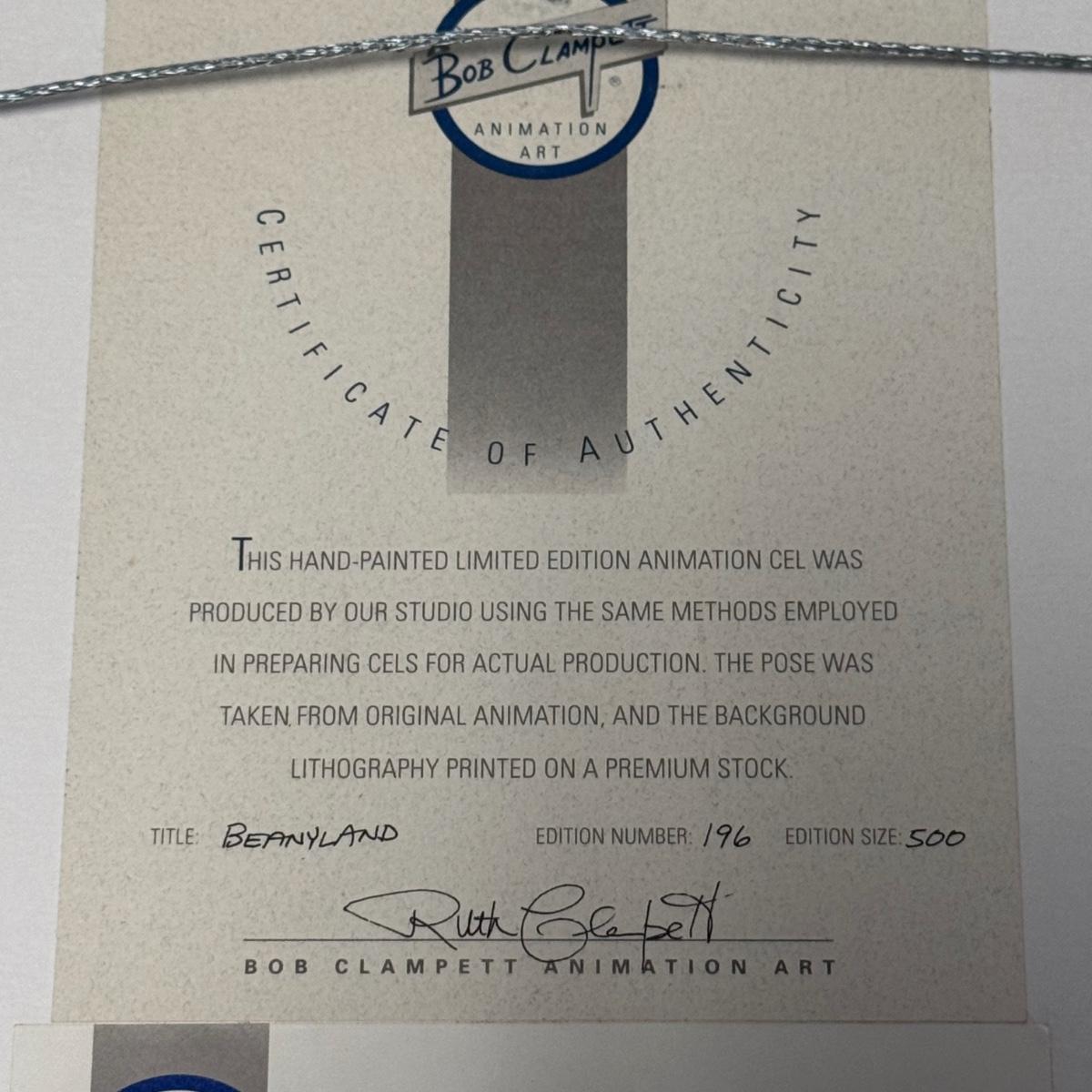 This lot includes one framed cel titled “Beanyland” by Bob Clampett Animation Art. The art is numbered 196/500 and signed and stamped by Bob Clampett. The art is protected with a plastic layer, triple matting, and a wooden frame with a black gloss painted over. The frame measures 21” x 19”H. The original invoice and certificate of authenticity is included - see last few photos.