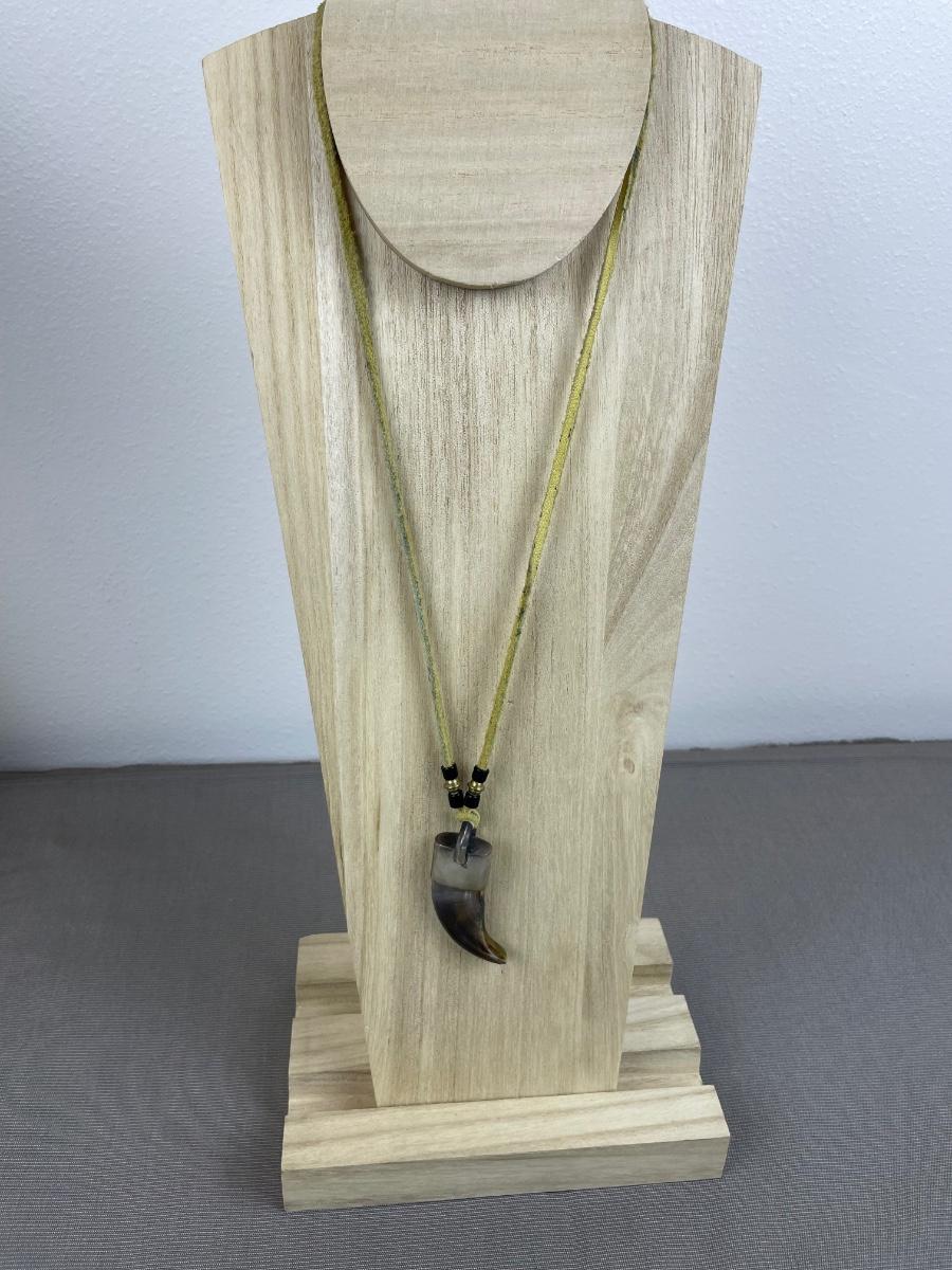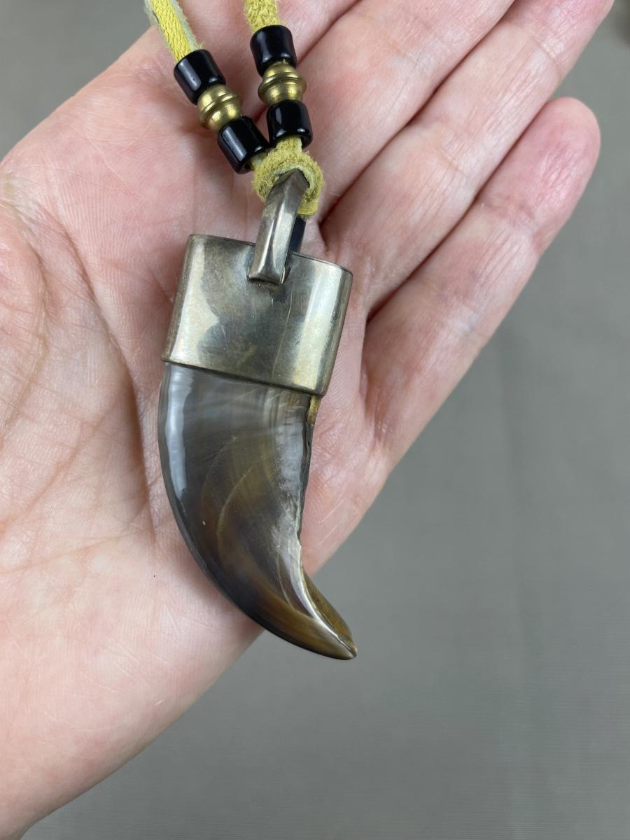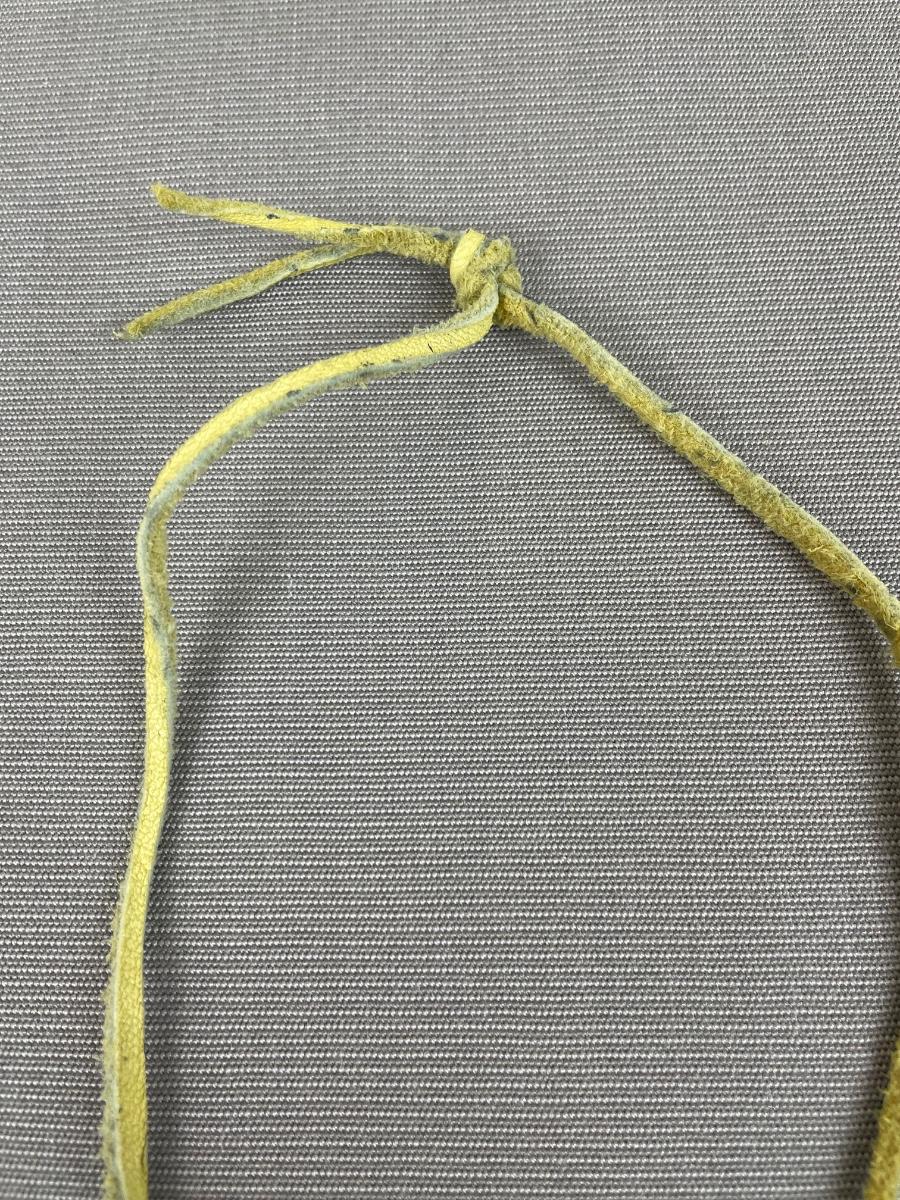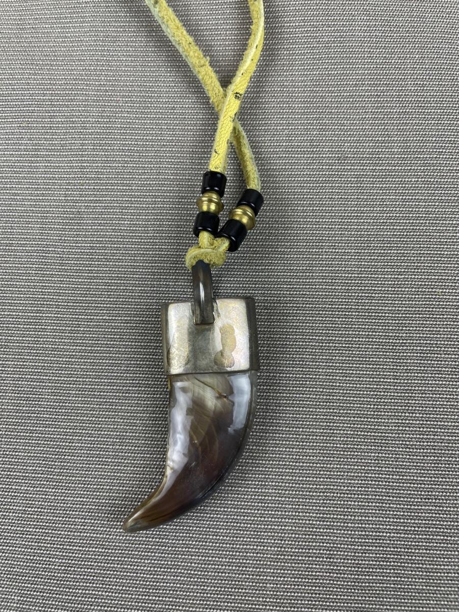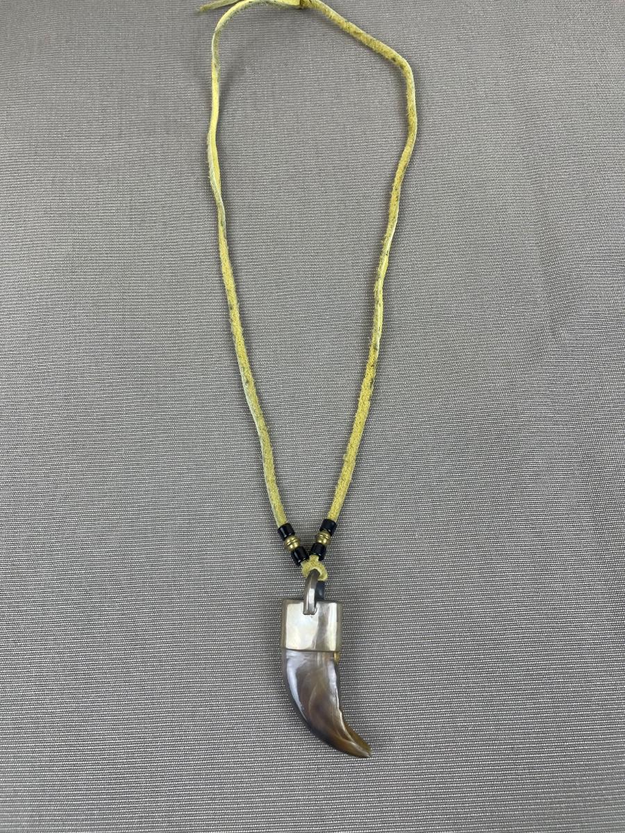 26 inch buckskin necklace with 2 1/2 inch pendant. Unknown metal.