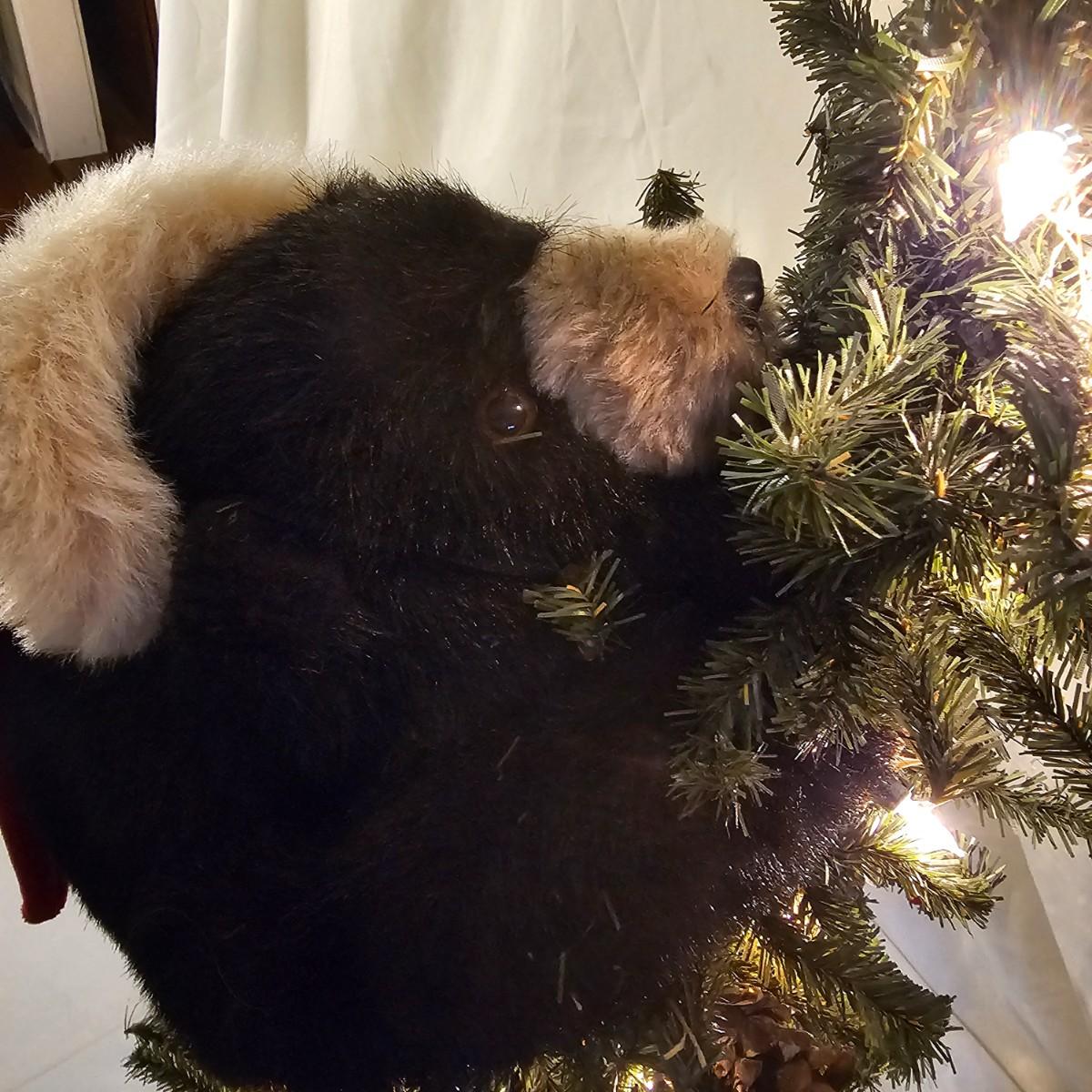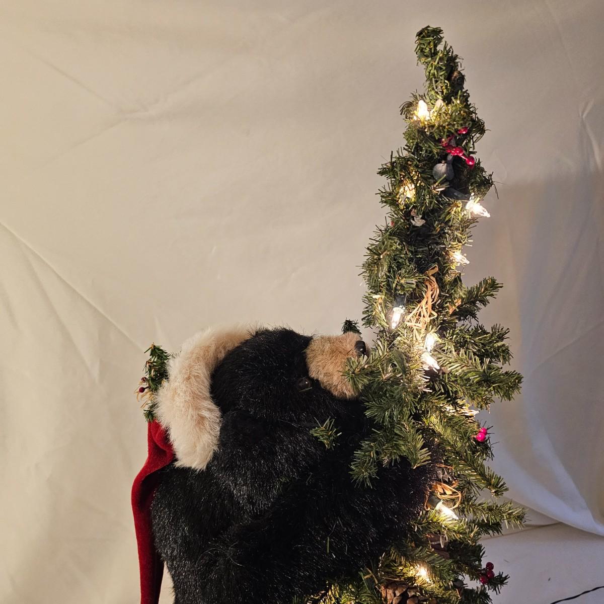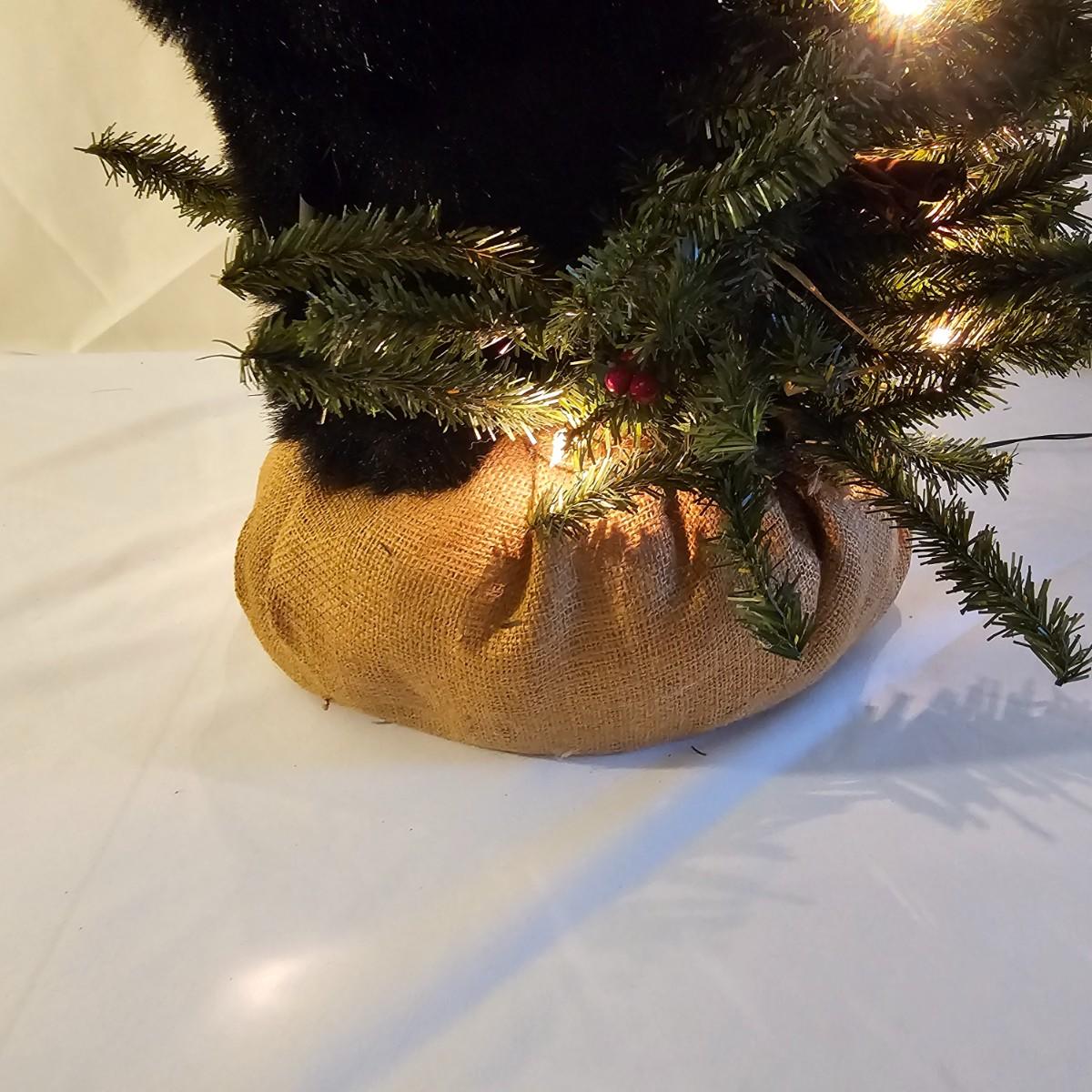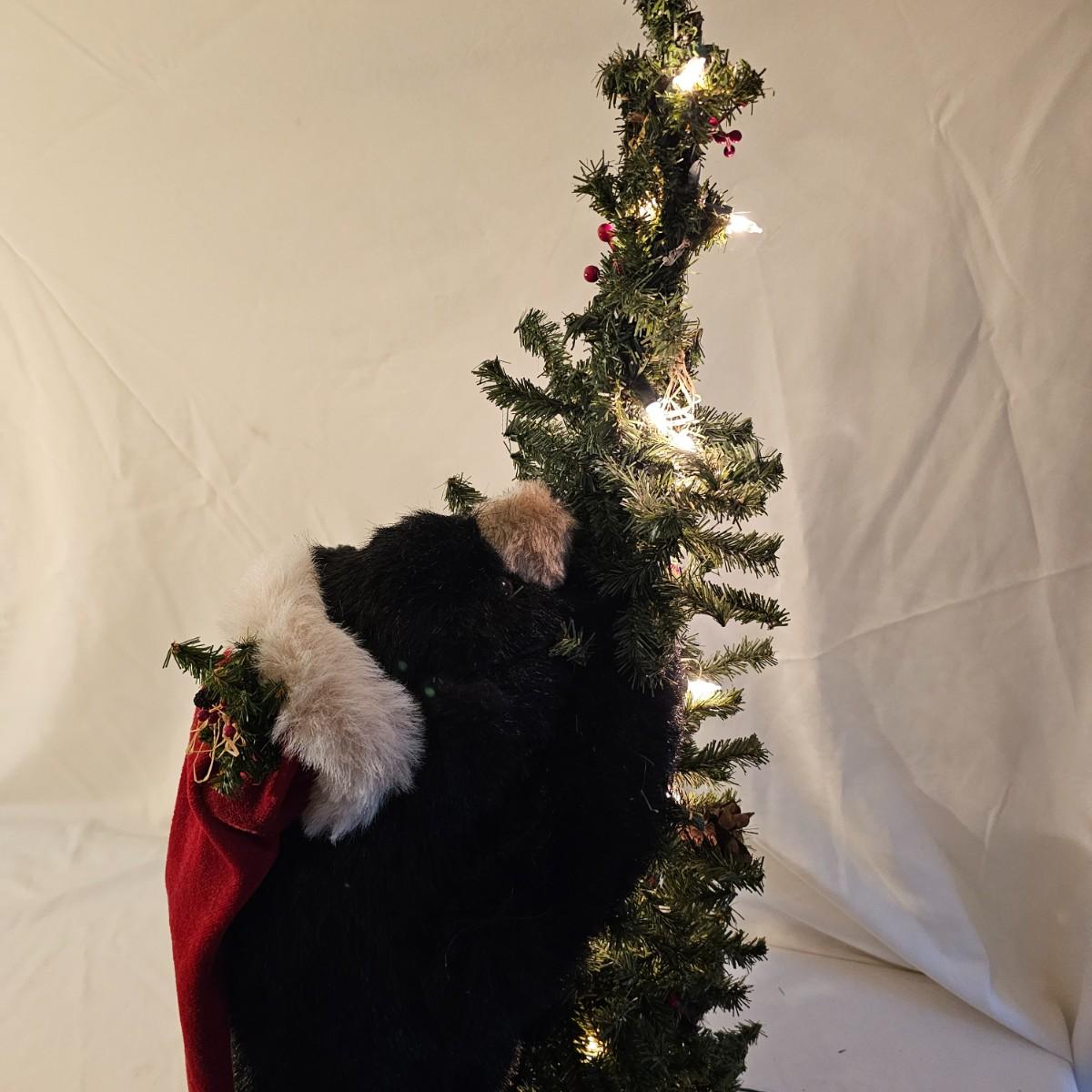 An adorable little black bear making his way up the Christmas tree. Lighted tree has a wrapped burlap base, measures 15" x 18" x 41"H. Also includes several sets of lights, three white incandescent strands, one older C-7 set, few bulbs out. Also a set of lighted candles, some lights out. Four battery operated sets of mini LED's. See photos for details. Shipping available.