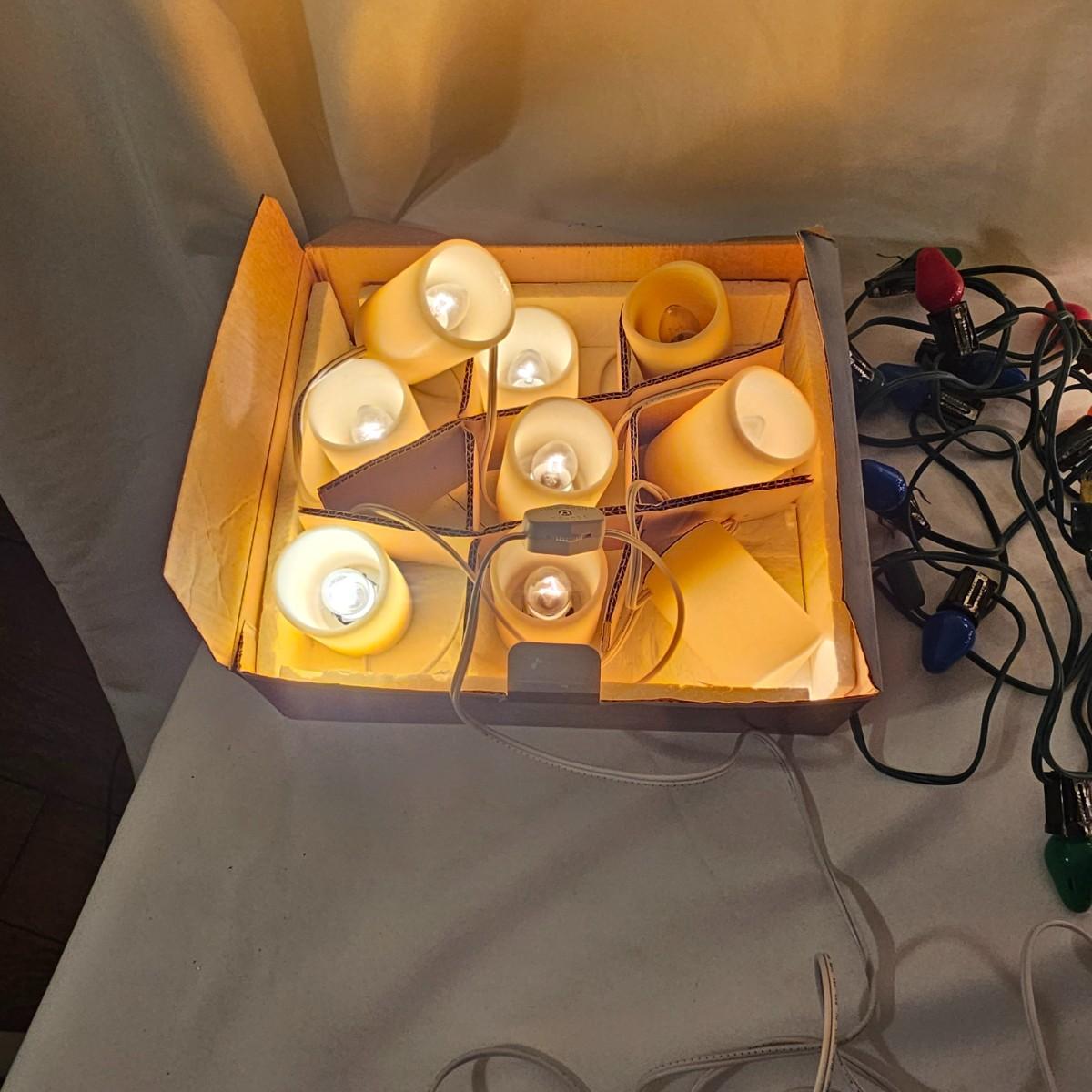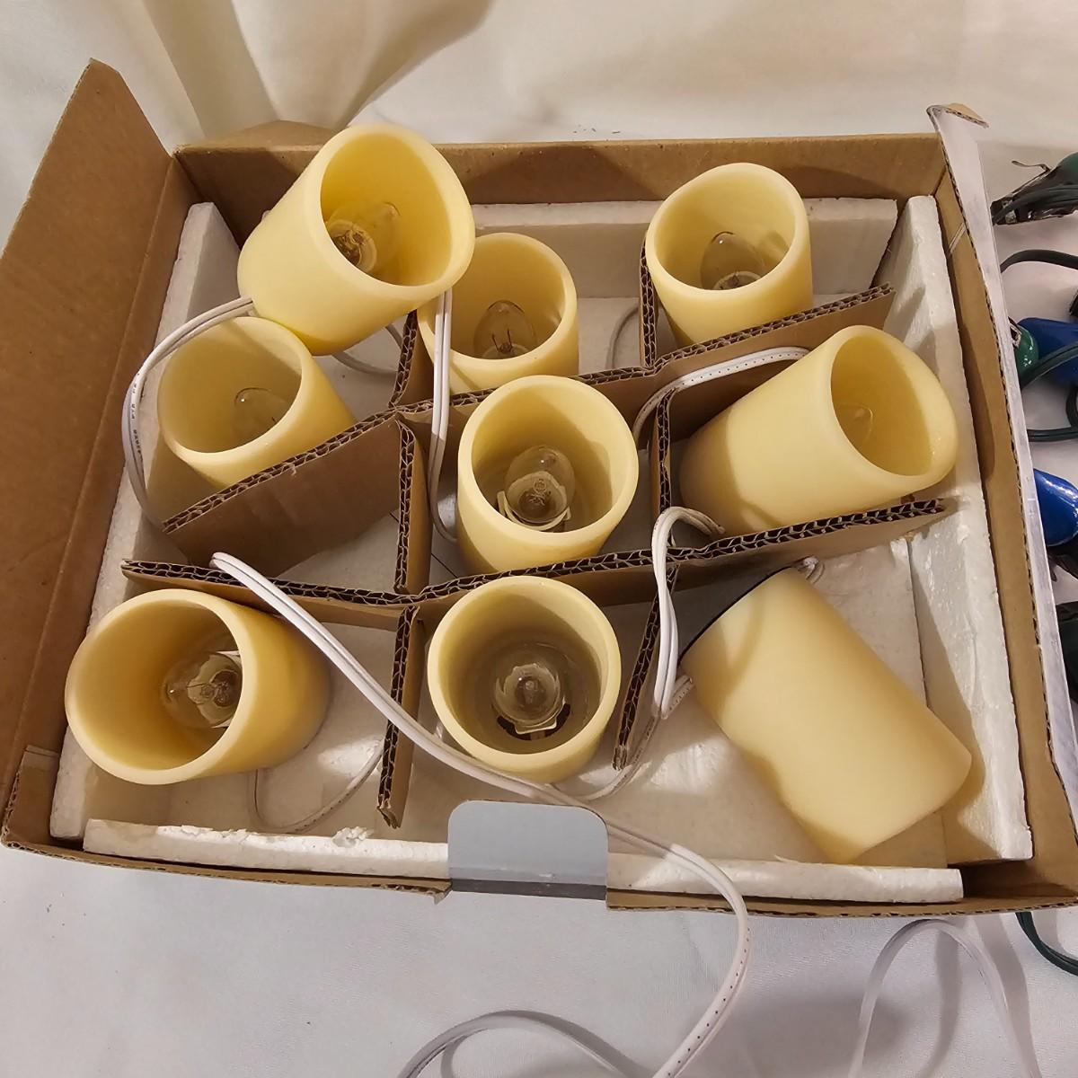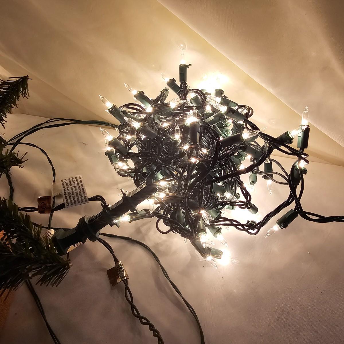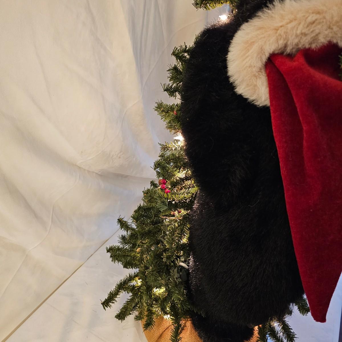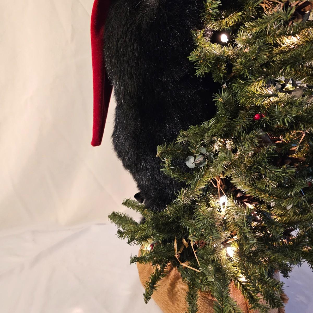 An adorable little black bear making his way up the Christmas tree. Lighted tree has a wrapped burlap base, measures 15" x 18" x 41"H. Also includes several sets of lights, three white incandescent strands, one older C-7 set, few bulbs out. Also a set of lighted candles, some lights out. Four battery operated sets of mini LED's. See photos for details. Shipping available.