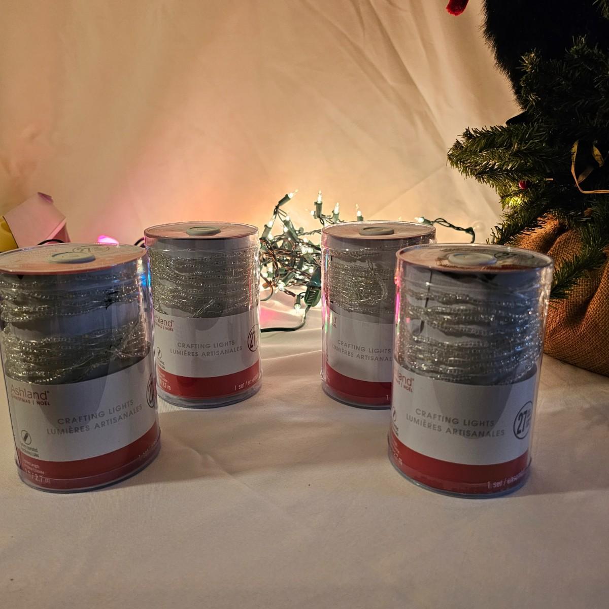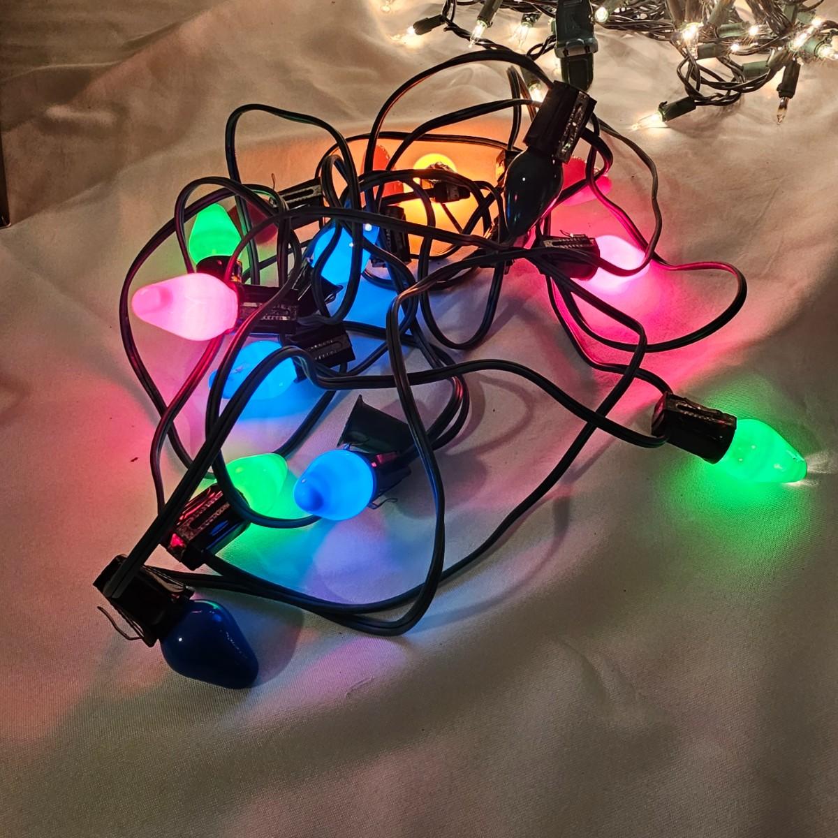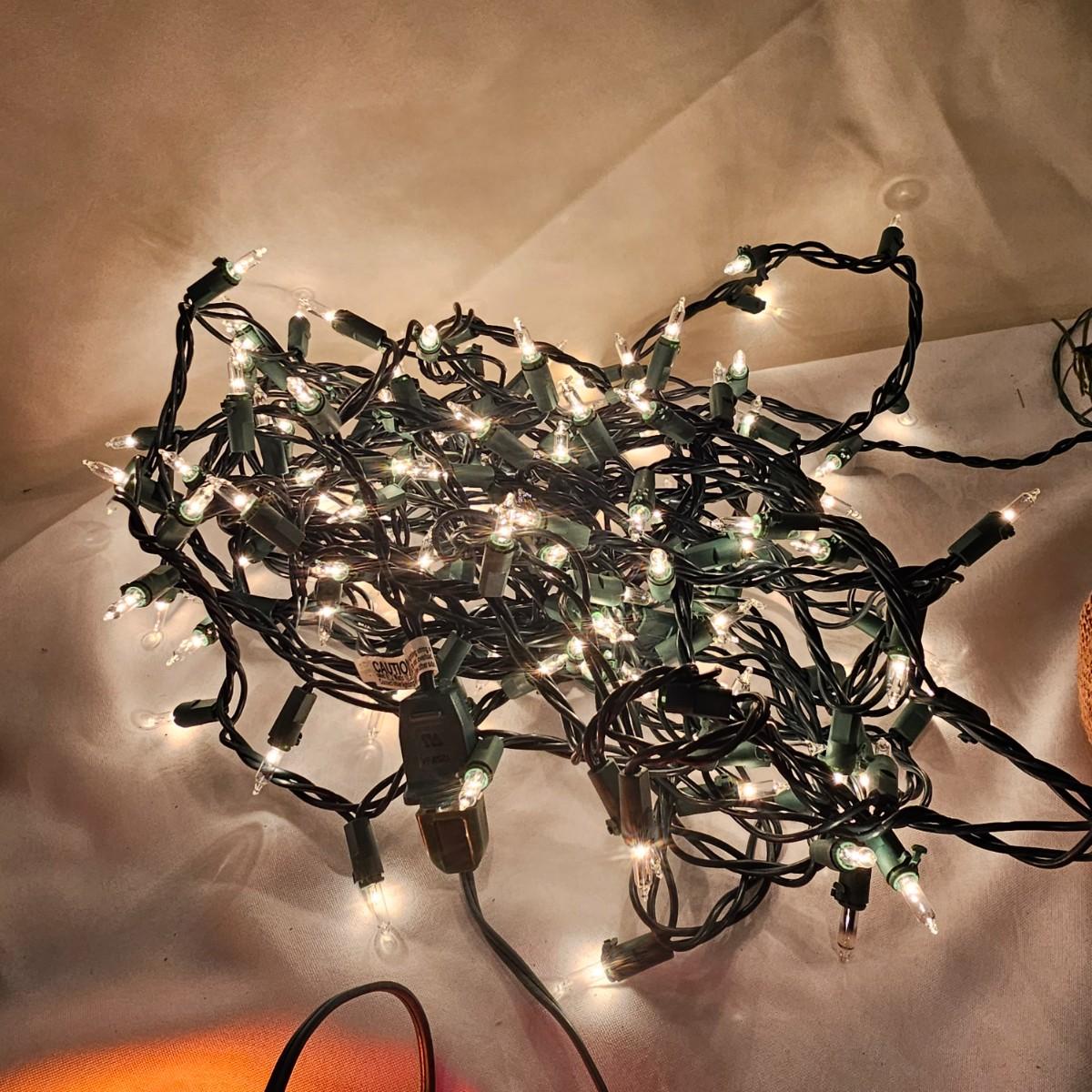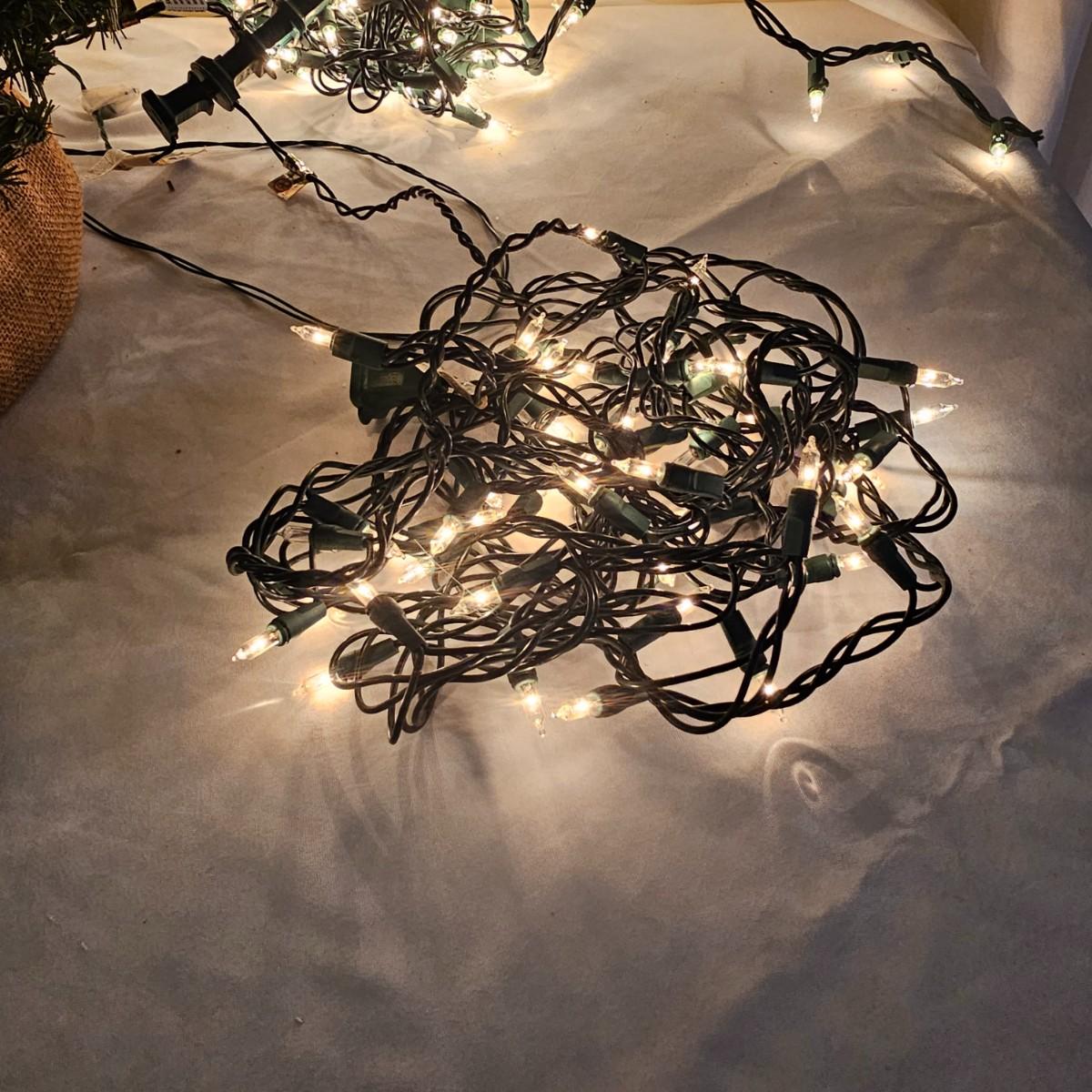 An adorable little black bear making his way up the Christmas tree. Lighted tree has a wrapped burlap base, measures 15" x 18" x 41"H. Also includes several sets of lights, three white incandescent strands, one older C-7 set, few bulbs out. Also a set of lighted candles, some lights out. Four battery operated sets of mini LED's. See photos for details. Shipping available.