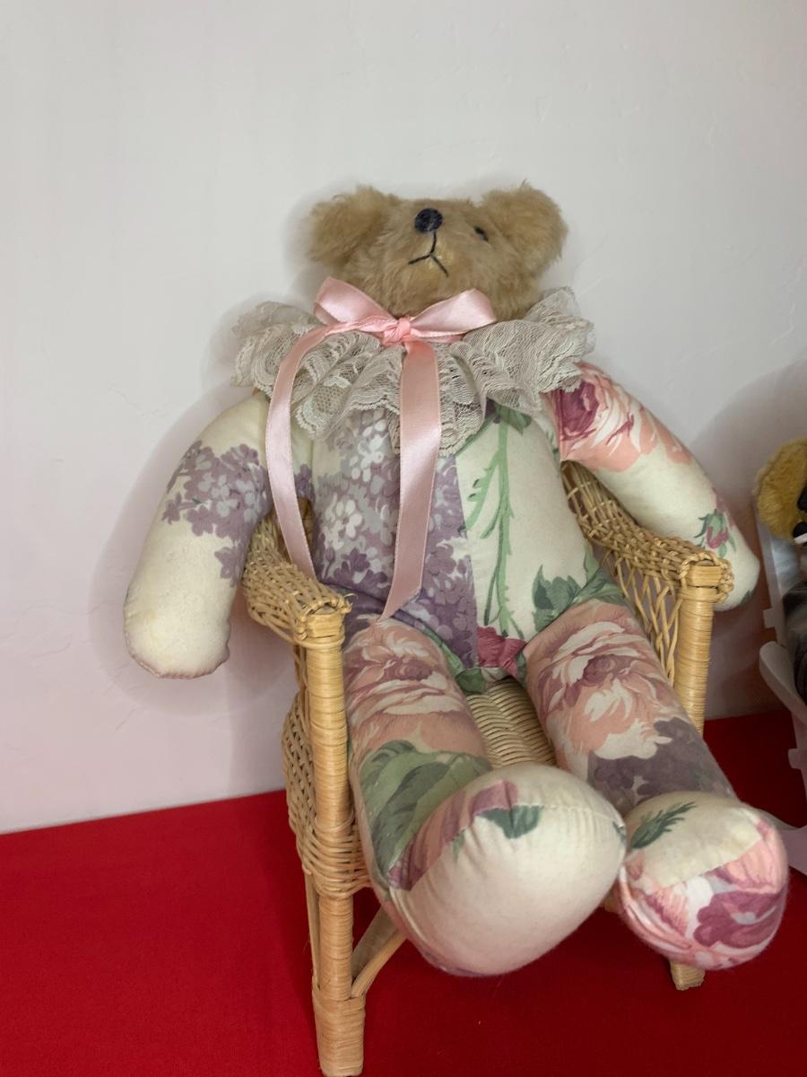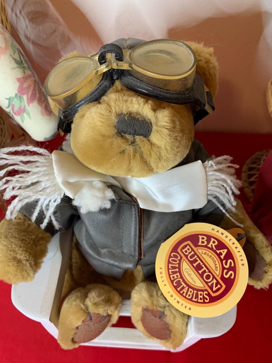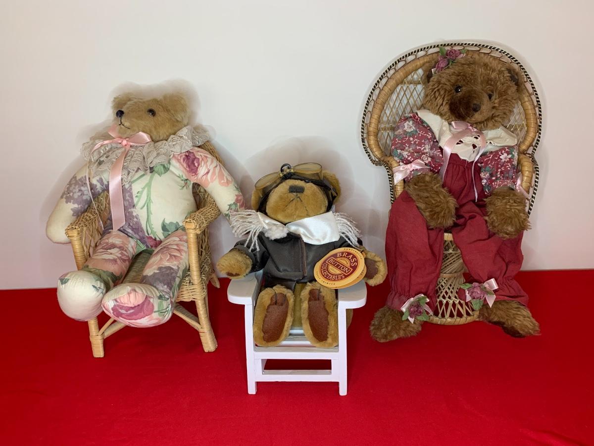 Lot includes two fabric body bears and a Brass Button Collectible Bear (aviator) and 3 chairs. Good Condition.