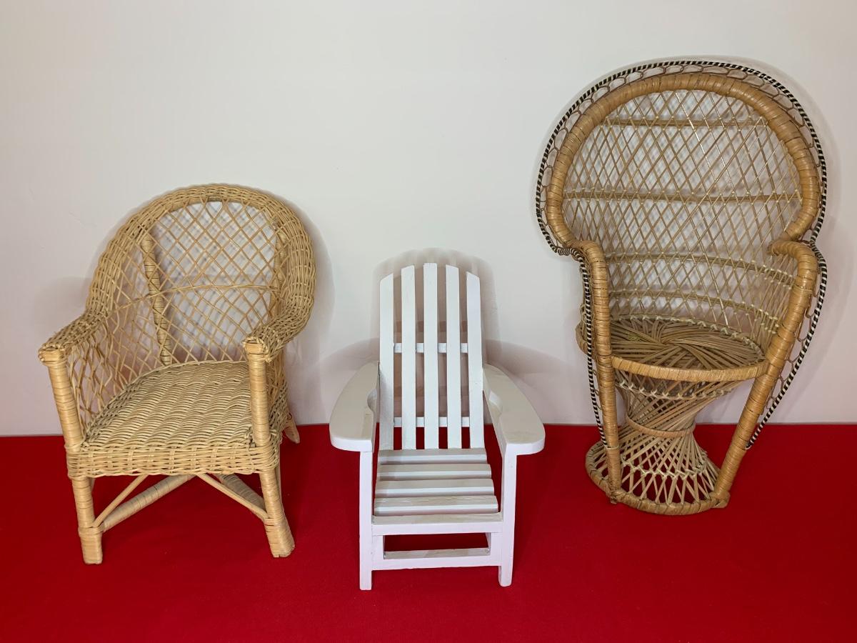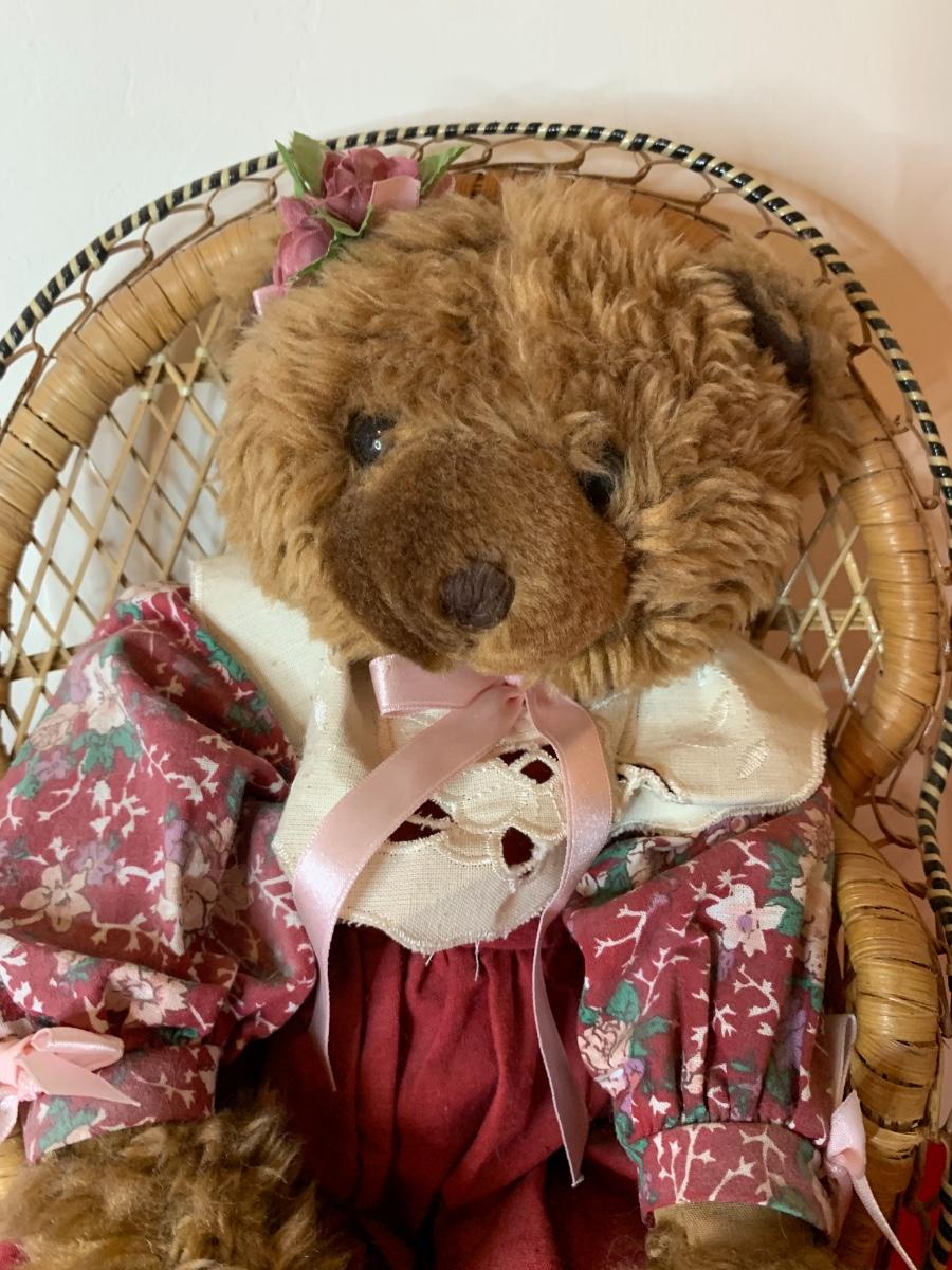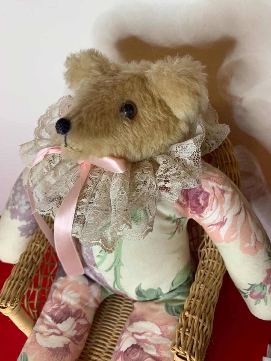 Lot includes two fabric body bears and a Brass Button Collectible Bear (aviator) and 3 chairs. Good Condition.