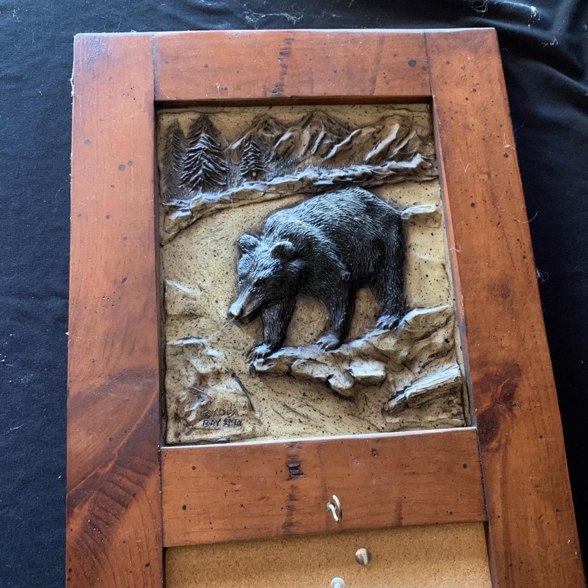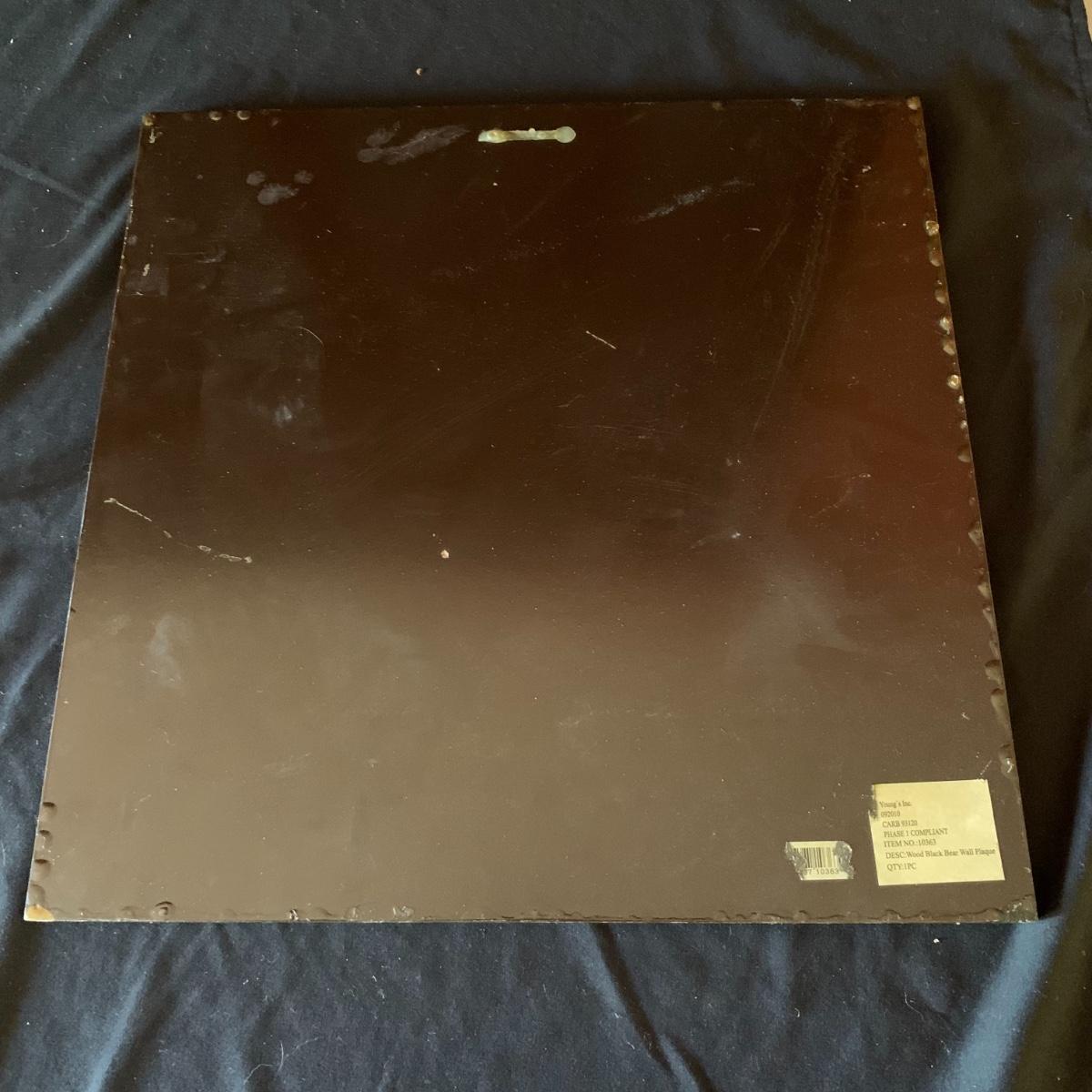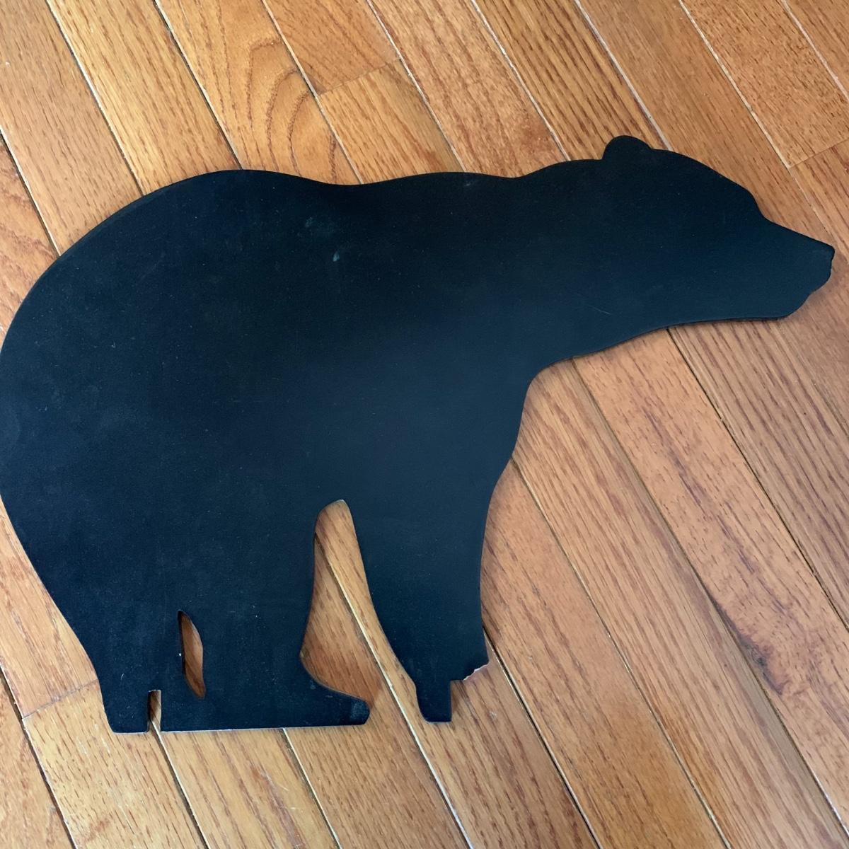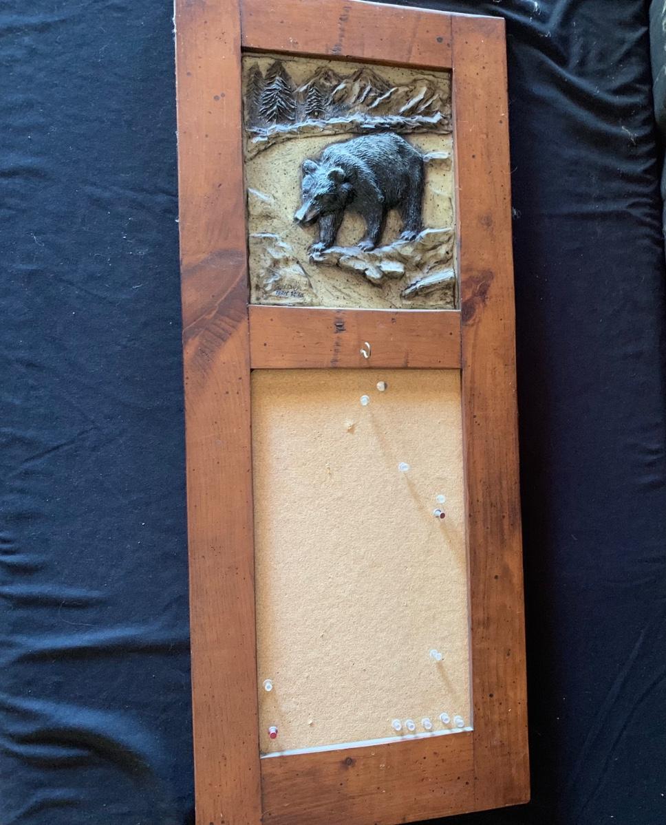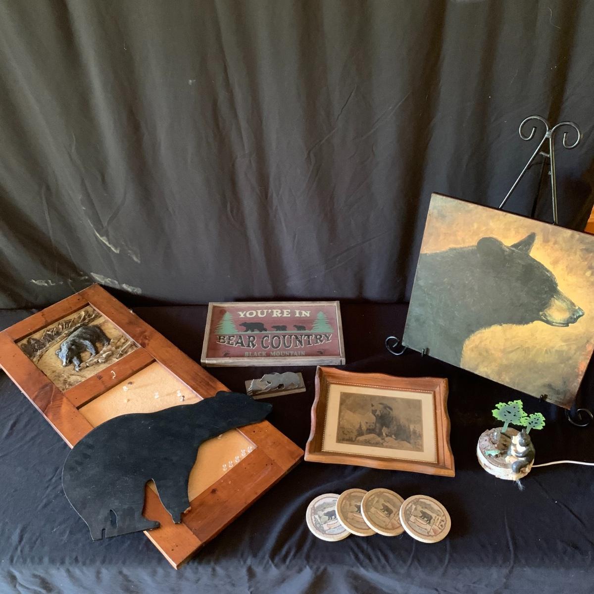 This lot includes 4 bear decorated coasters, a bear plaque, a bulletin board, a light up bear sculpture, bear art, and more. The black bear outline decor has a broken leg (see photos). The bulletin board measure about 34.5in x 14in. Shipping available.