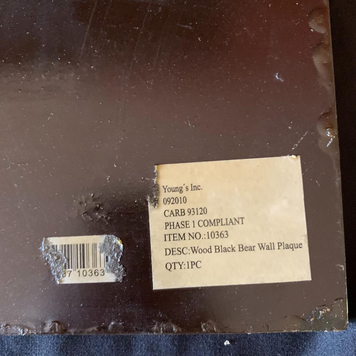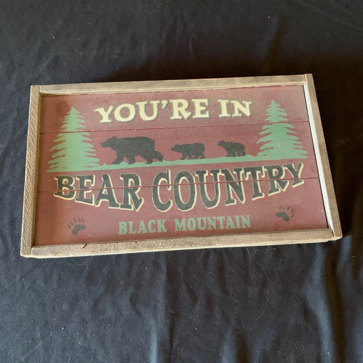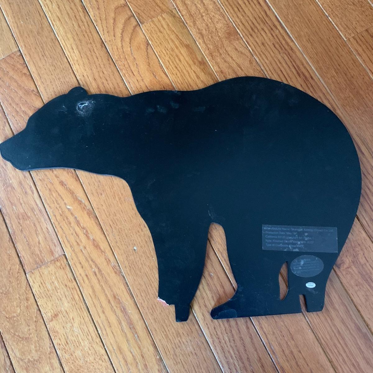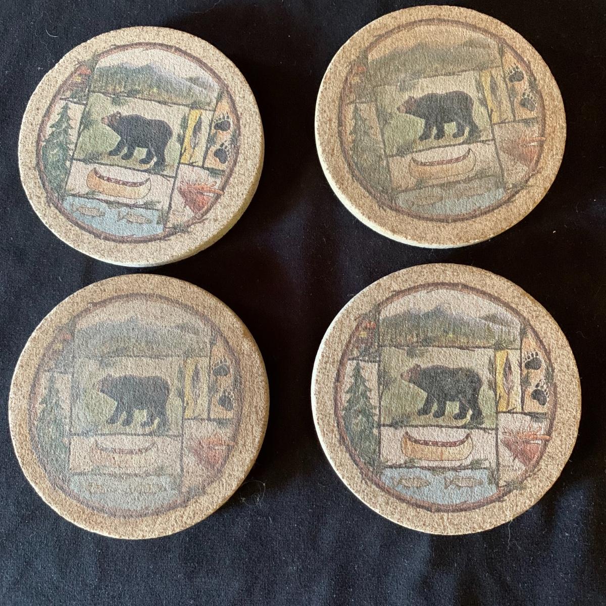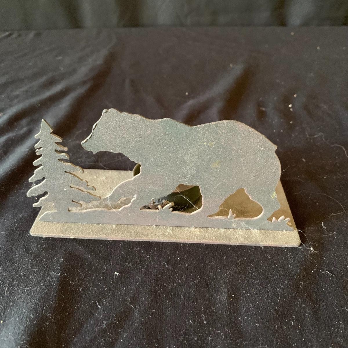 This lot includes 4 bear decorated coasters, a bear plaque, a bulletin board, a light up bear sculpture, bear art, and more. The black bear outline decor has a broken leg (see photos). The bulletin board measure about 34.5in x 14in. Shipping available.
