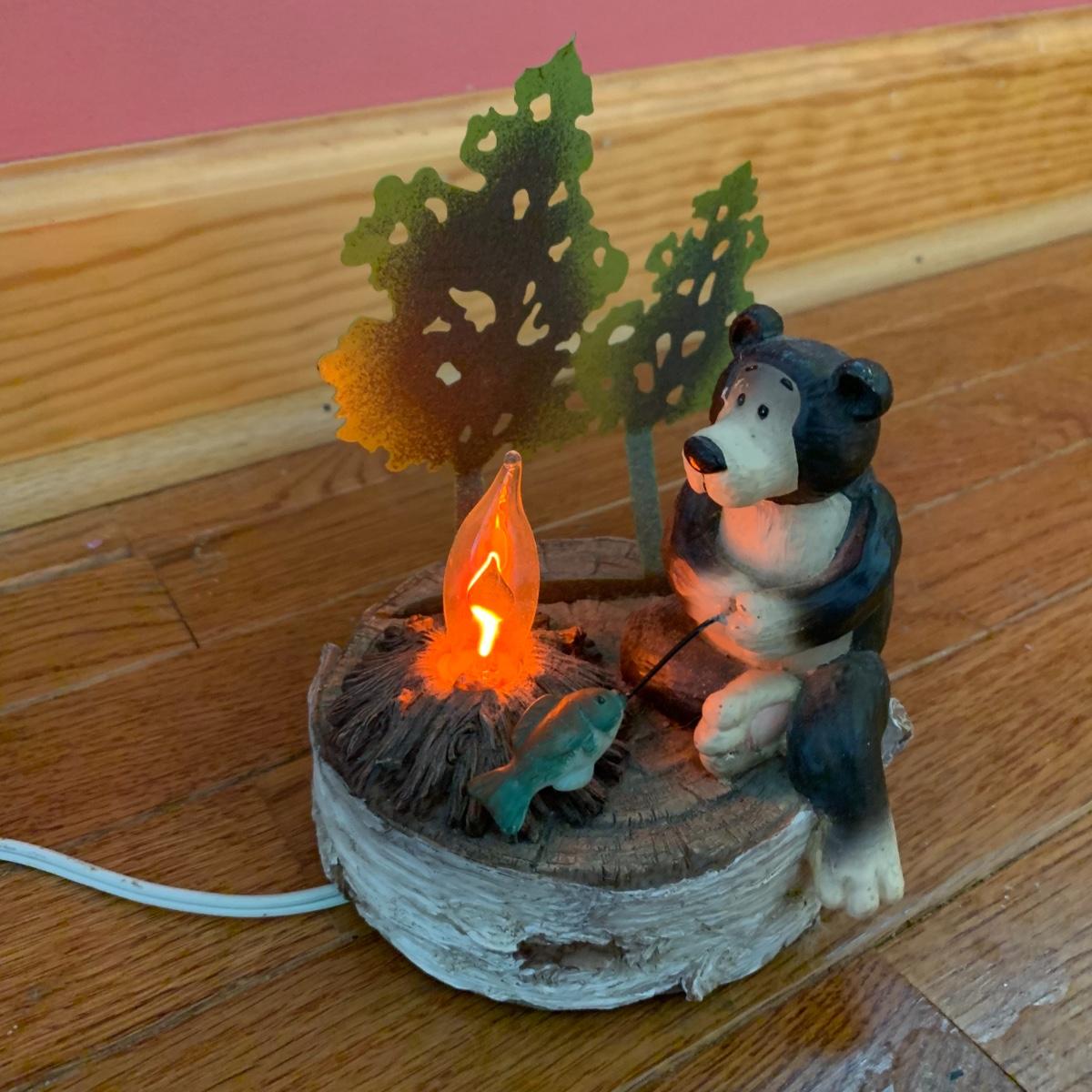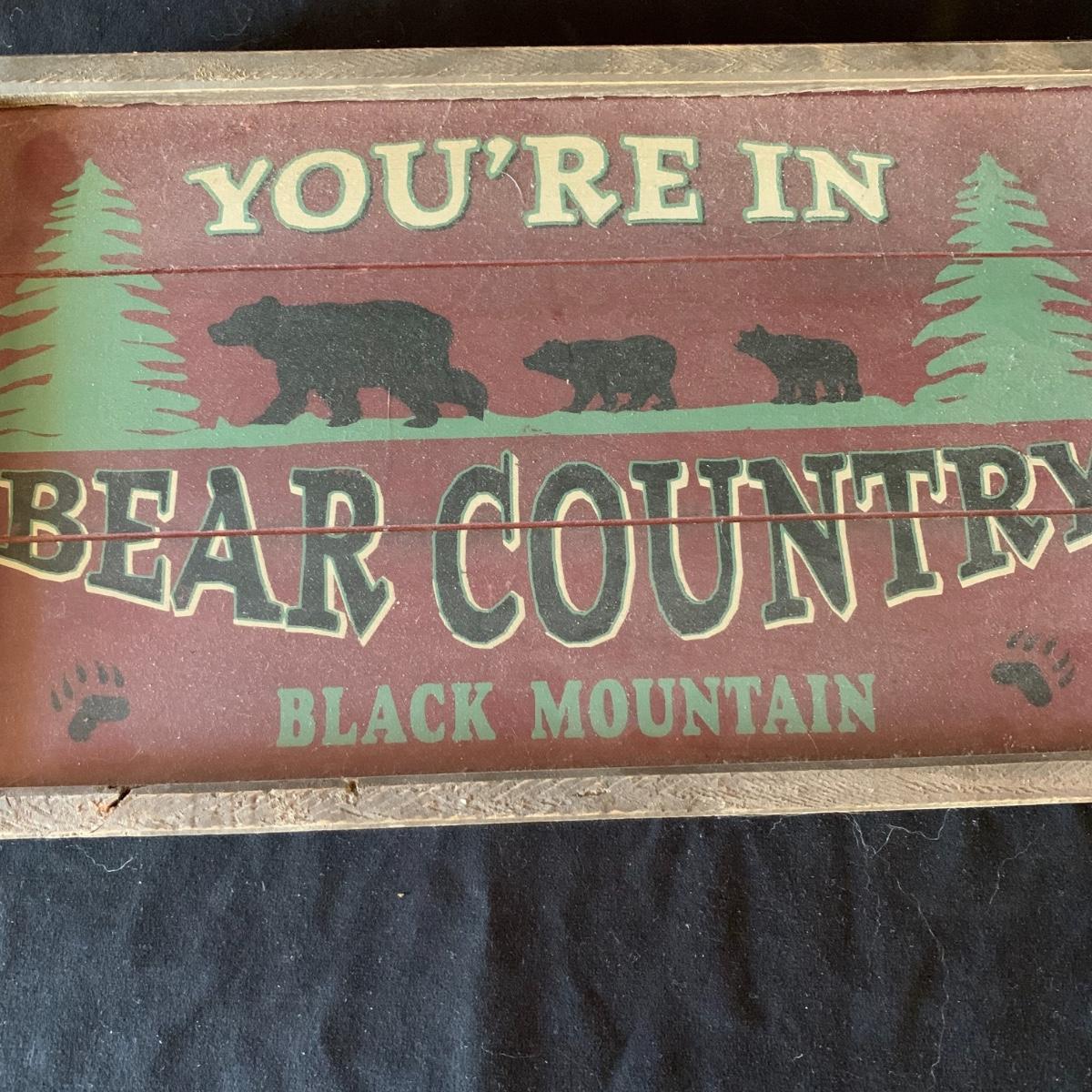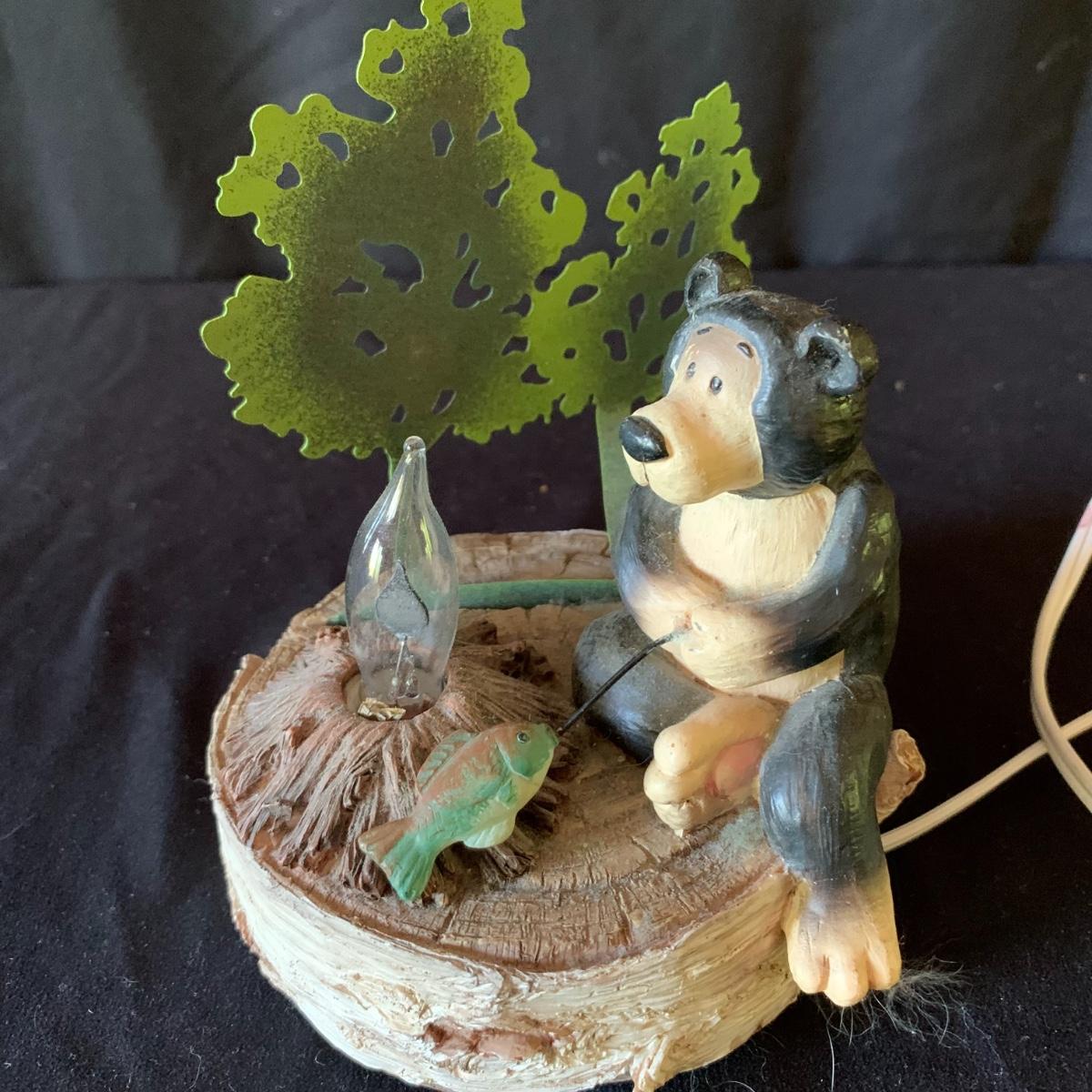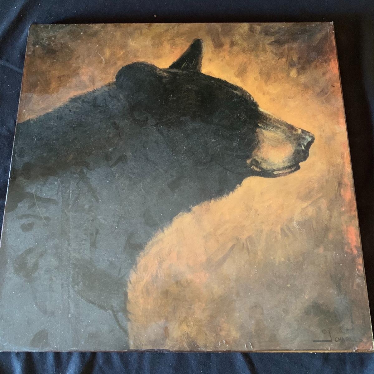 This lot includes 4 bear decorated coasters, a bear plaque, a bulletin board, a light up bear sculpture, bear art, and more. The black bear outline decor has a broken leg (see photos). The bulletin board measure about 34.5in x 14in. Shipping available.