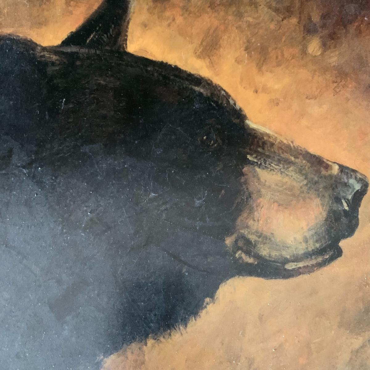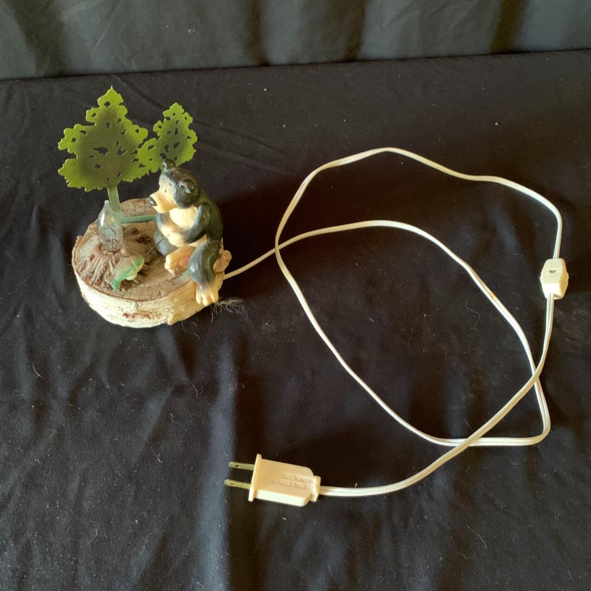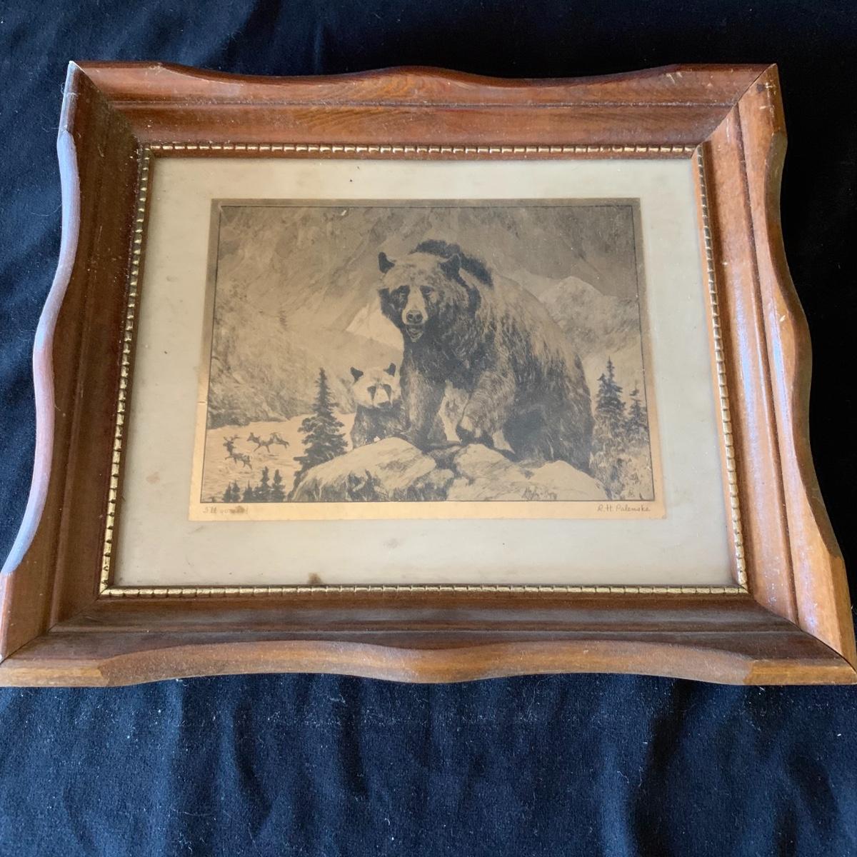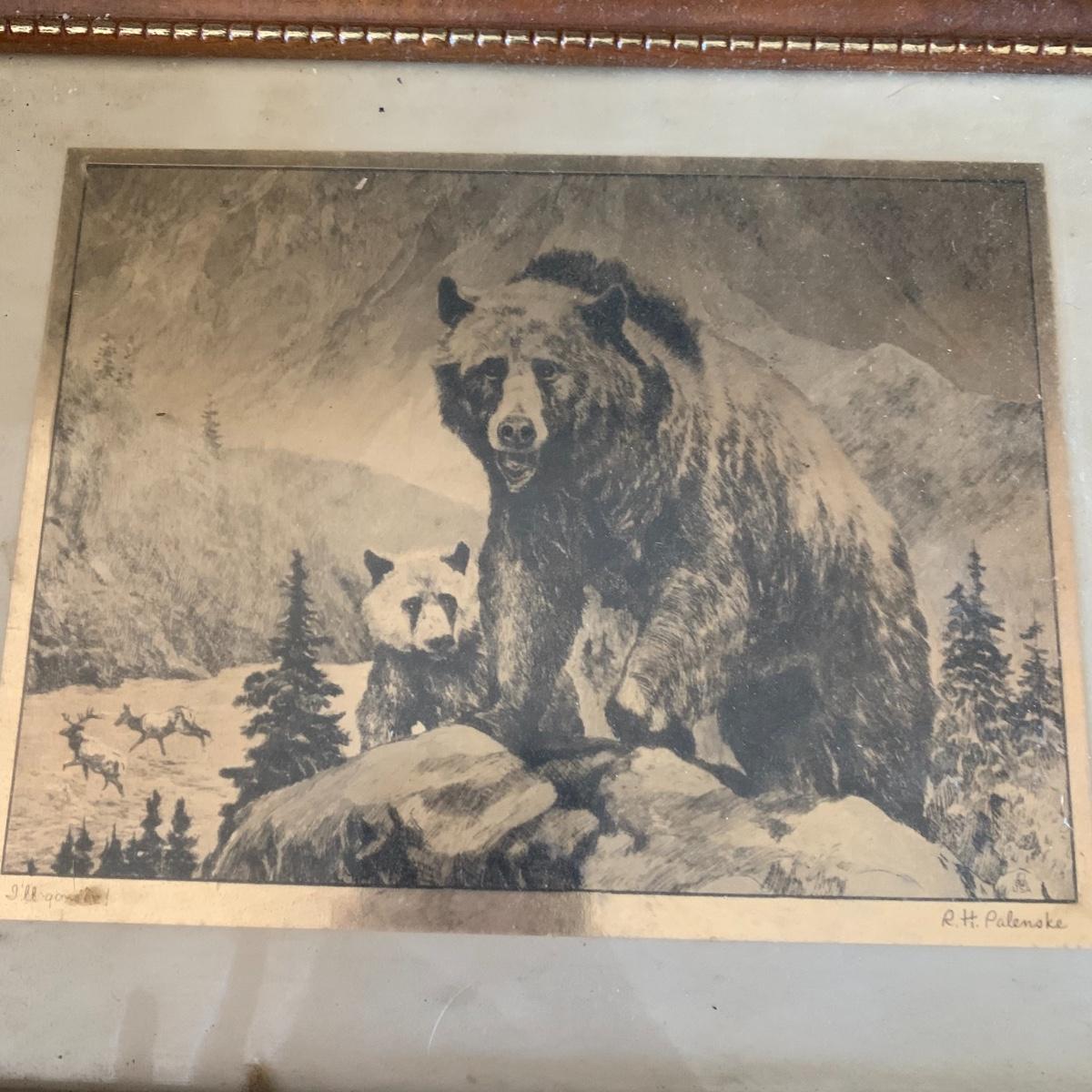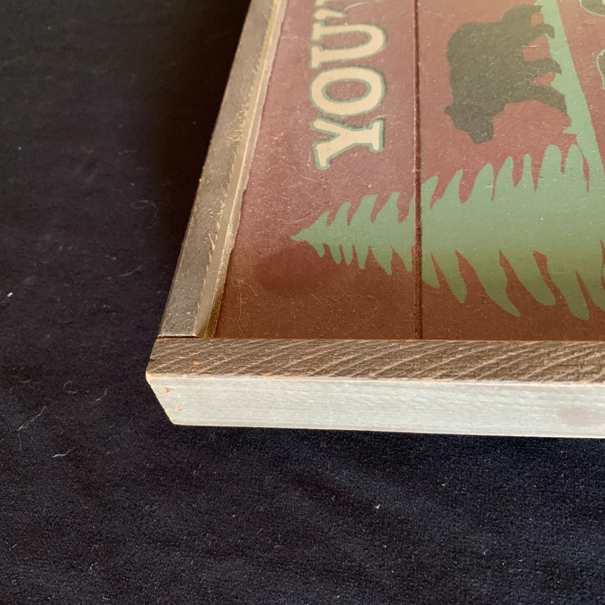 This lot includes 4 bear decorated coasters, a bear plaque, a bulletin board, a light up bear sculpture, bear art, and more. The black bear outline decor has a broken leg (see photos). The bulletin board measure about 34.5in x 14in. Shipping available.