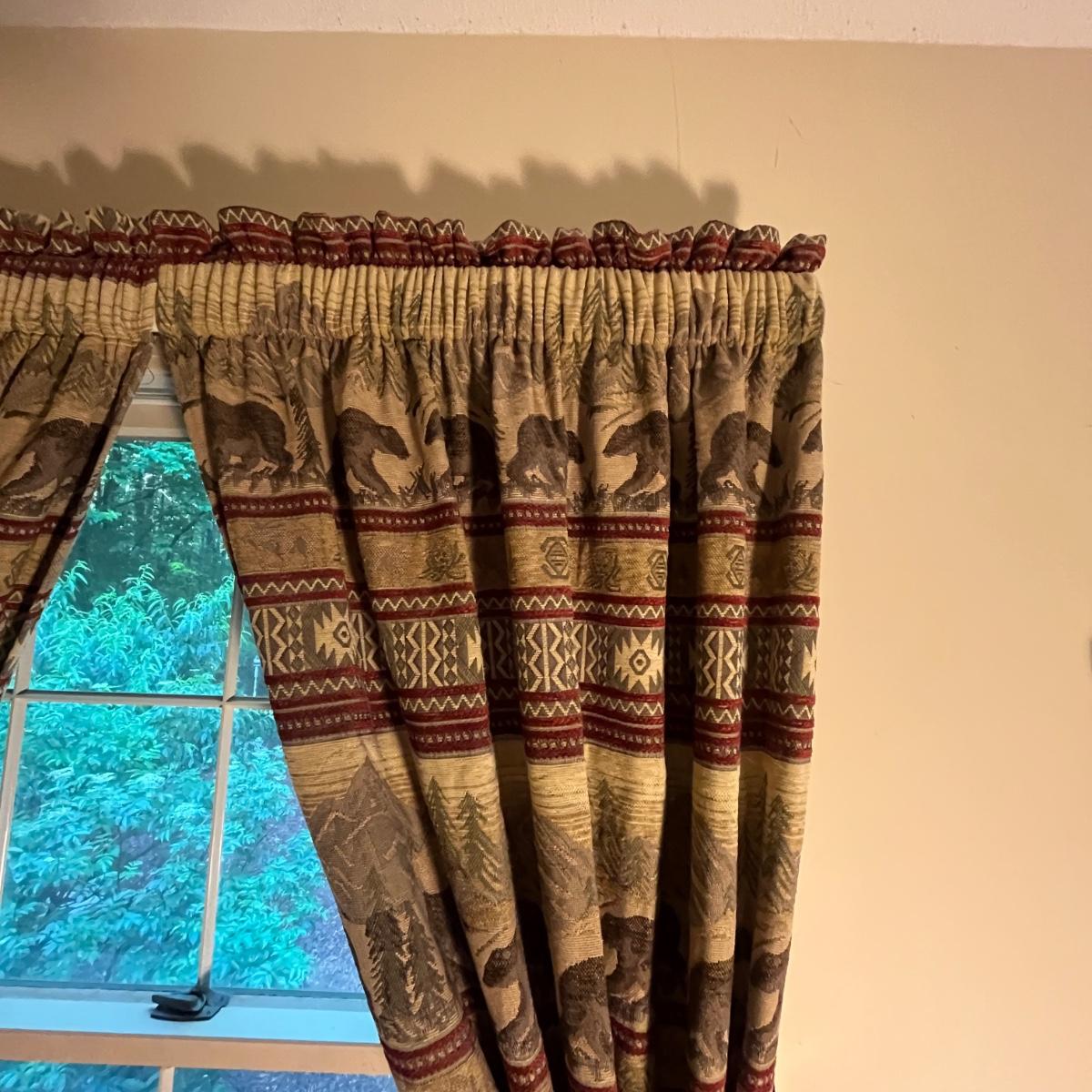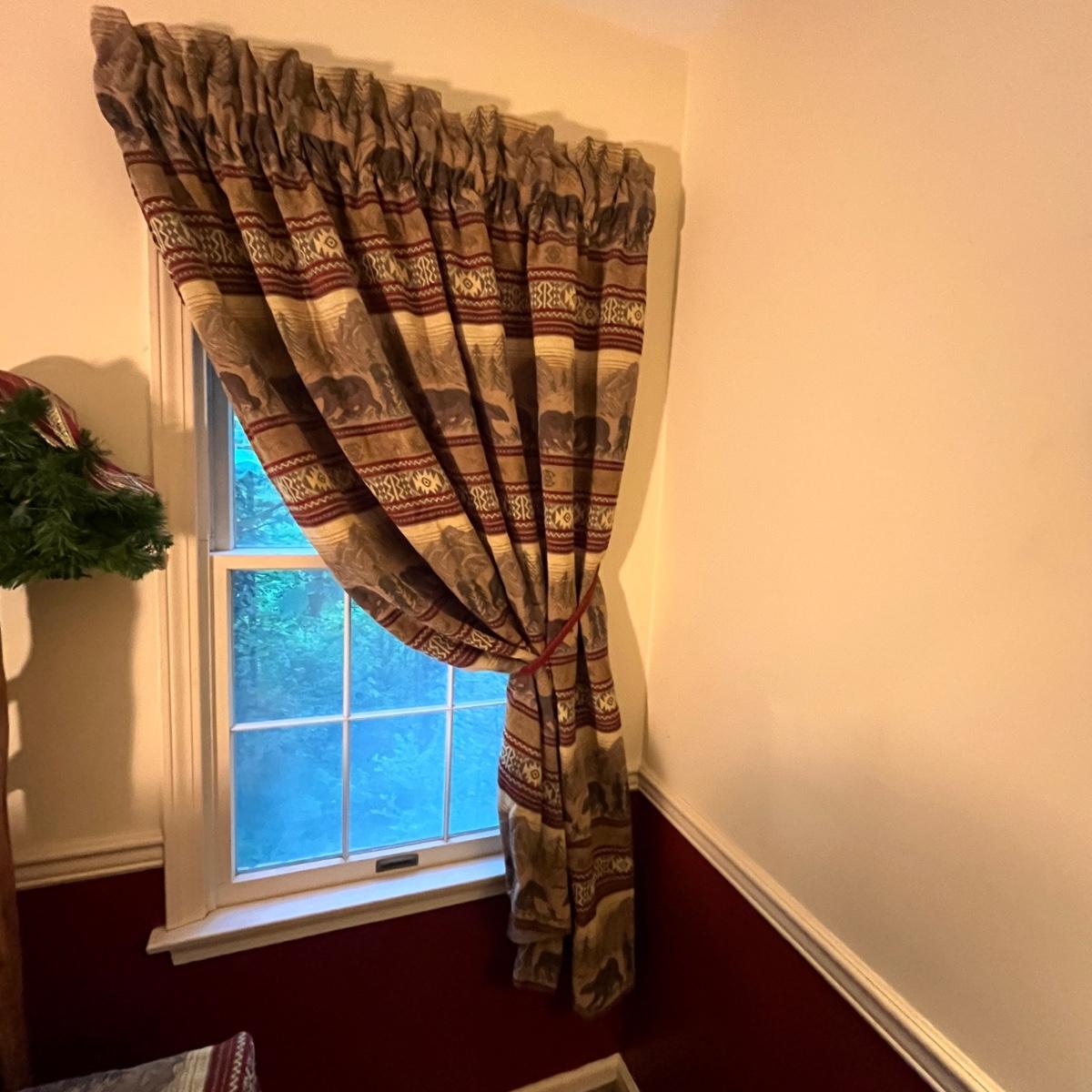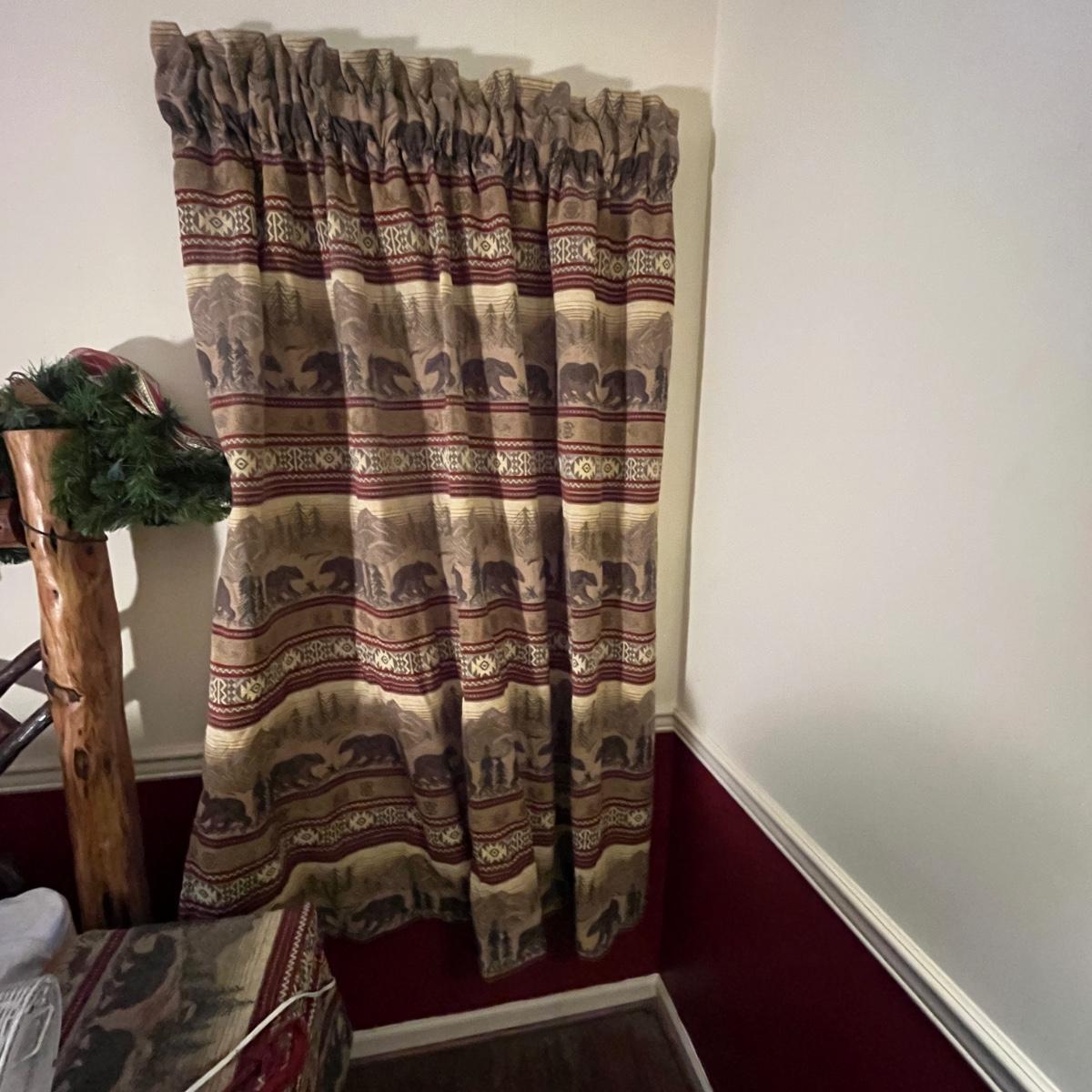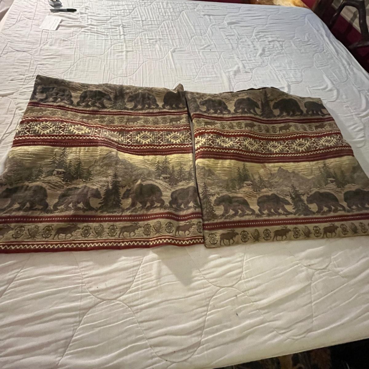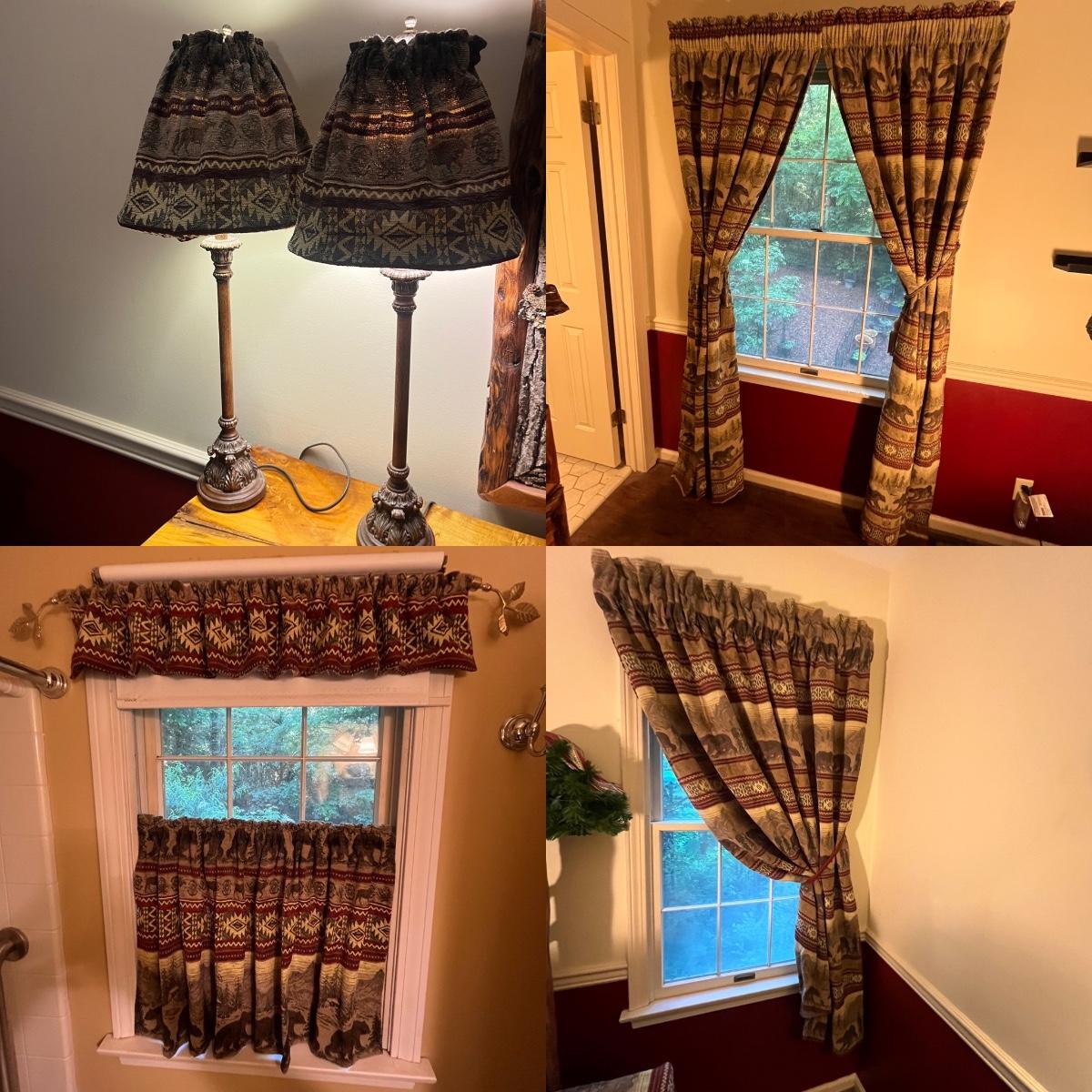 These bear and moose motif decor items match the king sized bedding lot in this auction. Lot includes two table lamps that measure 10” x 10” x 25”H, two curtains that measure 48” x 84”long, one curtain that measures 70” x 70”x two cushion covers that measure 25” x 26”, and a runner that measures 69” x 16”H. Also includes a valance and small curtain that measures 50” x 22”H. Curtains have been taken down ready for transport.