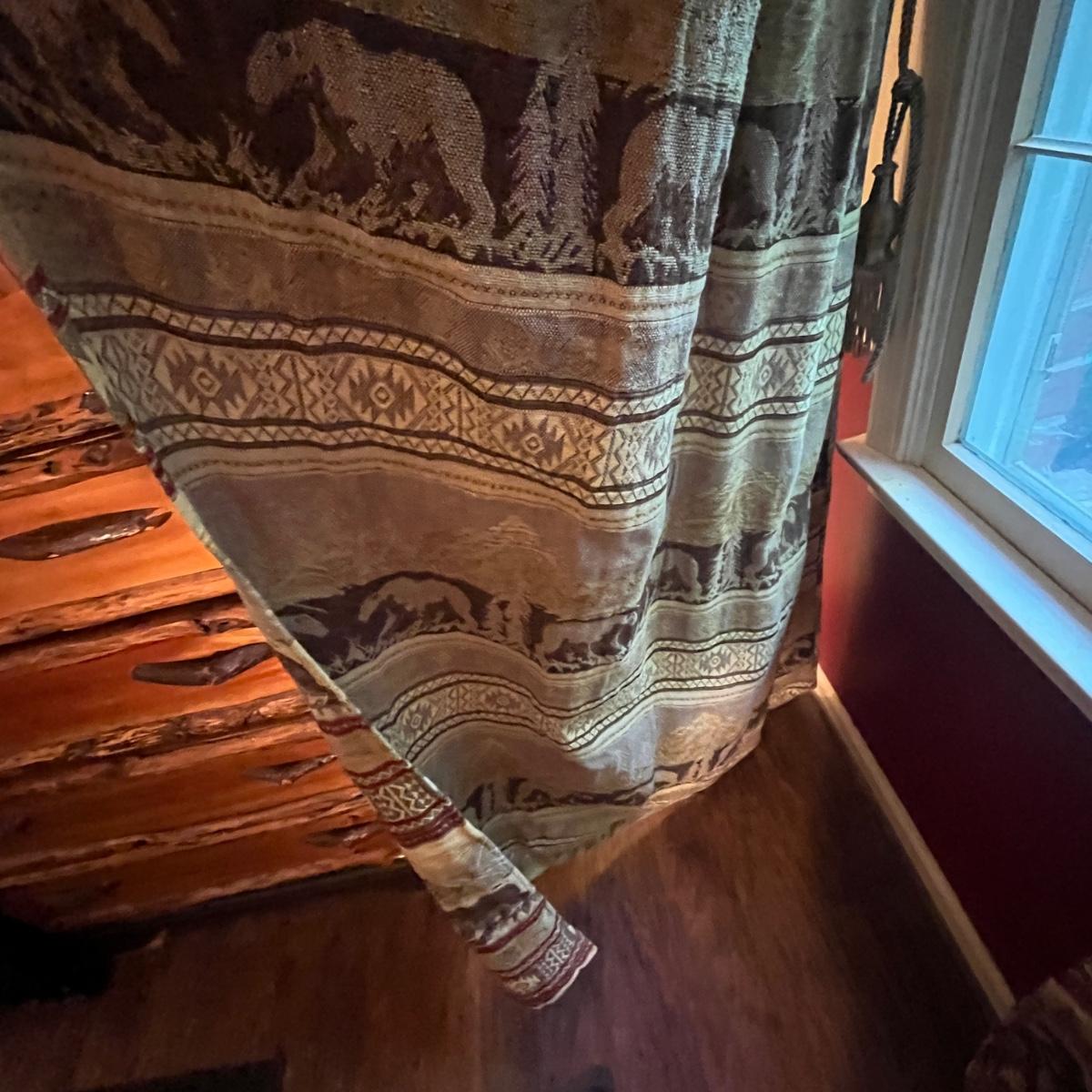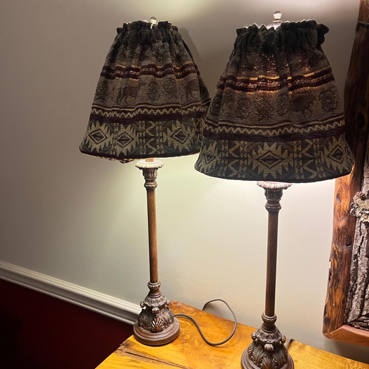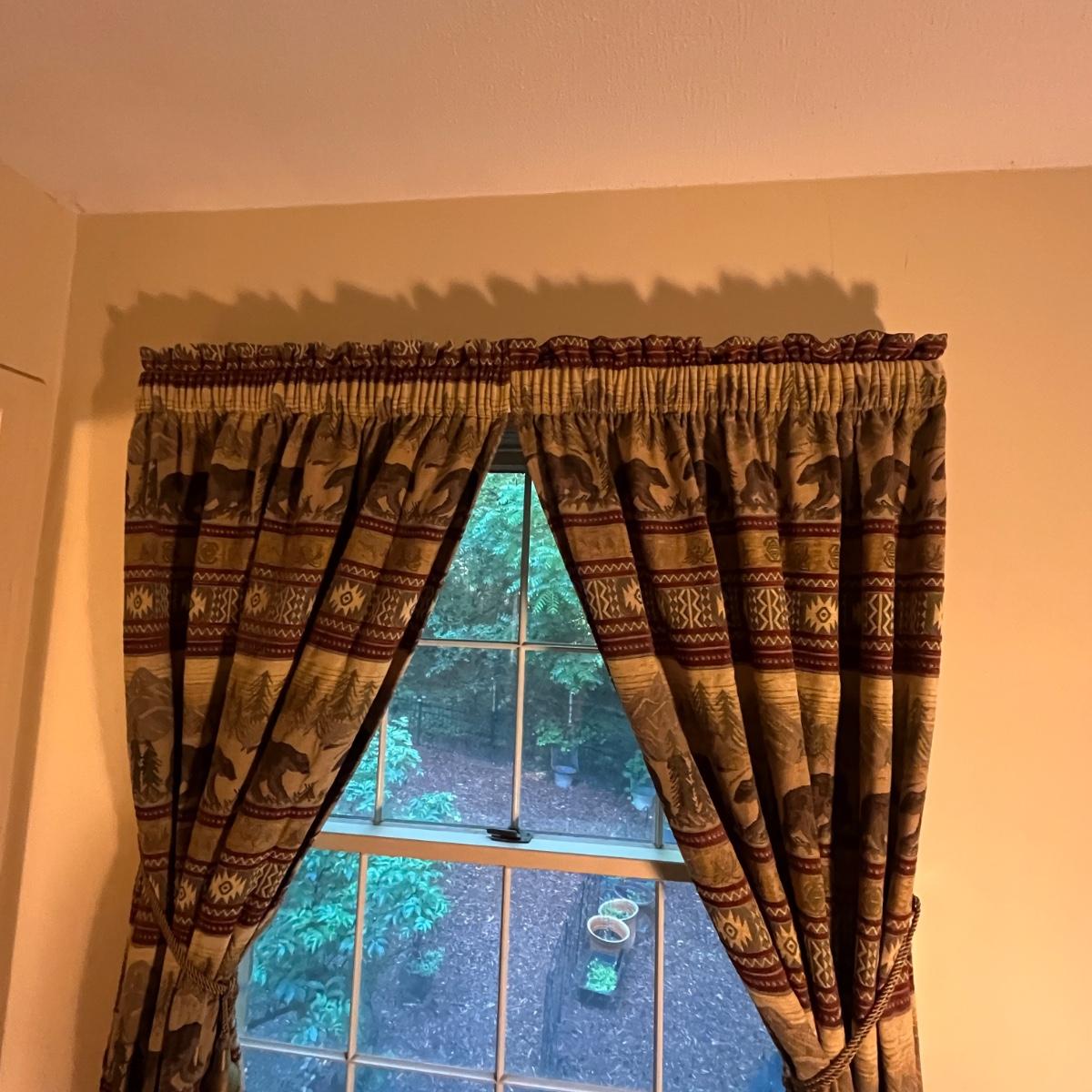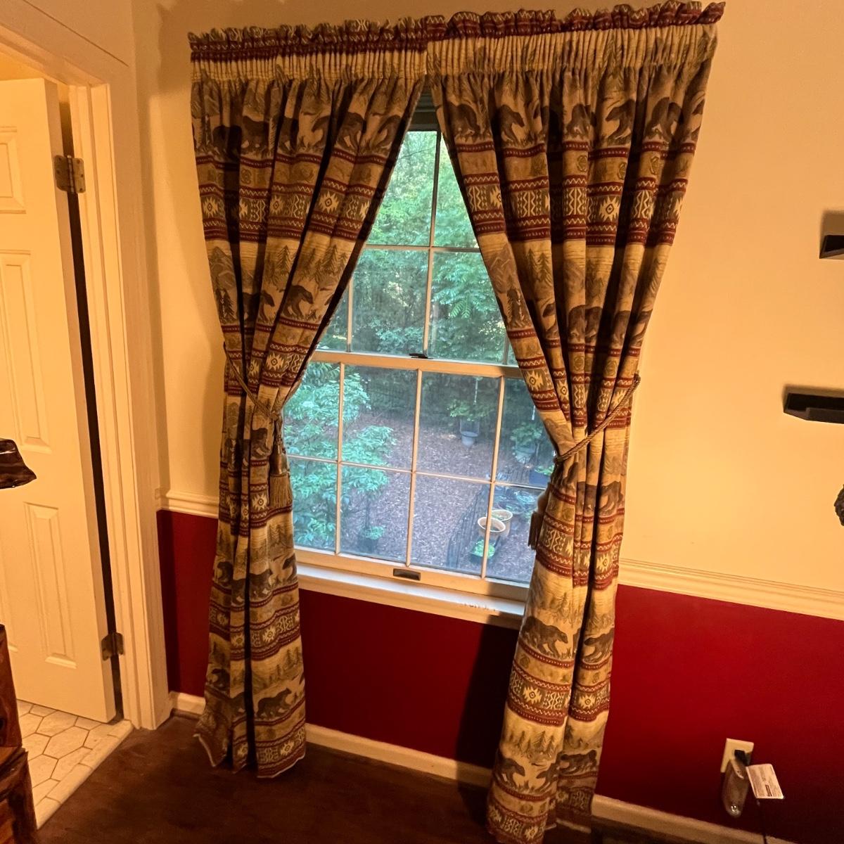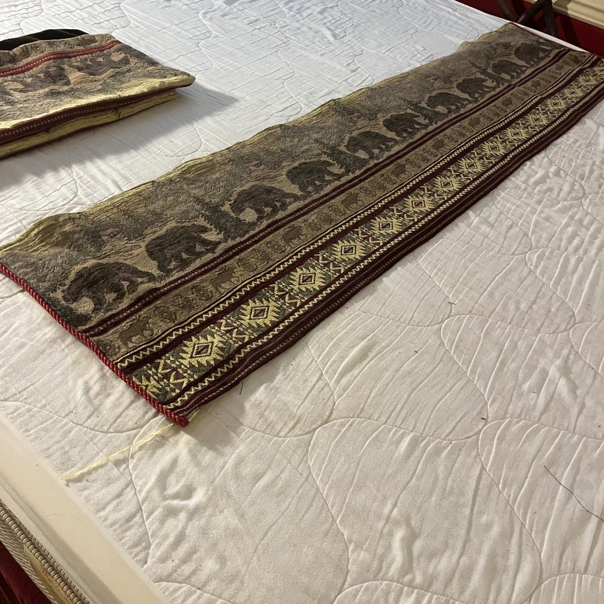 These bear and moose motif decor items match the king sized bedding lot in this auction. Lot includes two table lamps that measure 10” x 10” x 25”H, two curtains that measure 48” x 84”long, one curtain that measures 70” x 70”x two cushion covers that measure 25” x 26”, and a runner that measures 69” x 16”H. Also includes a valance and small curtain that measures 50” x 22”H. Curtains have been taken down ready for transport.