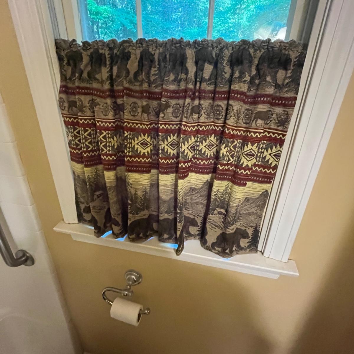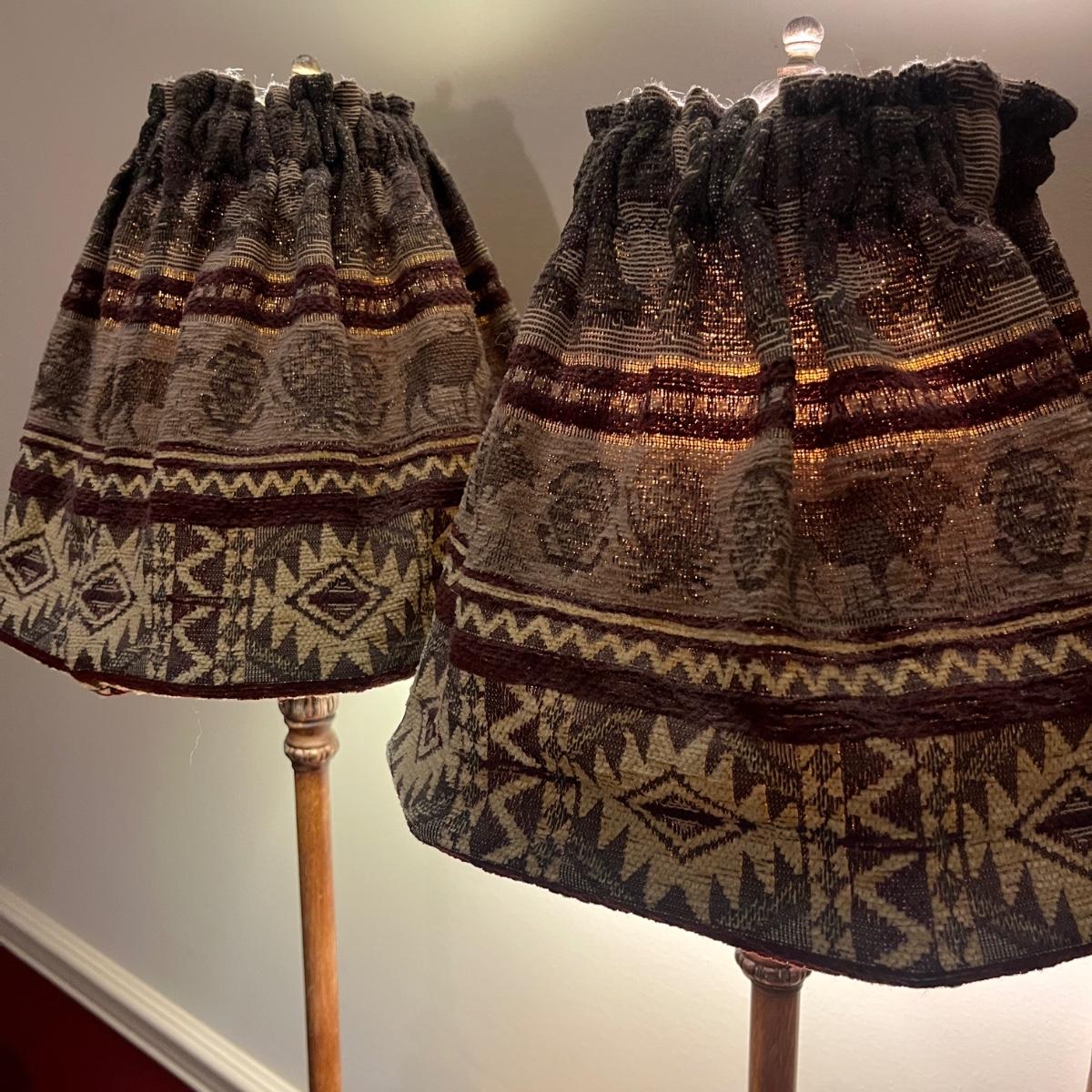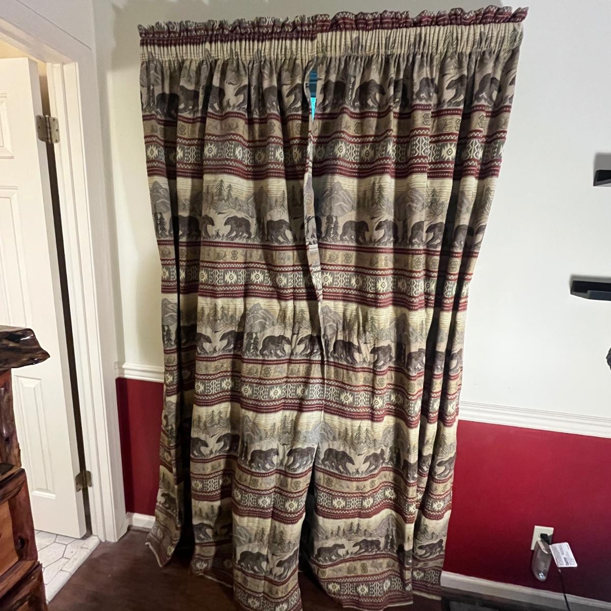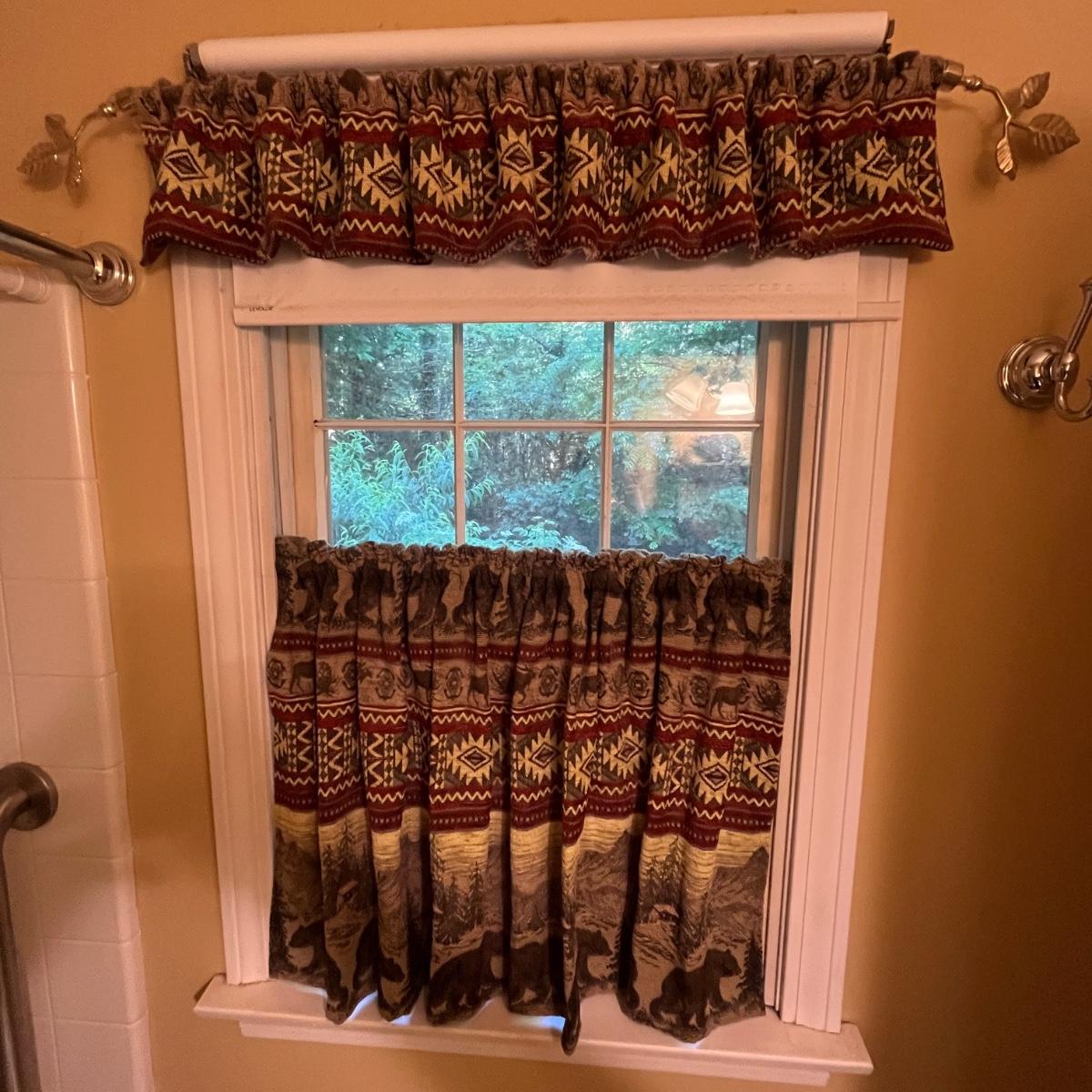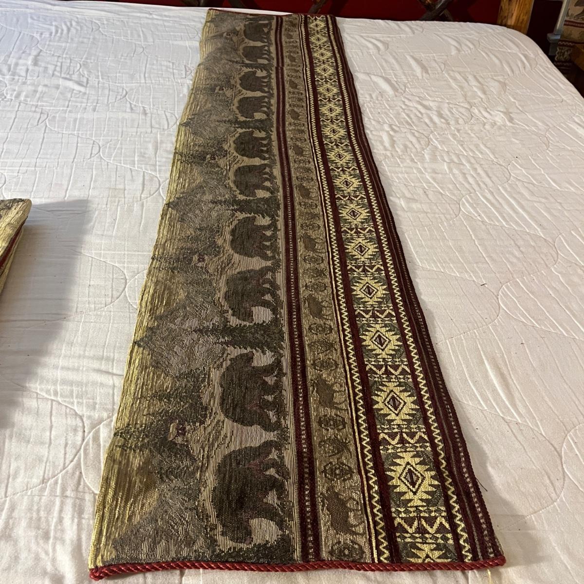 These bear and moose motif decor items match the king sized bedding lot in this auction. Lot includes two table lamps that measure 10” x 10” x 25”H, two curtains that measure 48” x 84”long, one curtain that measures 70” x 70”x two cushion covers that measure 25” x 26”, and a runner that measures 69” x 16”H. Also includes a valance and small curtain that measures 50” x 22”H. Curtains have been taken down ready for transport.