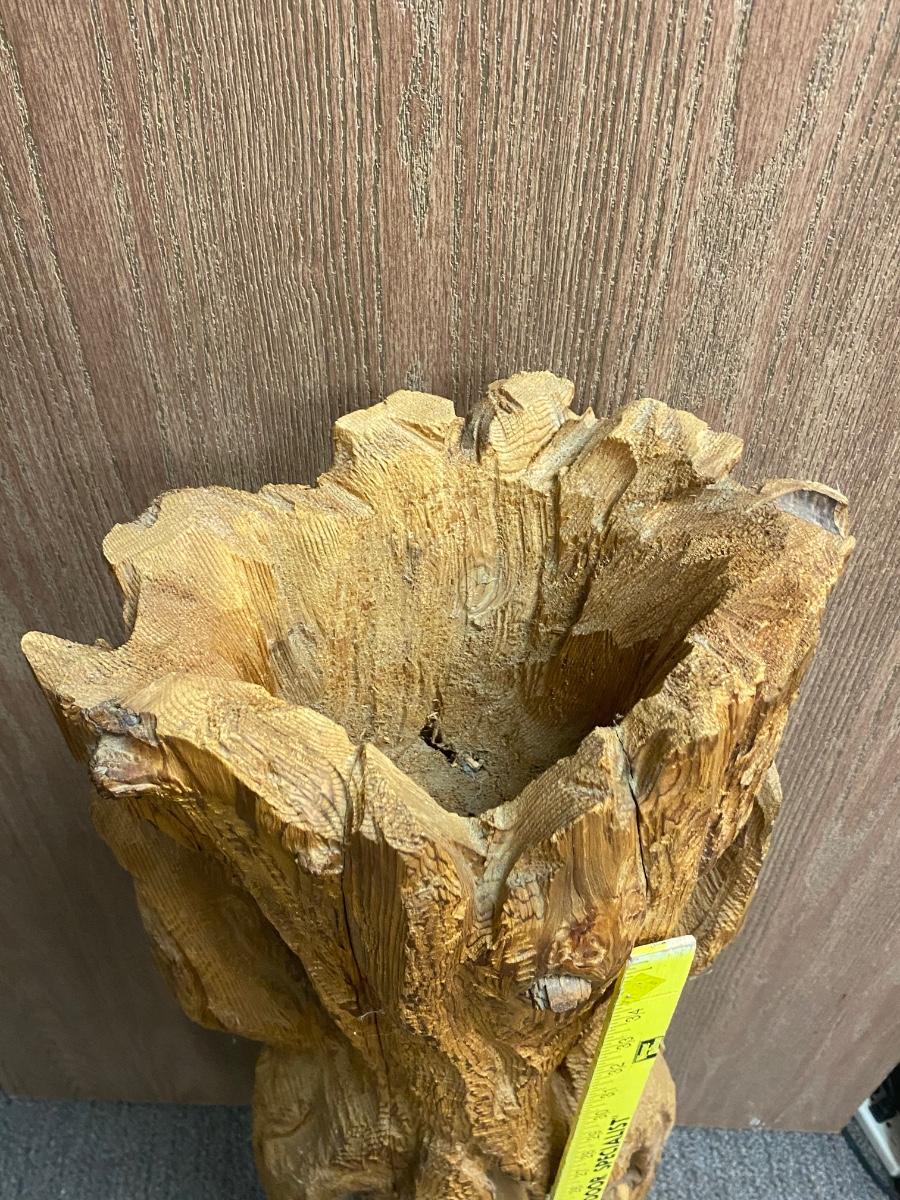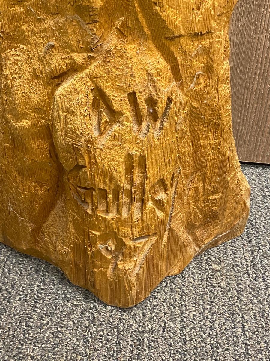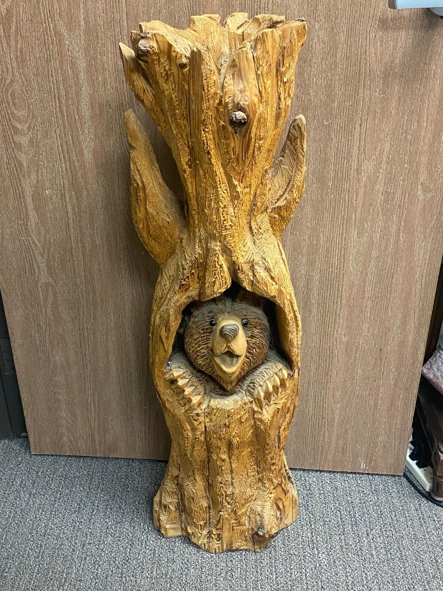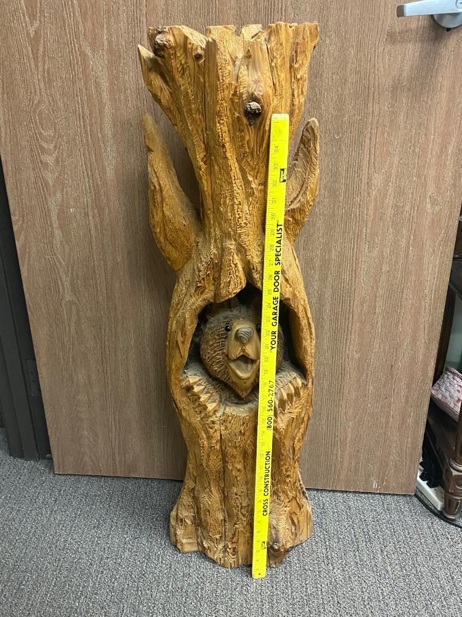 Bear Peeking Out From Tree Carved Stump Chainsaw Wood Art Yard Garden Patio Rustic Decor. About 40" tall. Has a small bowl carved into the top, could be used for a plant. Nicely done. Artist signed on the back base of stump.