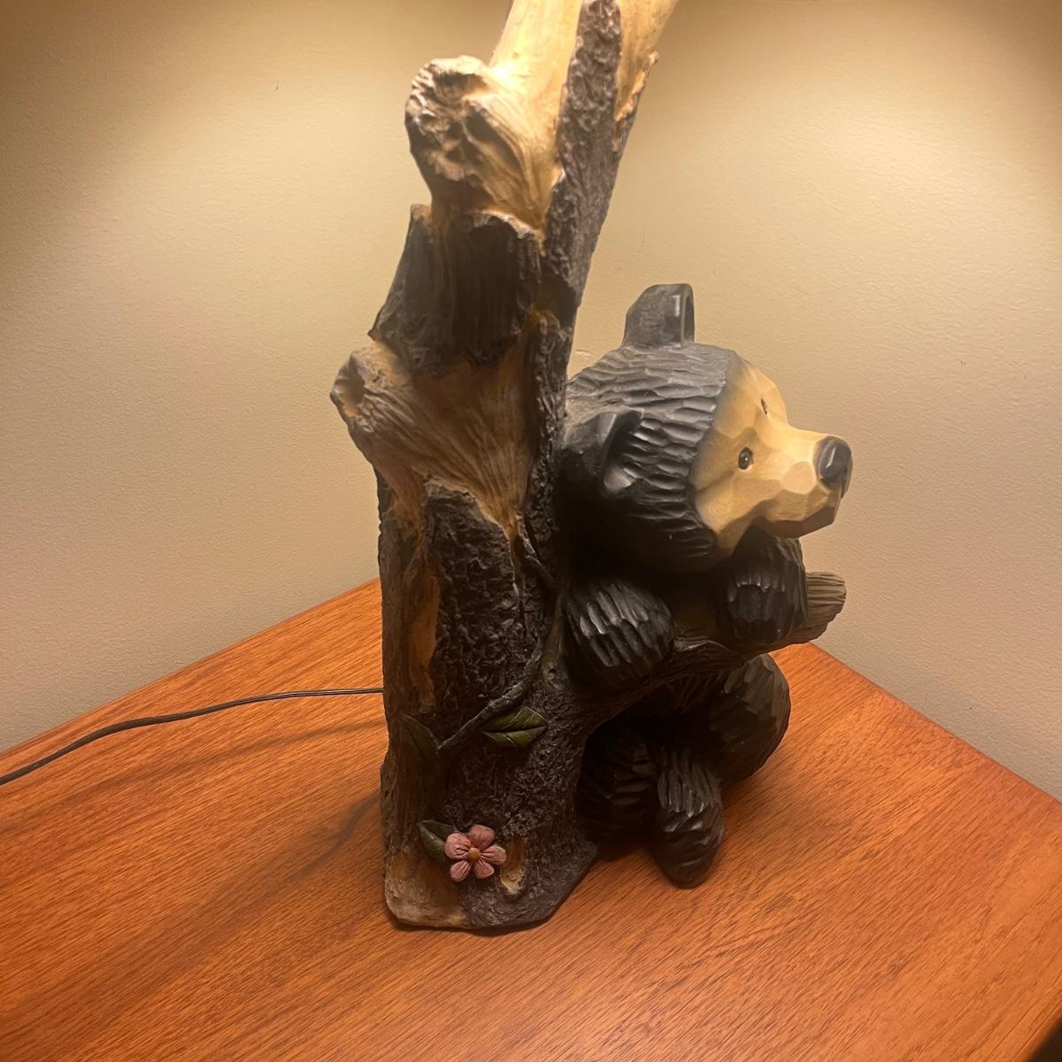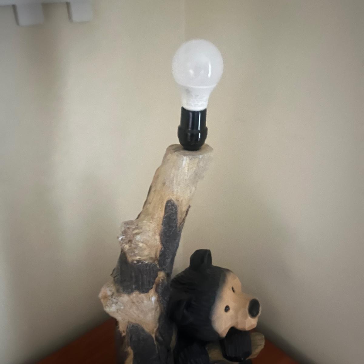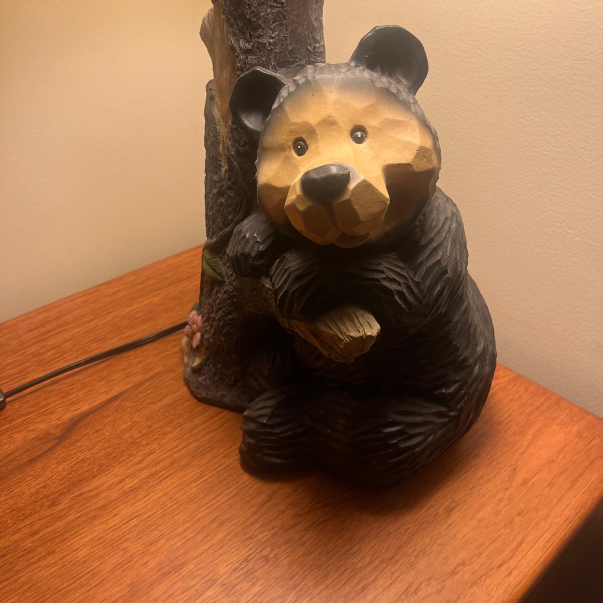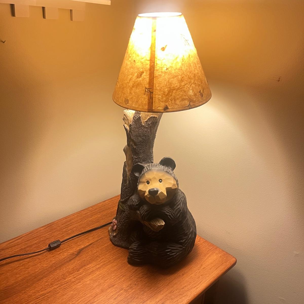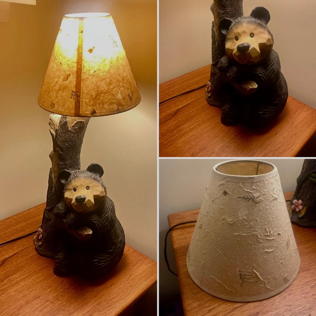 Lot includes a bear table lamp with inline on/off switch. Lamp powered on when plugged in. Lamp measures 12” x 9” x 26”H not including shade. Shade has damage on inside, see pictures. Lamp appears to be made of resin.