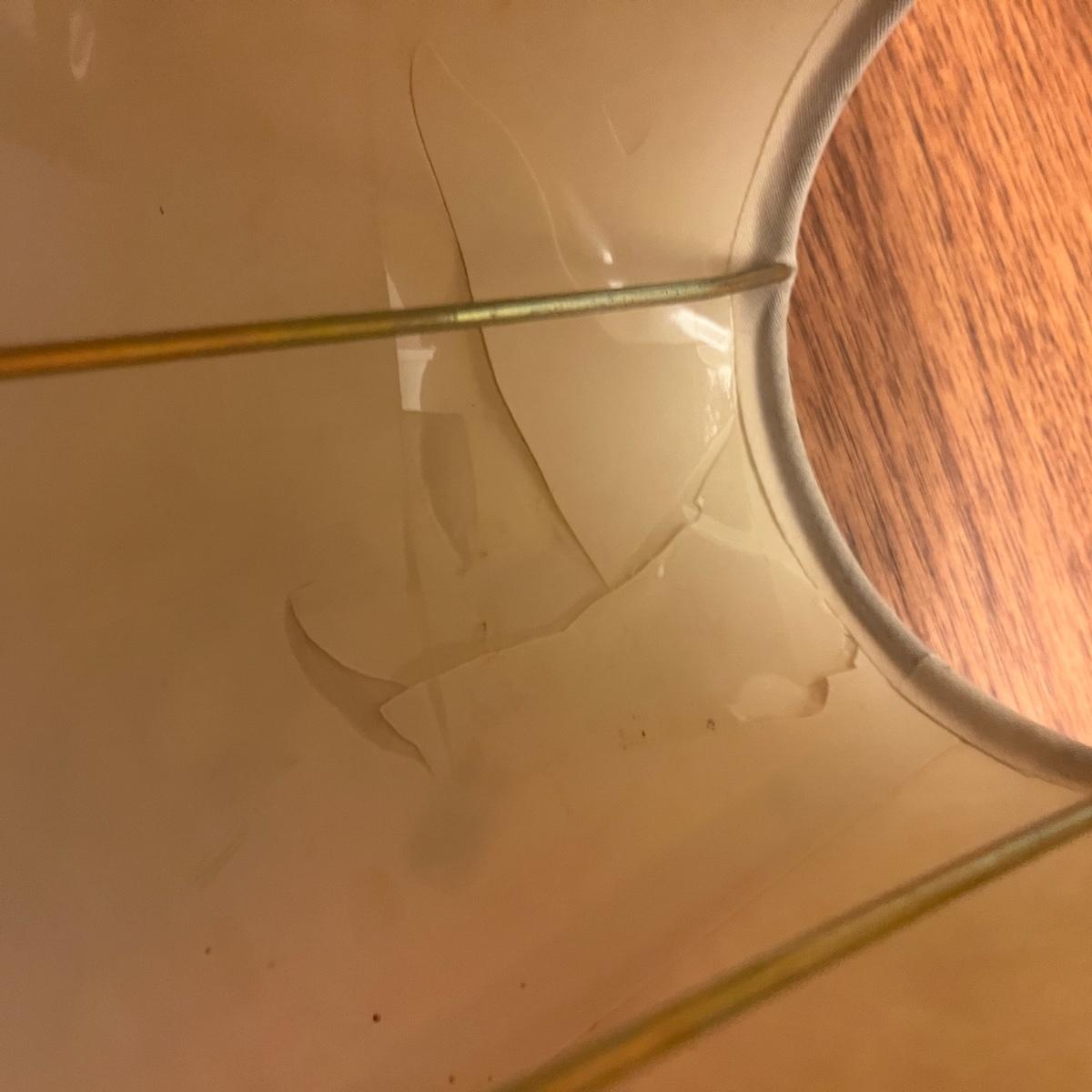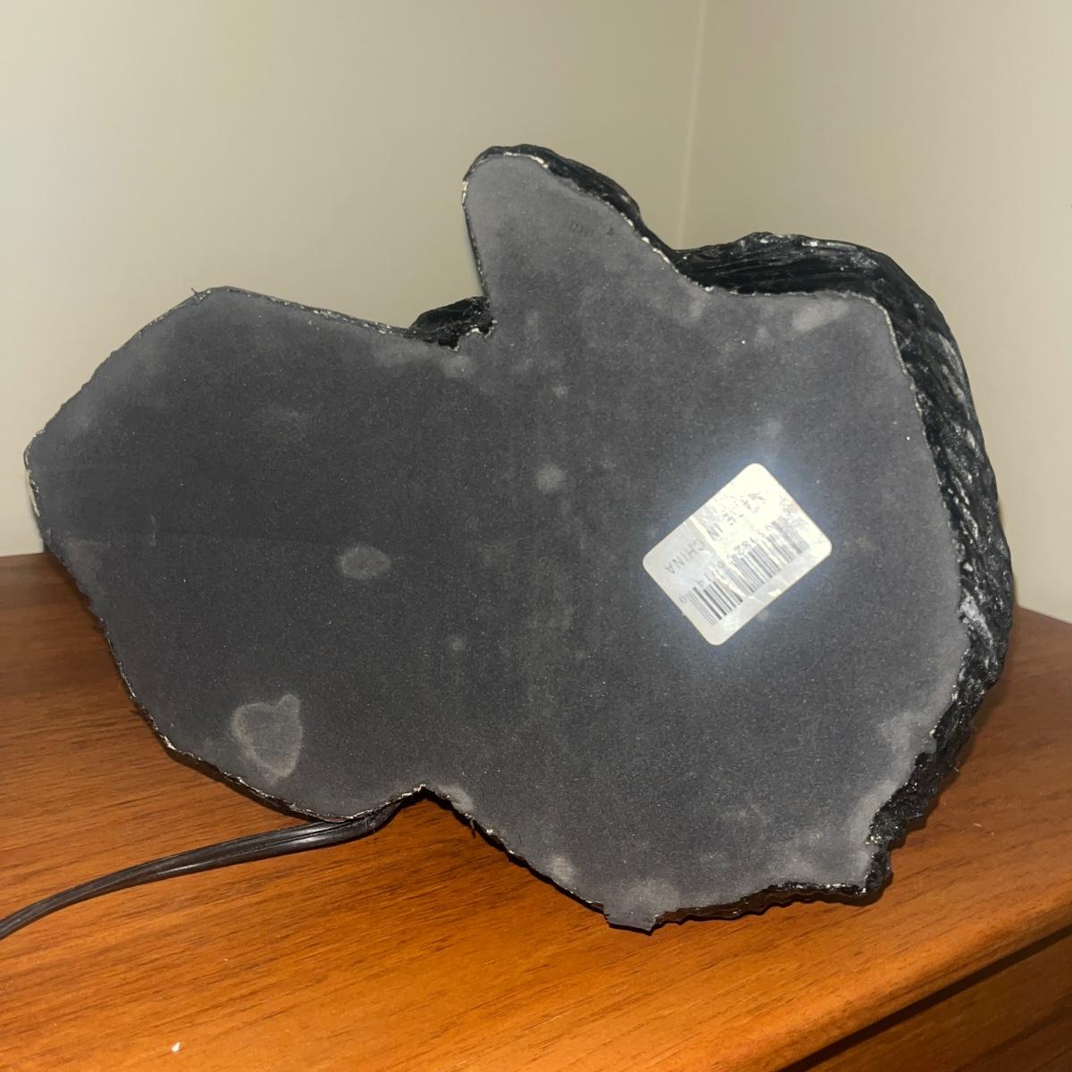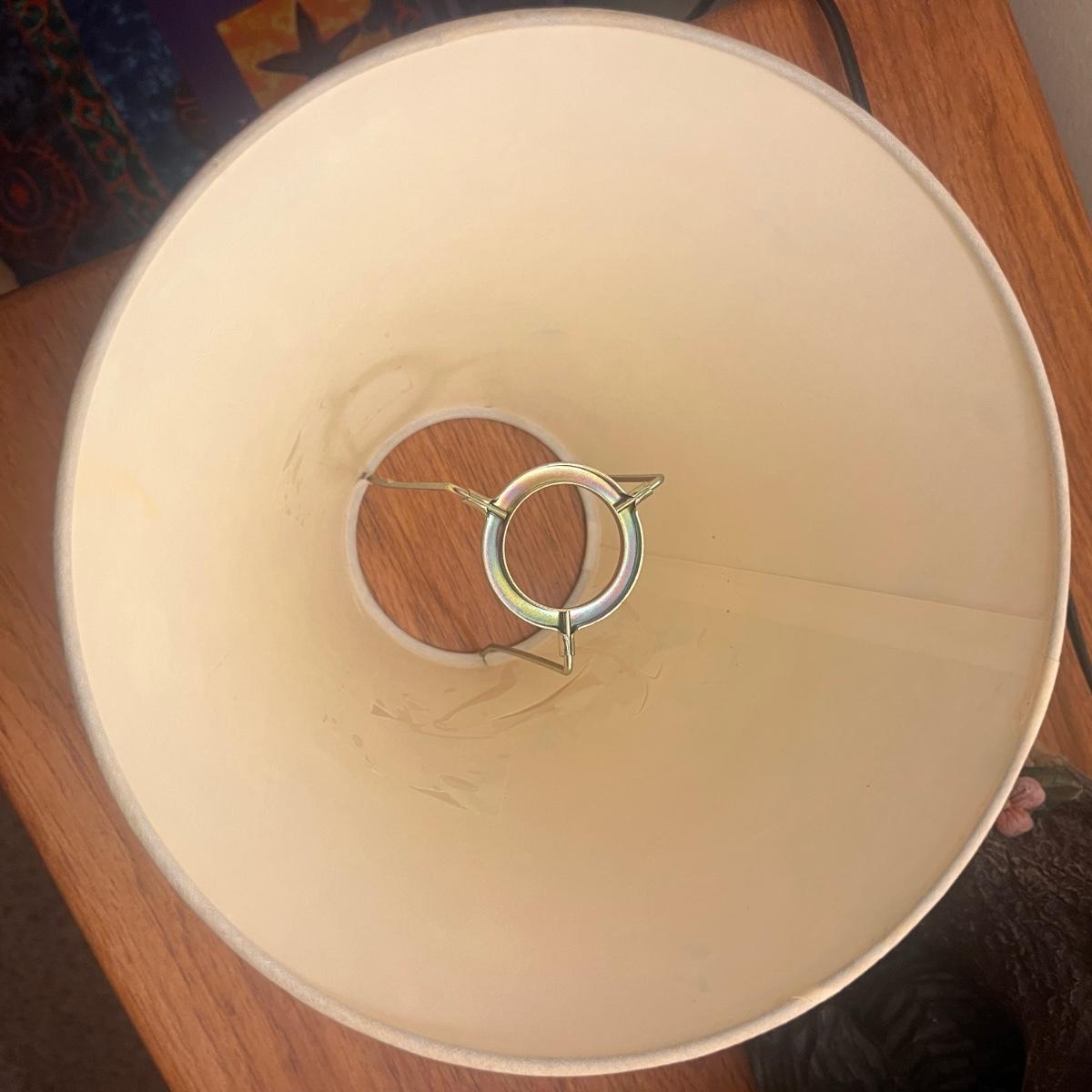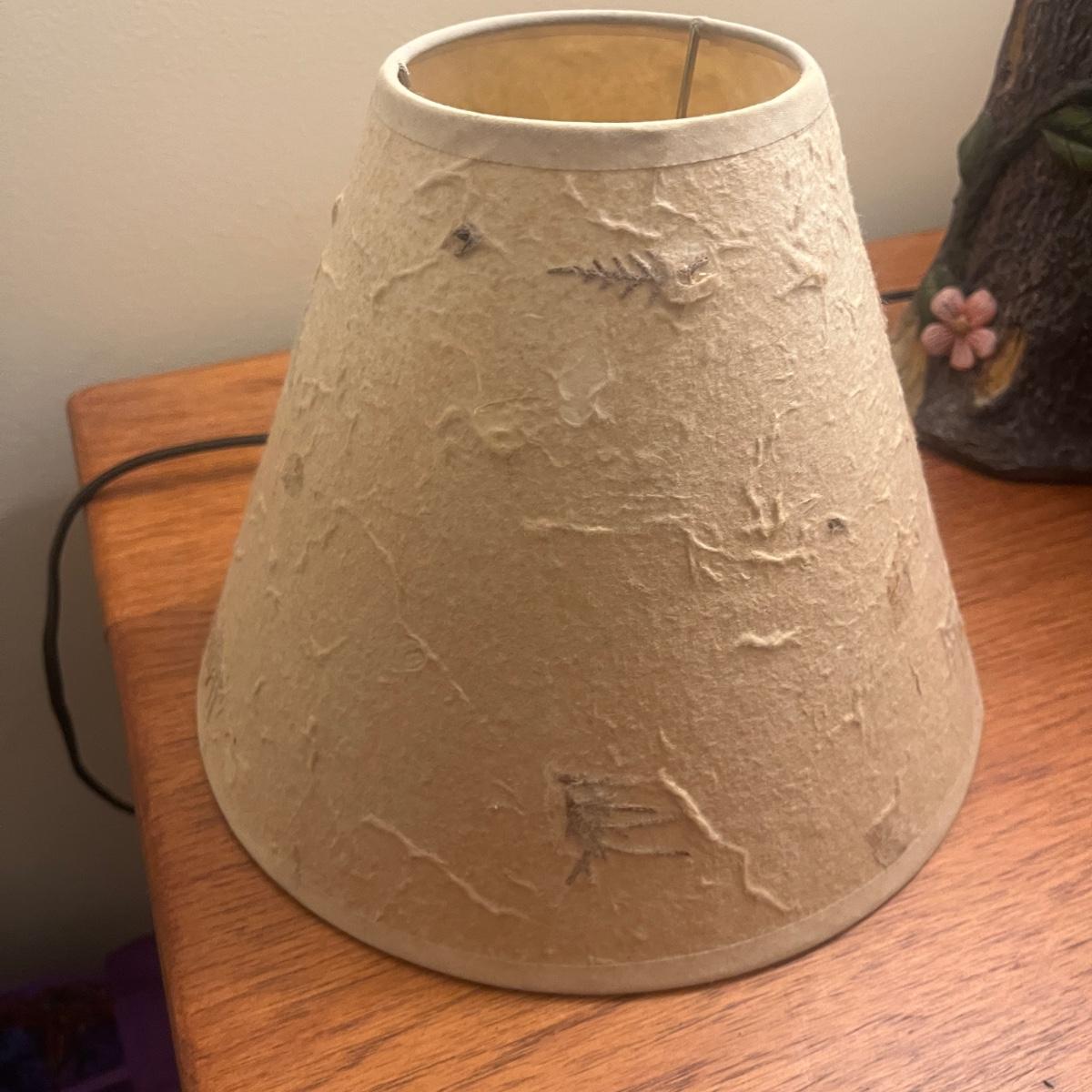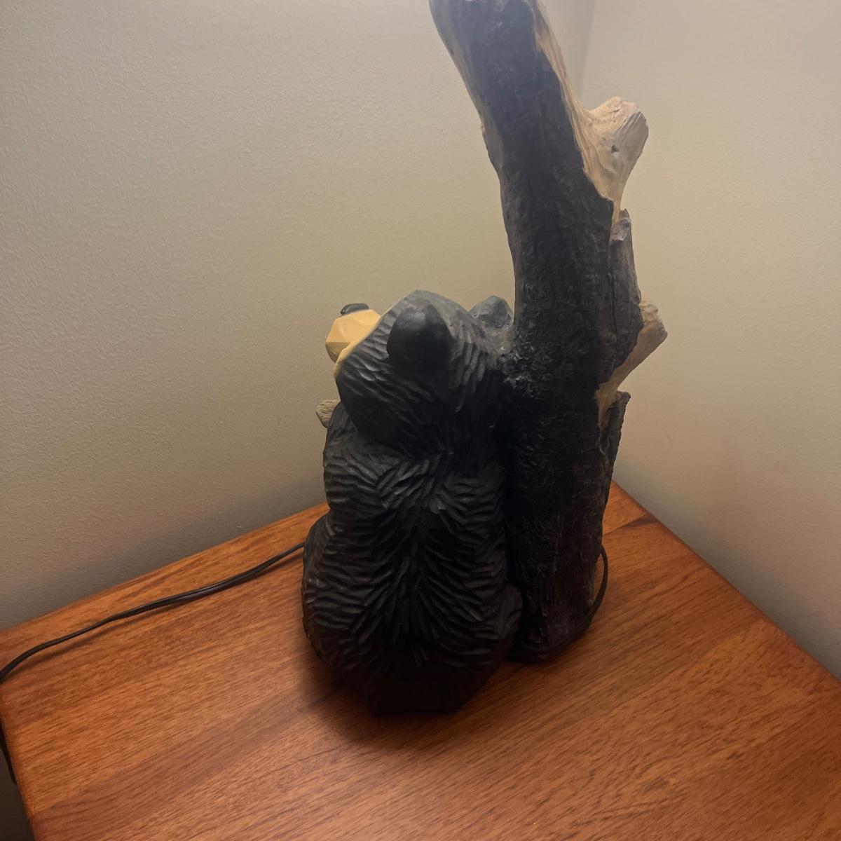 Lot includes a bear table lamp with inline on/off switch. Lamp powered on when plugged in. Lamp measures 12” x 9” x 26”H not including shade. Shade has damage on inside, see pictures. Lamp appears to be made of resin.