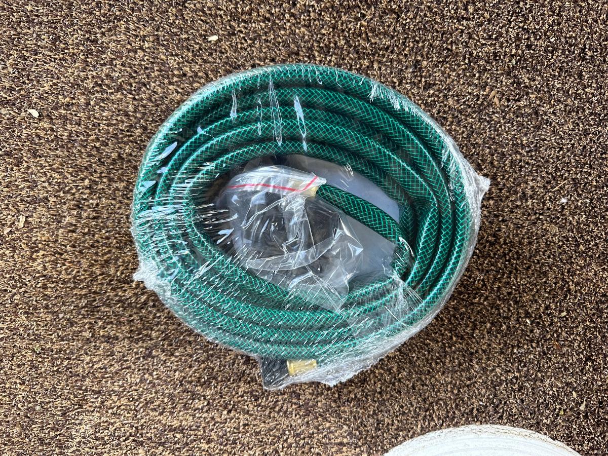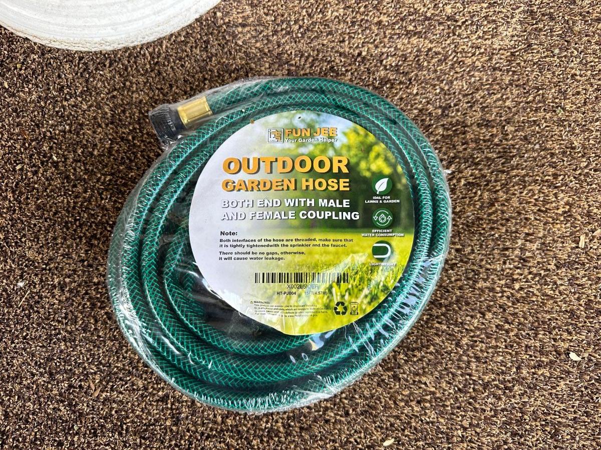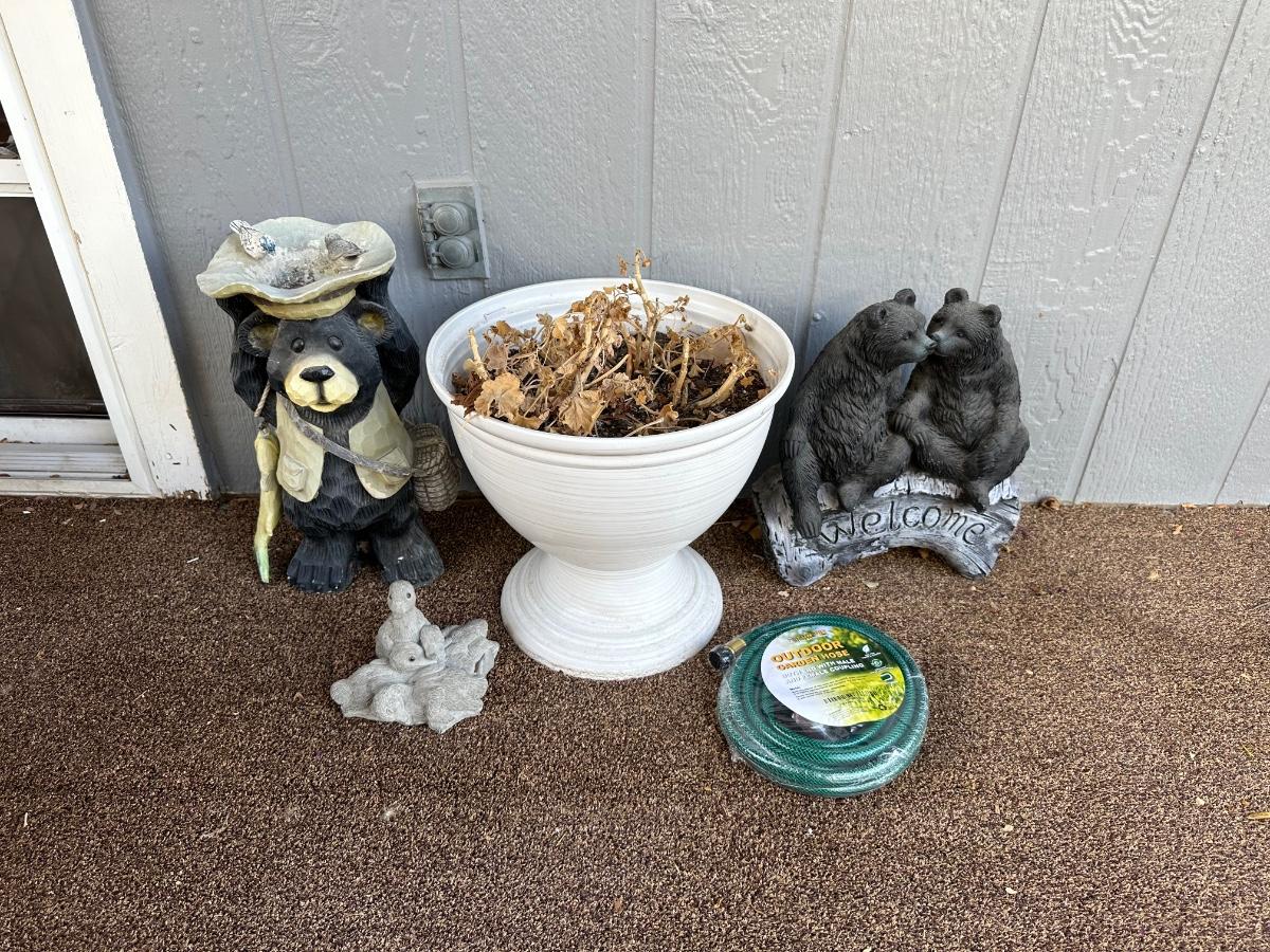BEAR YARD ART, FLOWER POT AND GARDEN HOSE