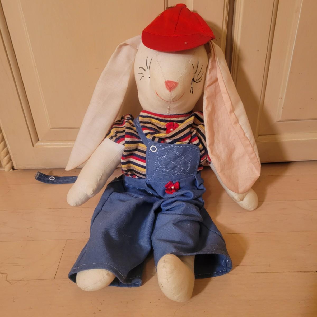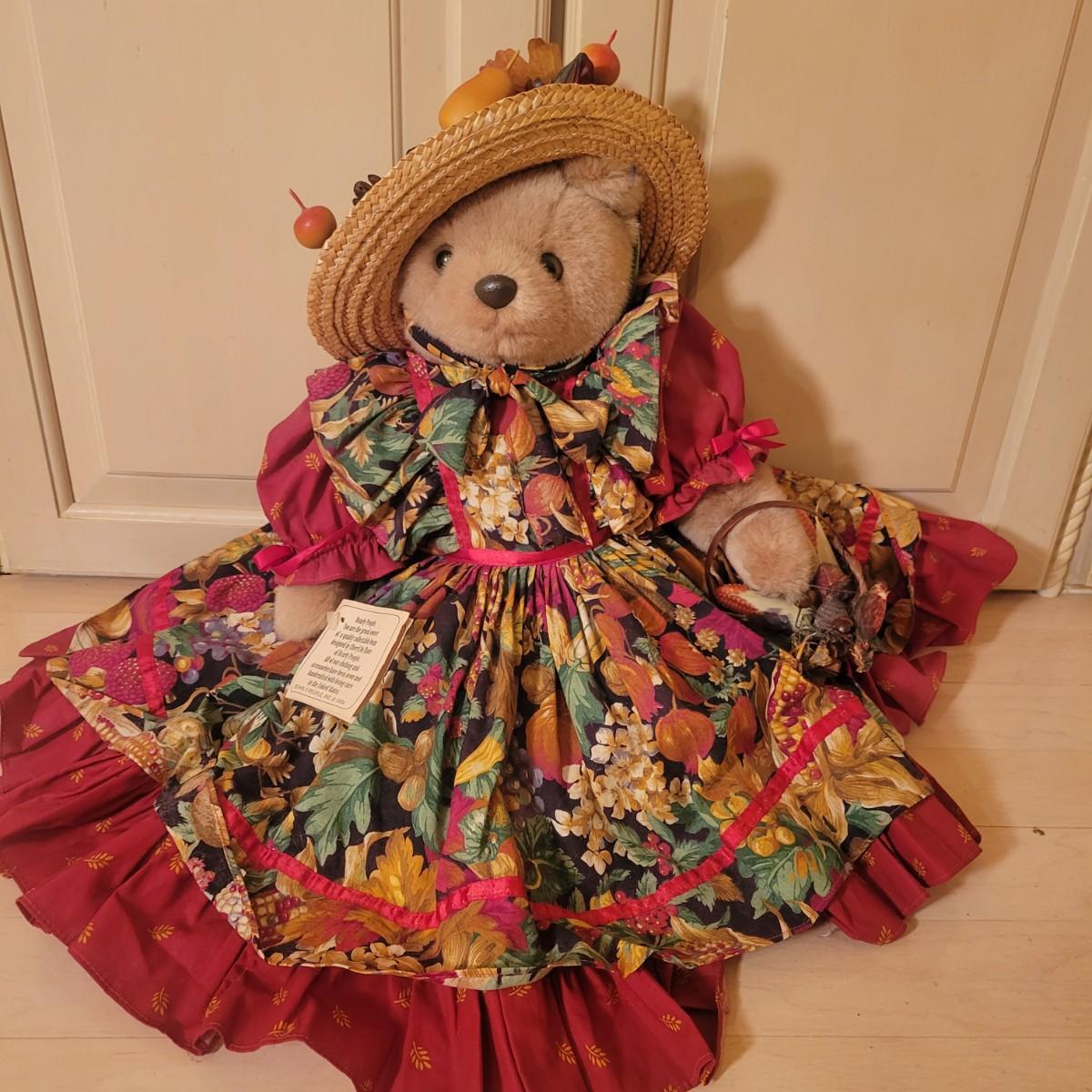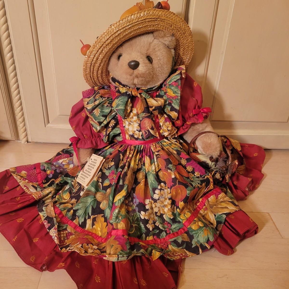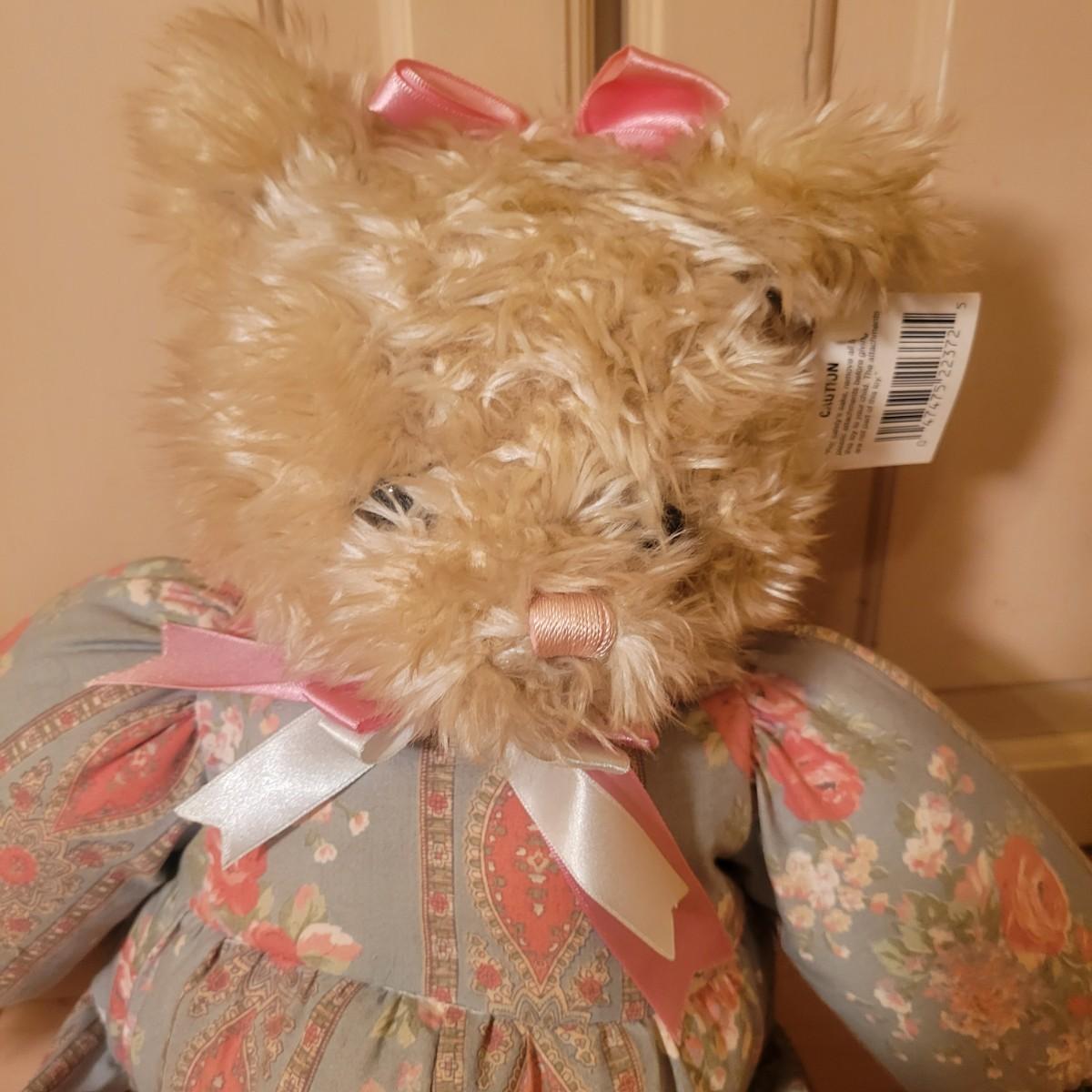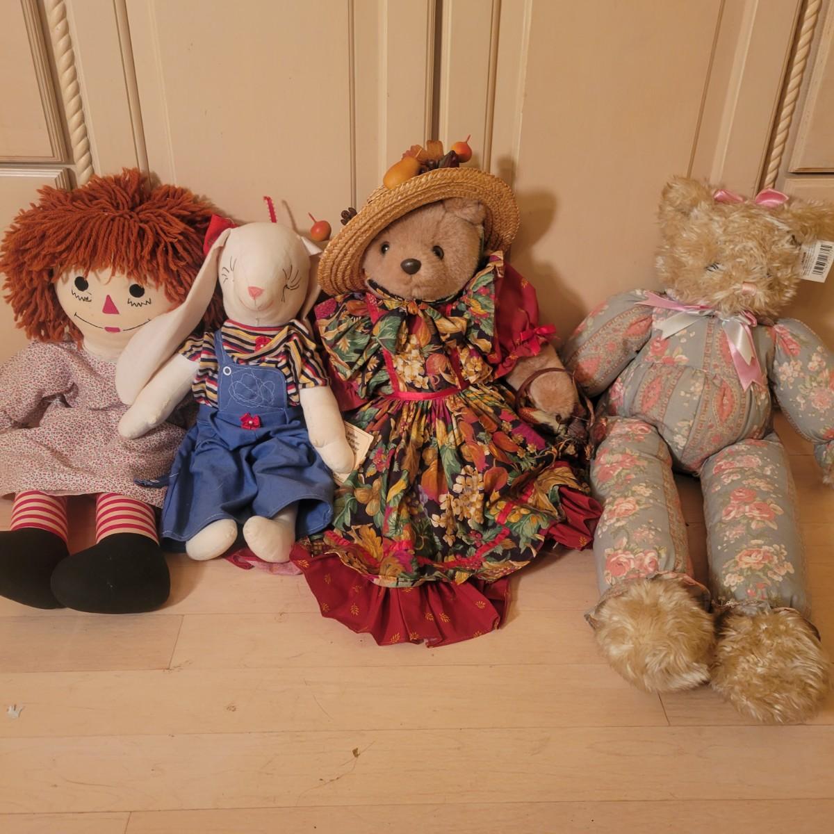 An assortment of four stuffed animals all in good condition. Included is a Bearly People bear with a decorative dress, hat and basket. A stuffed bear with soft, silky fur wearing floral green and pink outfit. Also includes a classic Raggedy Anne and a rabbit with a cap and overalls. Overalls do have a missing button. The largest bear measures approximately 28" long. Shipping available