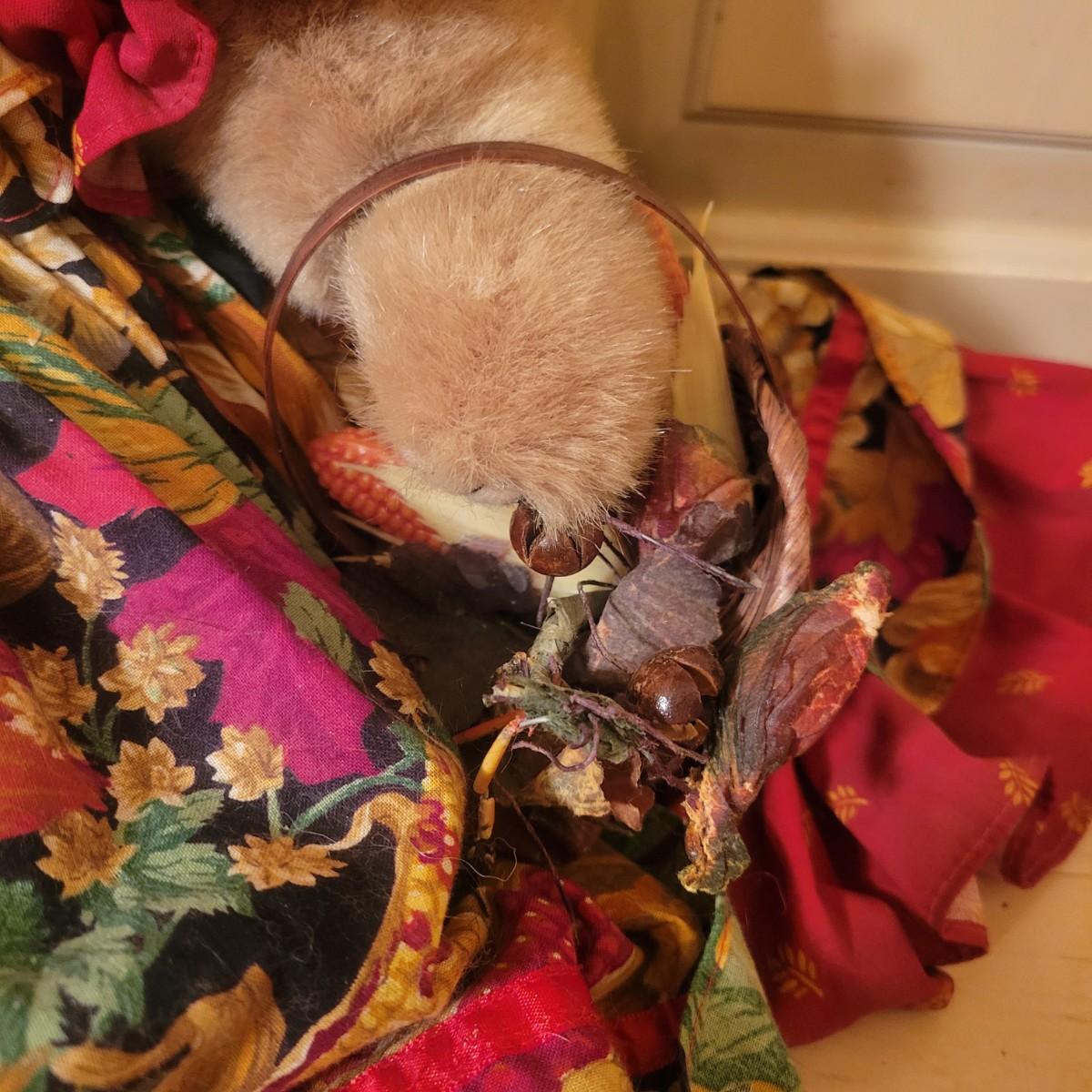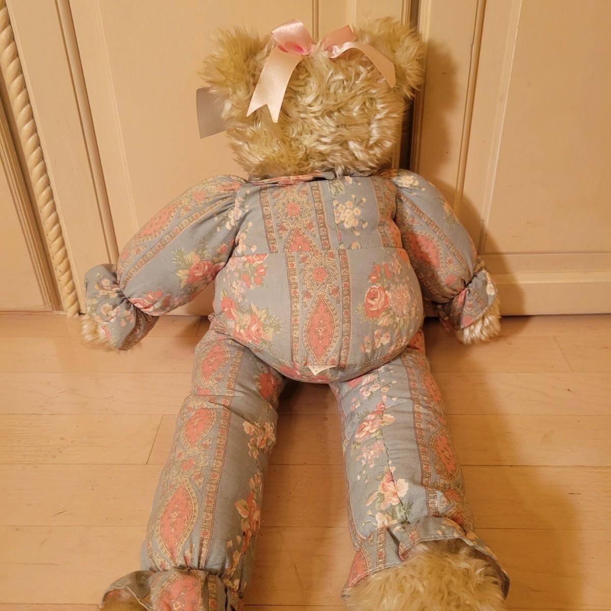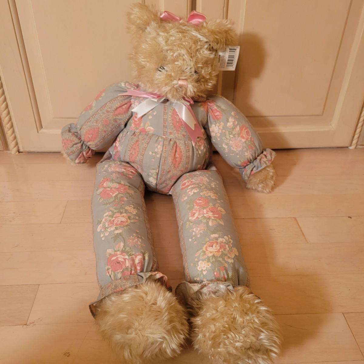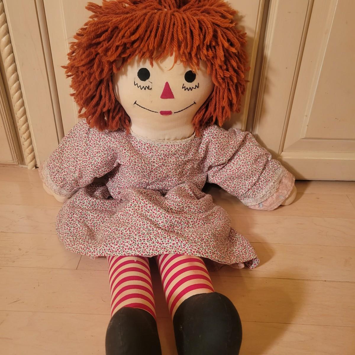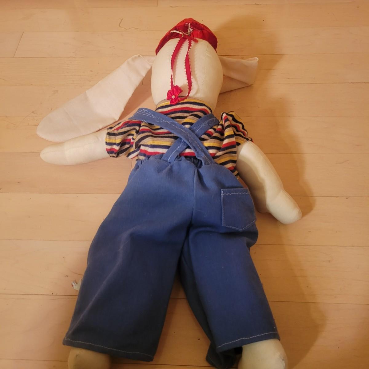 An assortment of four stuffed animals all in good condition. Included is a Bearly People bear with a decorative dress, hat and basket. A stuffed bear with soft, silky fur wearing floral green and pink outfit. Also includes a classic Raggedy Anne and a rabbit with a cap and overalls. Overalls do have a missing button. The largest bear measures approximately 28" long. Shipping available
