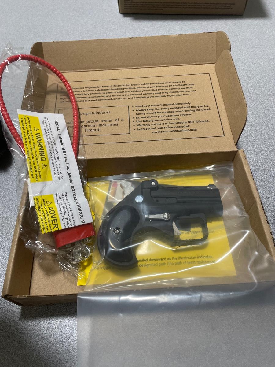 This Bearman Big Bore Derringer is ideal for personal protection and extremely easy to conceal. This model features a two-round capacity of 9mm that packs a punch and is incredibly reliable. The finish on this model is Black. If you are looking for the ideal deep-conceal carry firearm, then this is it!