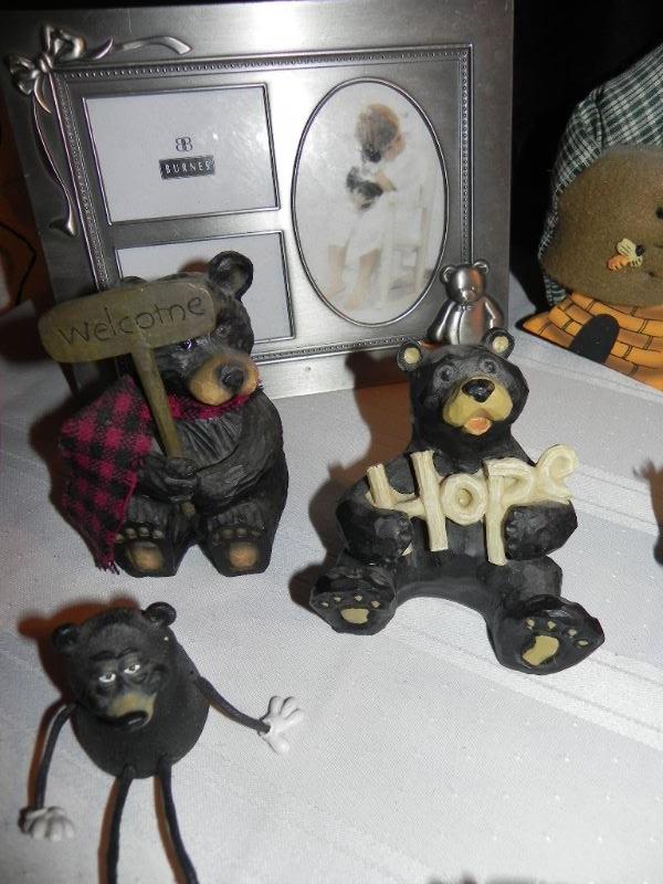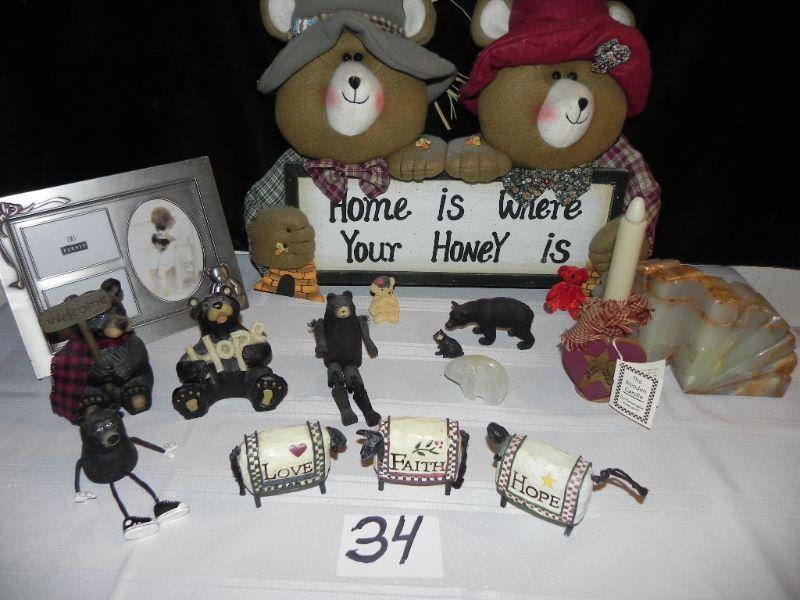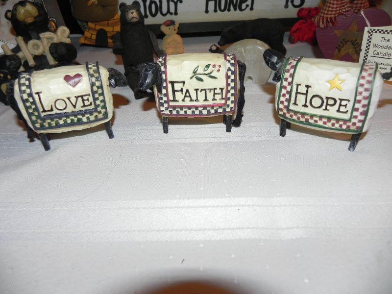 Decorative bears in various shape & size, hanging sign, solid rock bookends, photo frame, wood candle, Love/Faith/Hope sheep