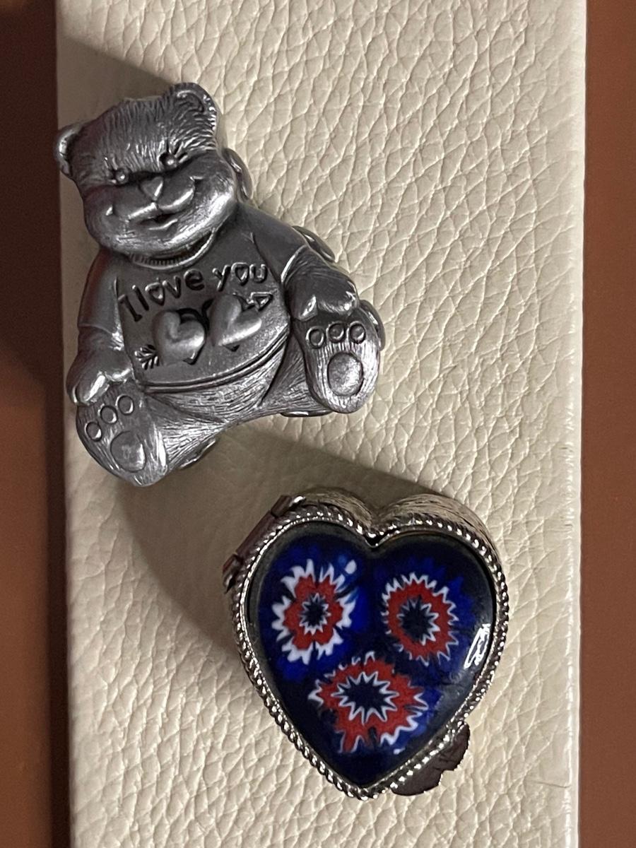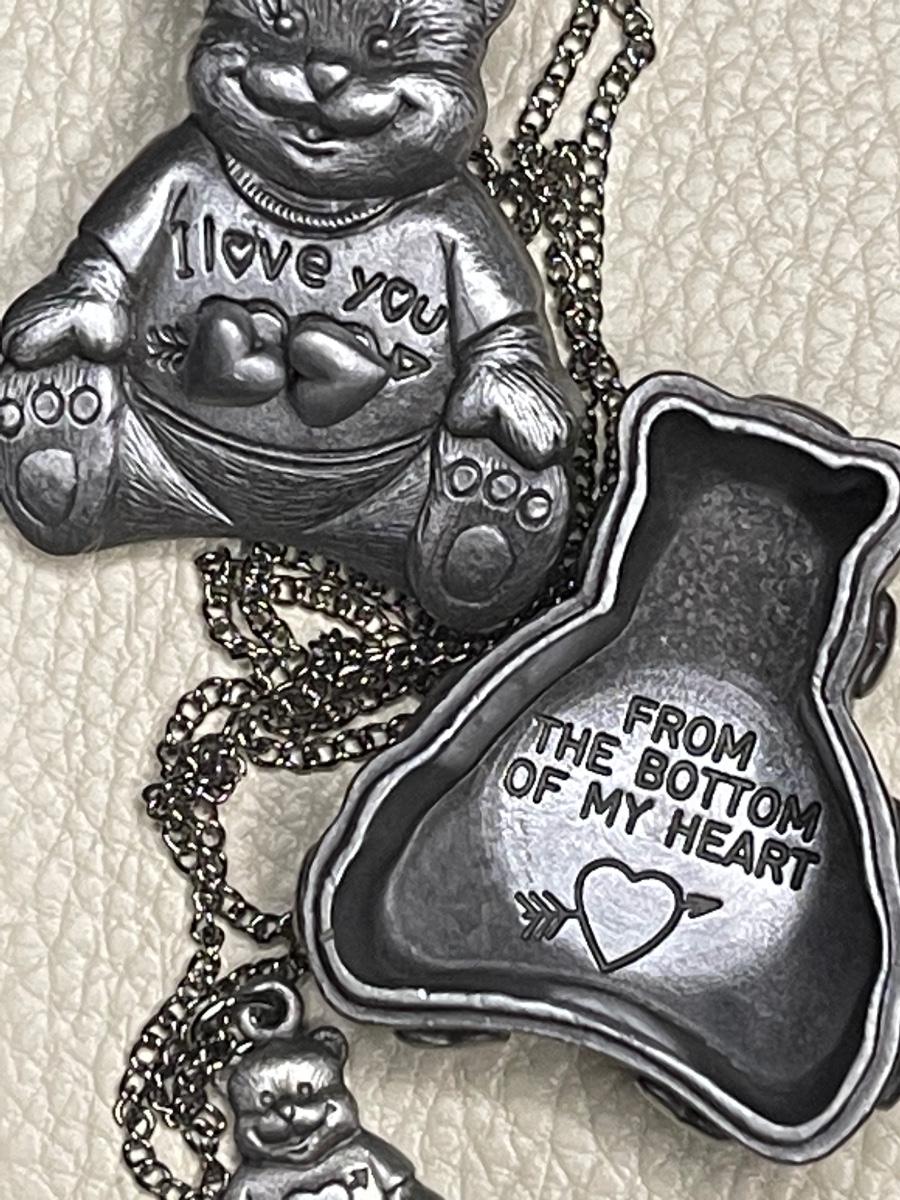 Ms. Dee bear is made out of pewter this is a very special and unique trinket box not only do u have a trinket box but u get a pair of earrings and necklaces