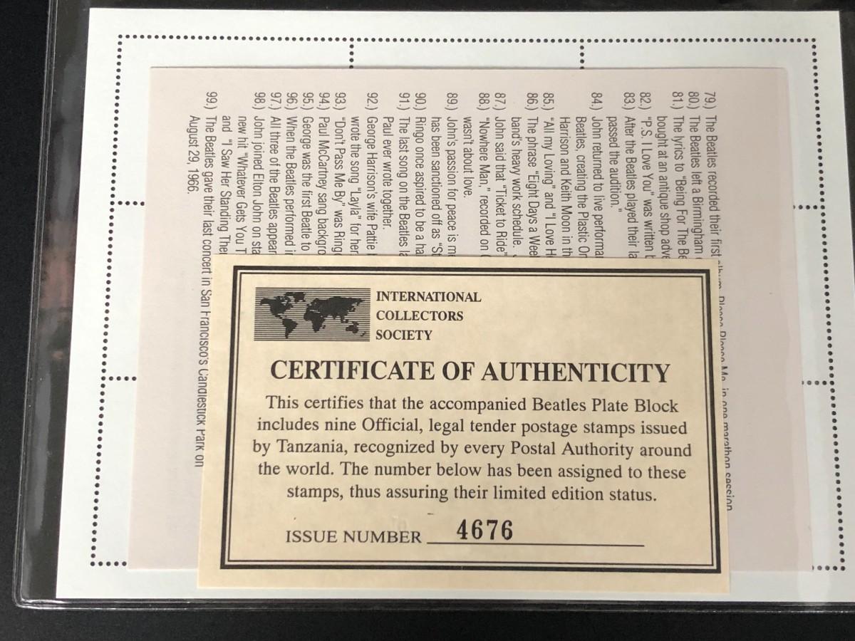 Set of Beatles Tanzania stamps! In mint condition. Includes Certificate of Authenticity from the International Collectors Society.