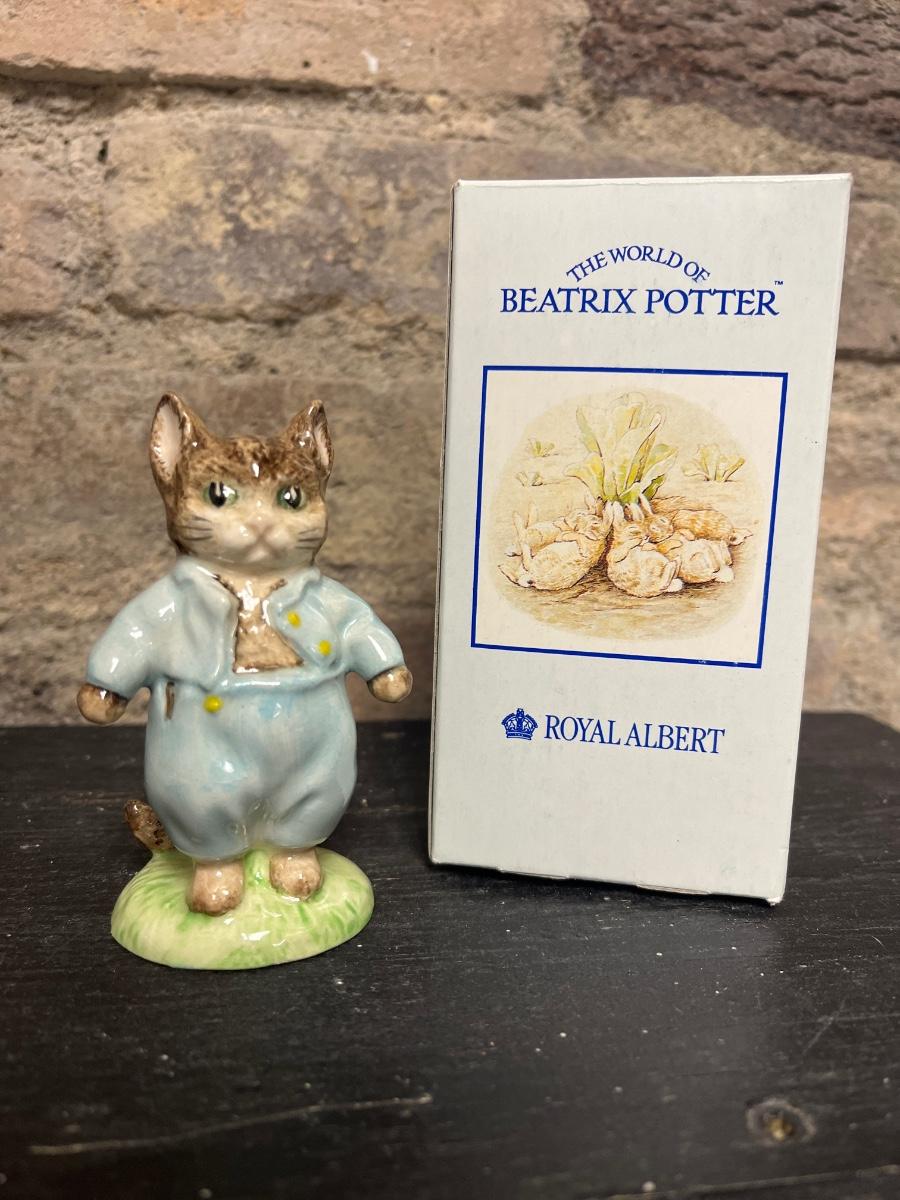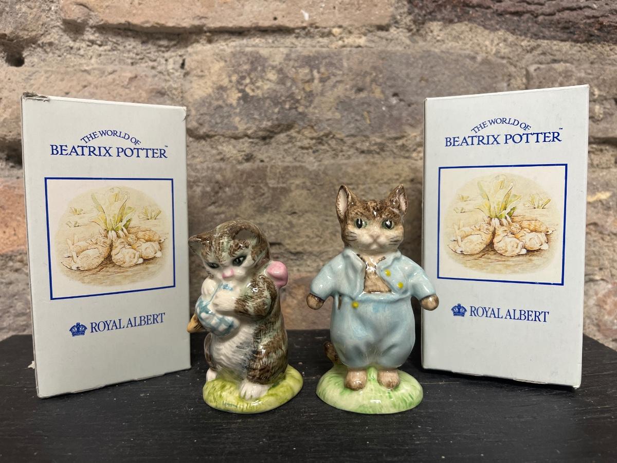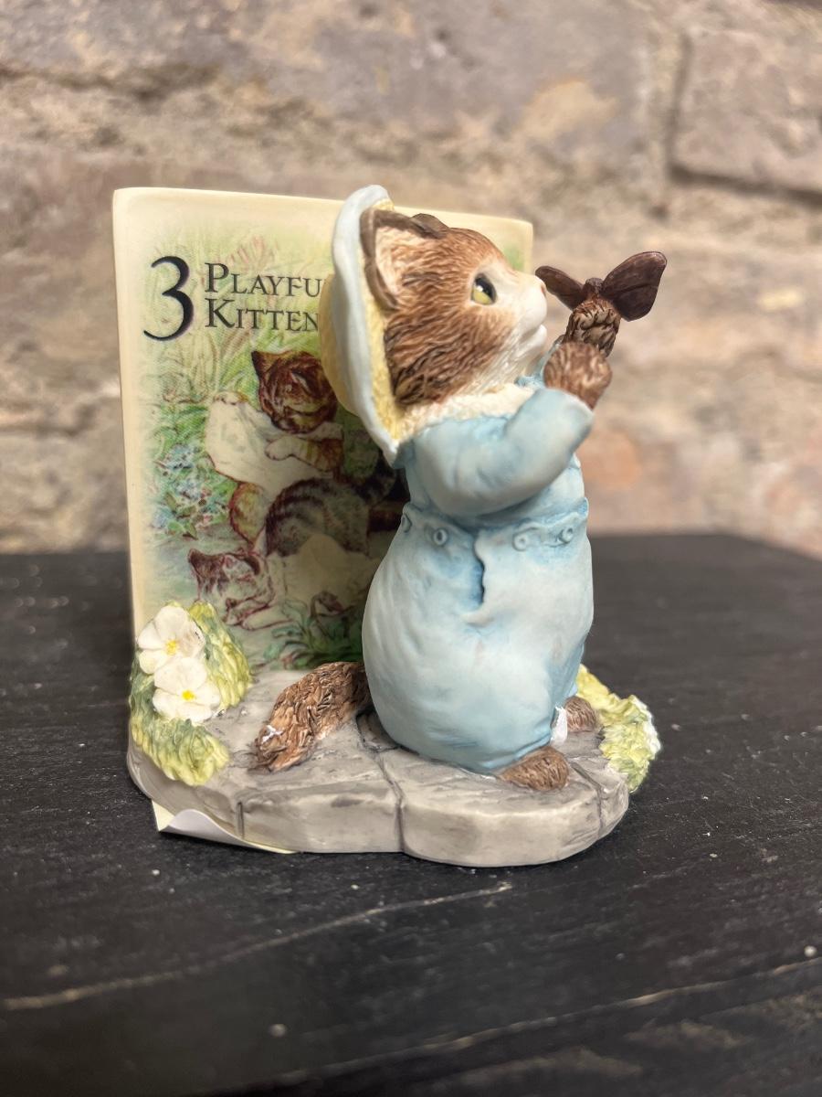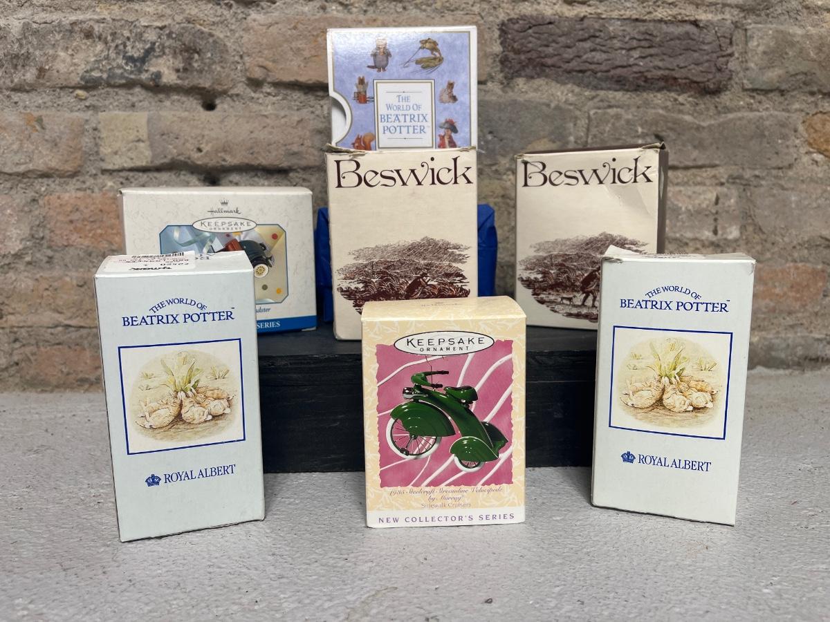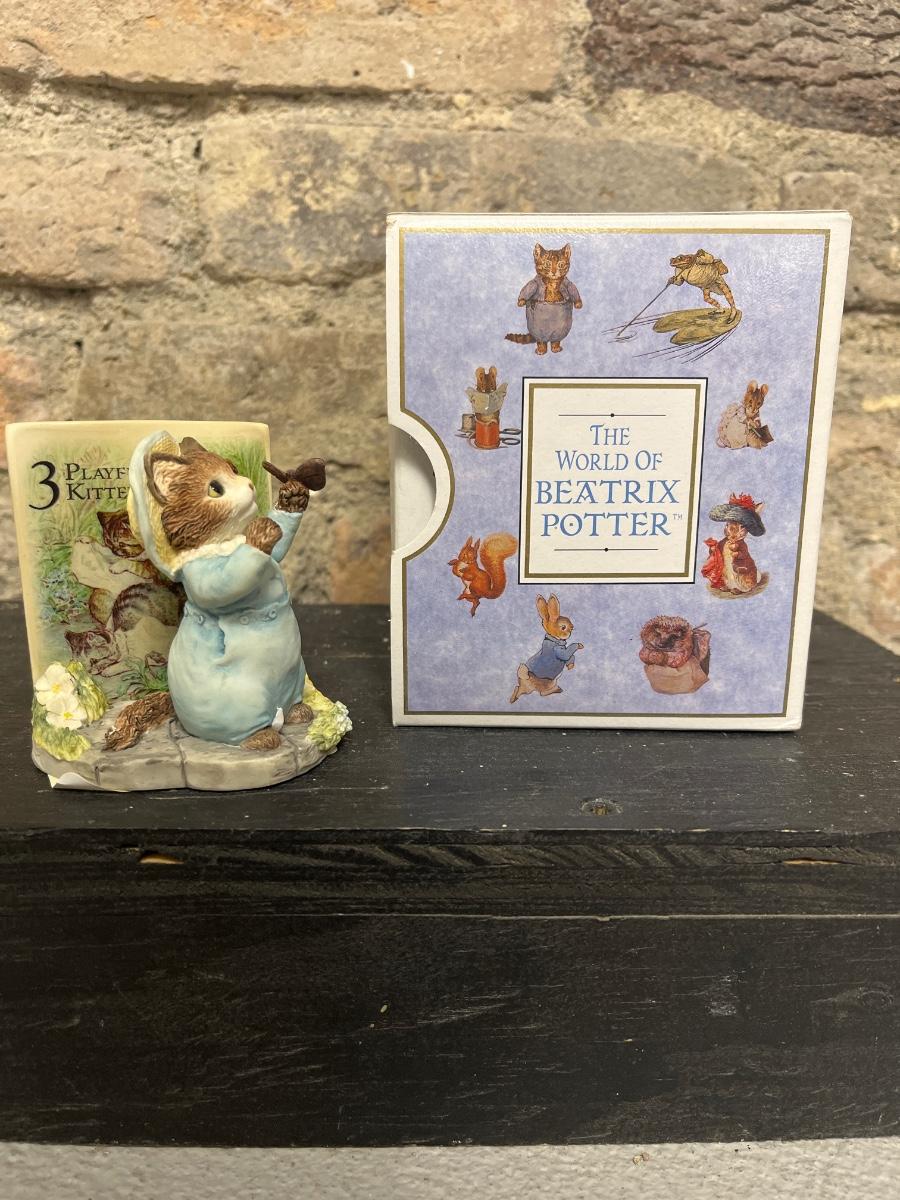 World of Beatrix Potter figurines including Playful Kitten, Mama and Bunnies, Flopsy, Mopsy and Cottontail, Miss Moppet and Tom Kitten, and Hallmark Roadster and Tricycle keepsakes