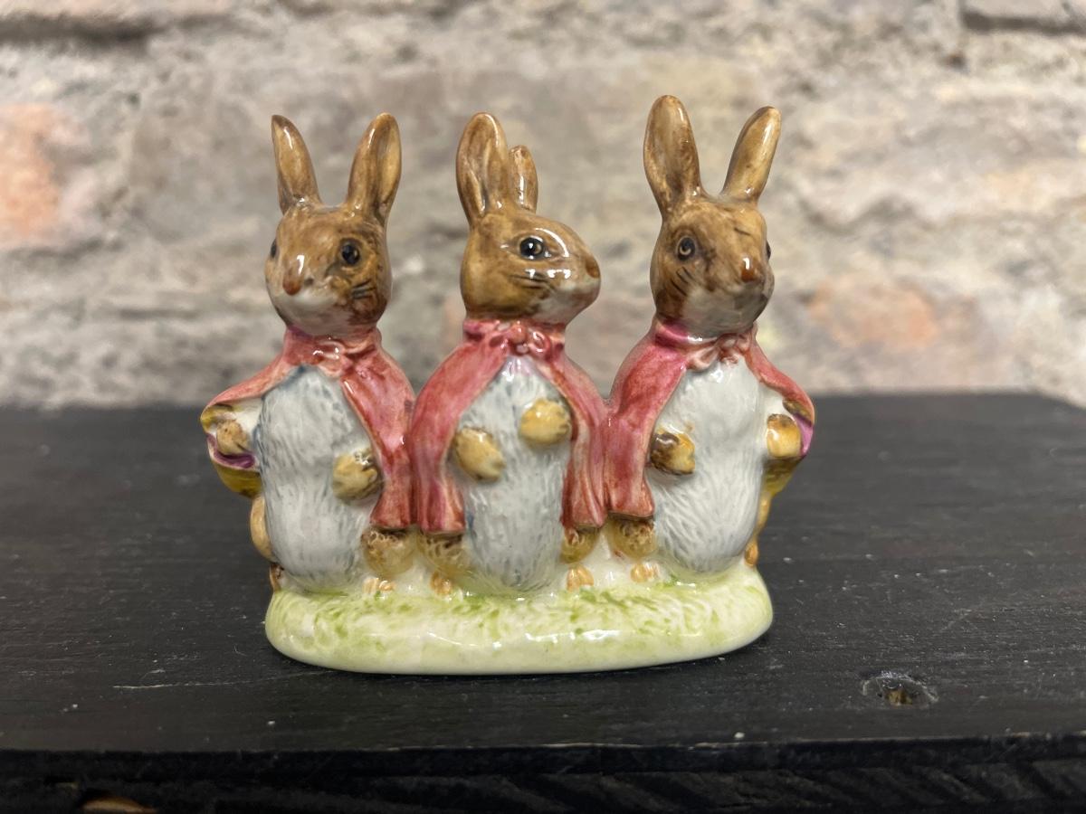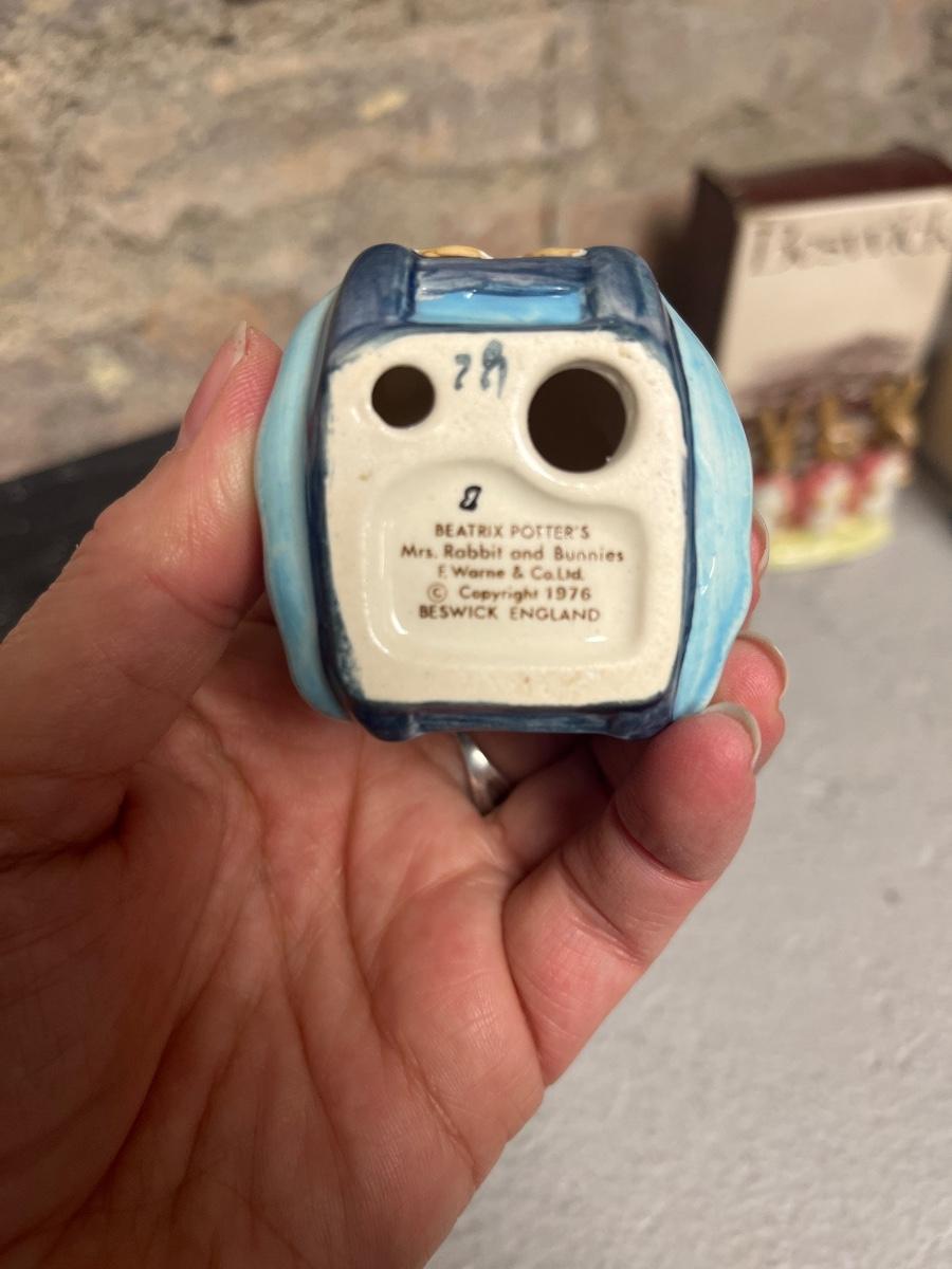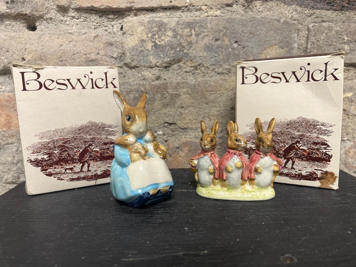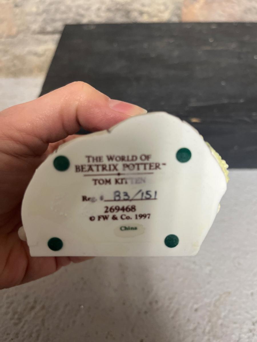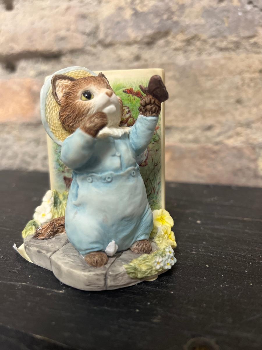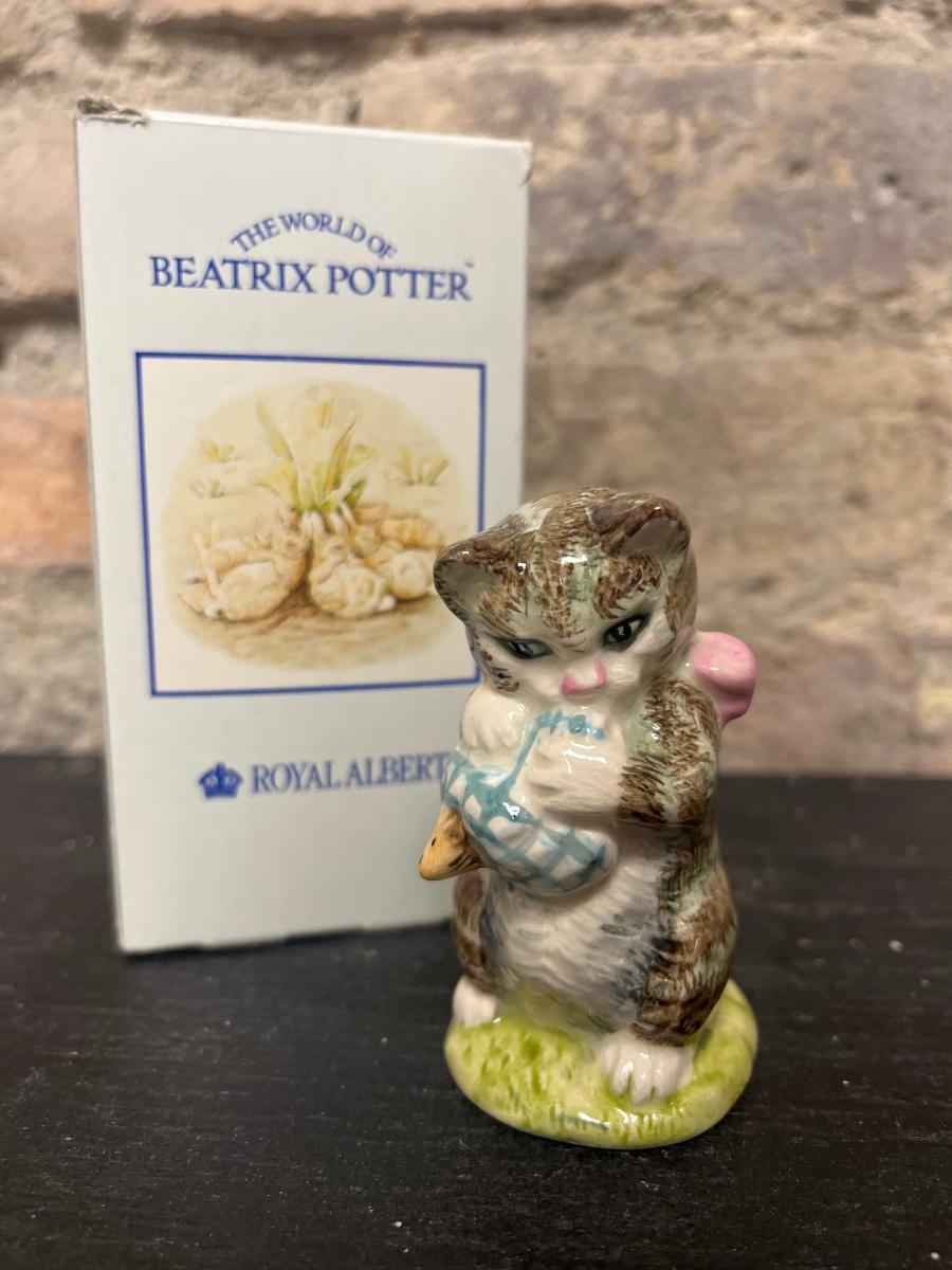 World of Beatrix Potter figurines including Playful Kitten, Mama and Bunnies, Flopsy, Mopsy and Cottontail, Miss Moppet and Tom Kitten, and Hallmark Roadster and Tricycle keepsakes