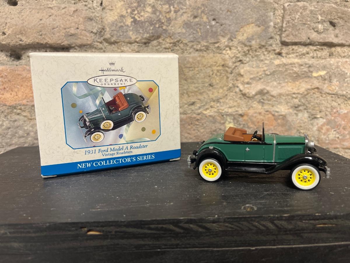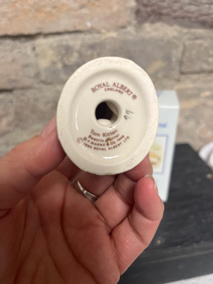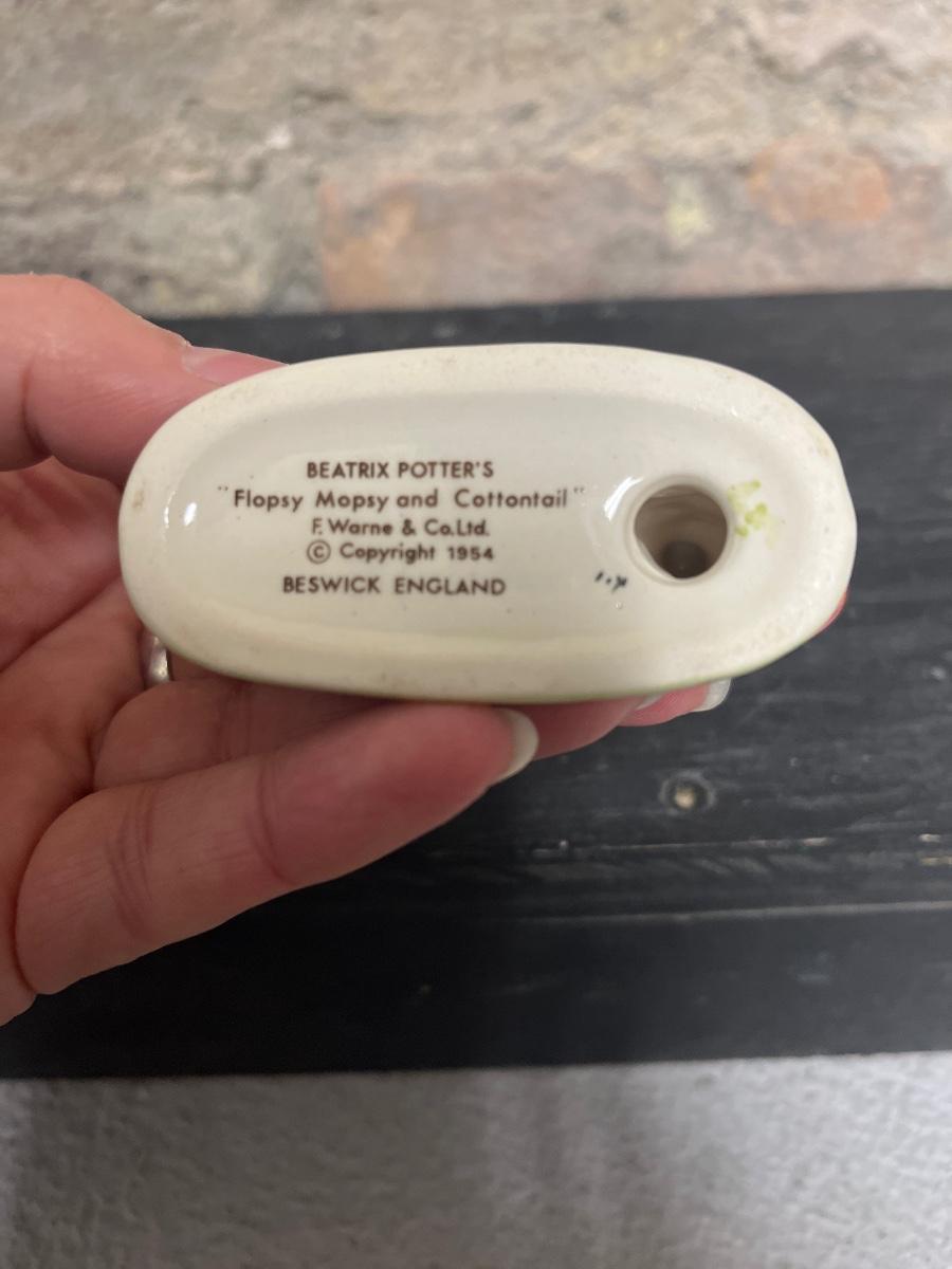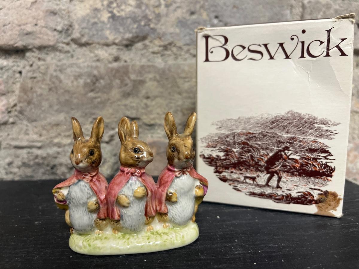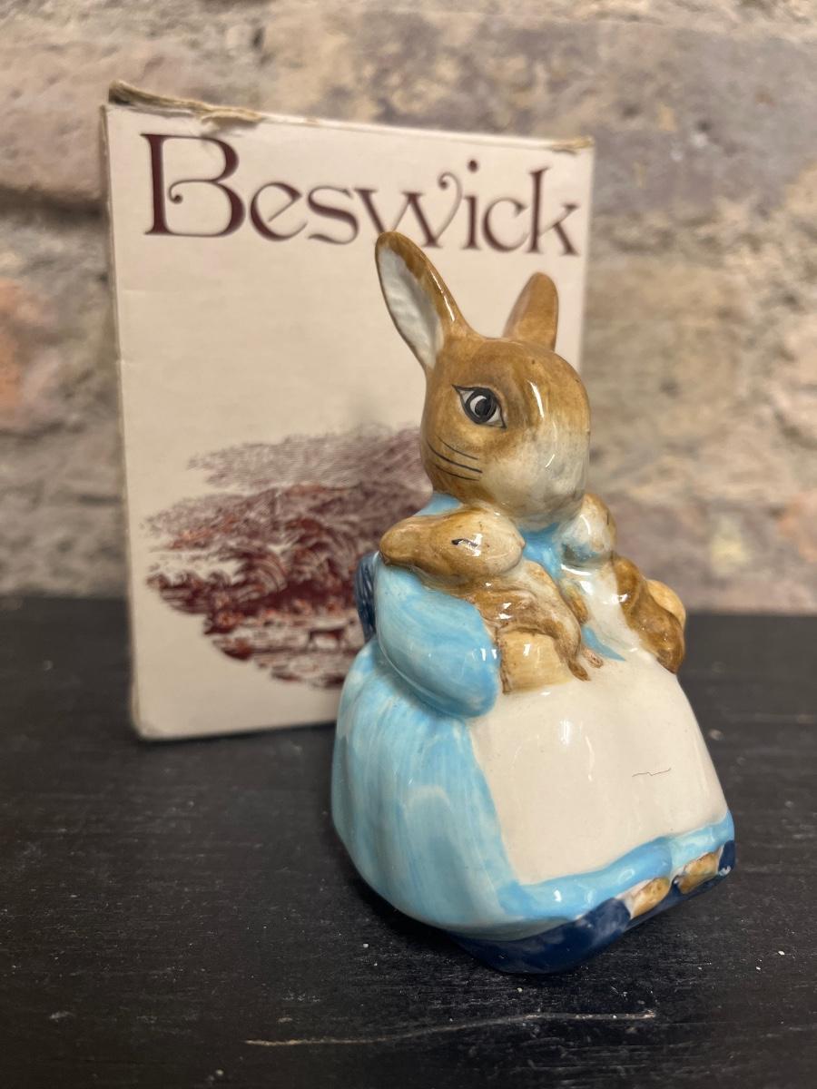 World of Beatrix Potter figurines including Playful Kitten, Mama and Bunnies, Flopsy, Mopsy and Cottontail, Miss Moppet and Tom Kitten, and Hallmark Roadster and Tricycle keepsakes