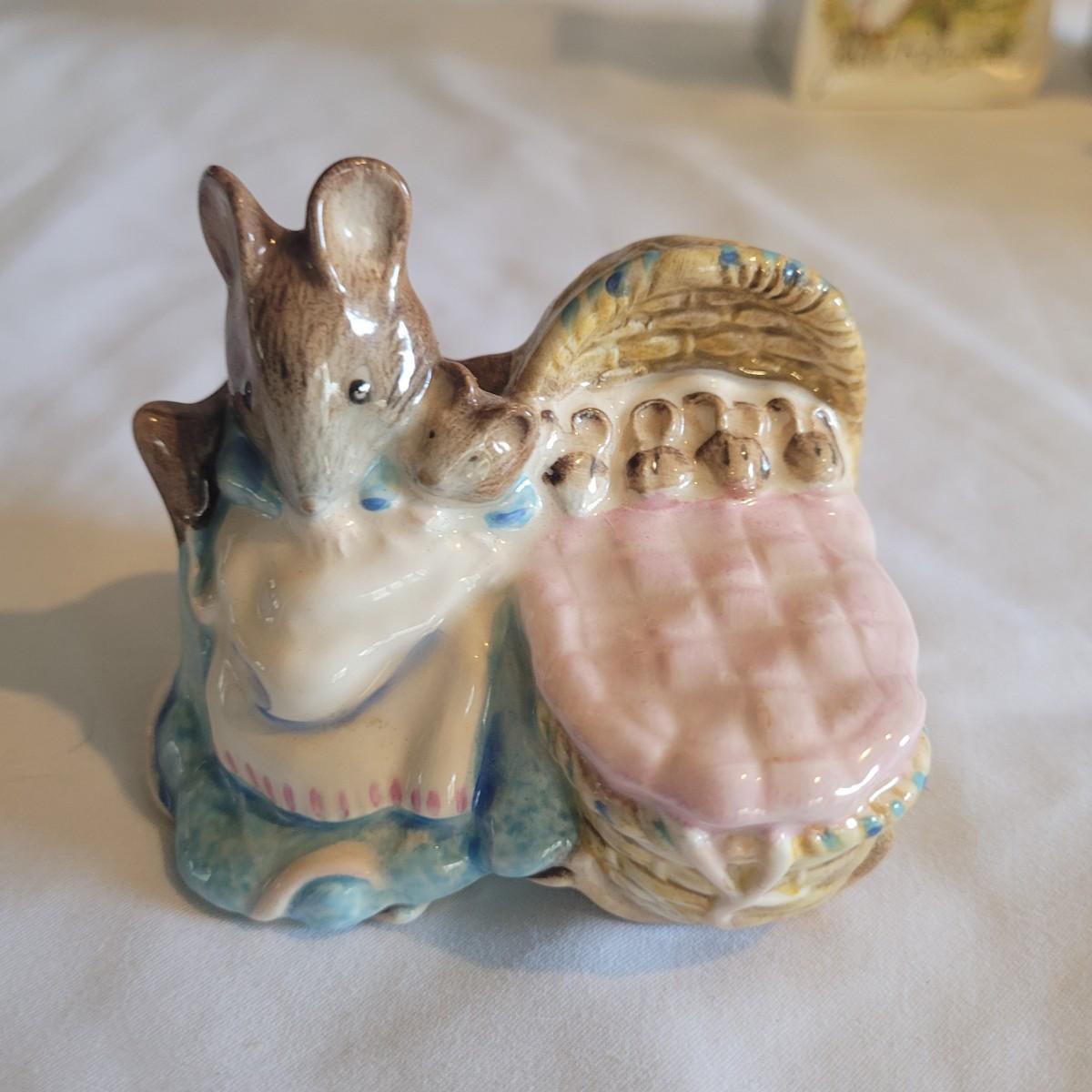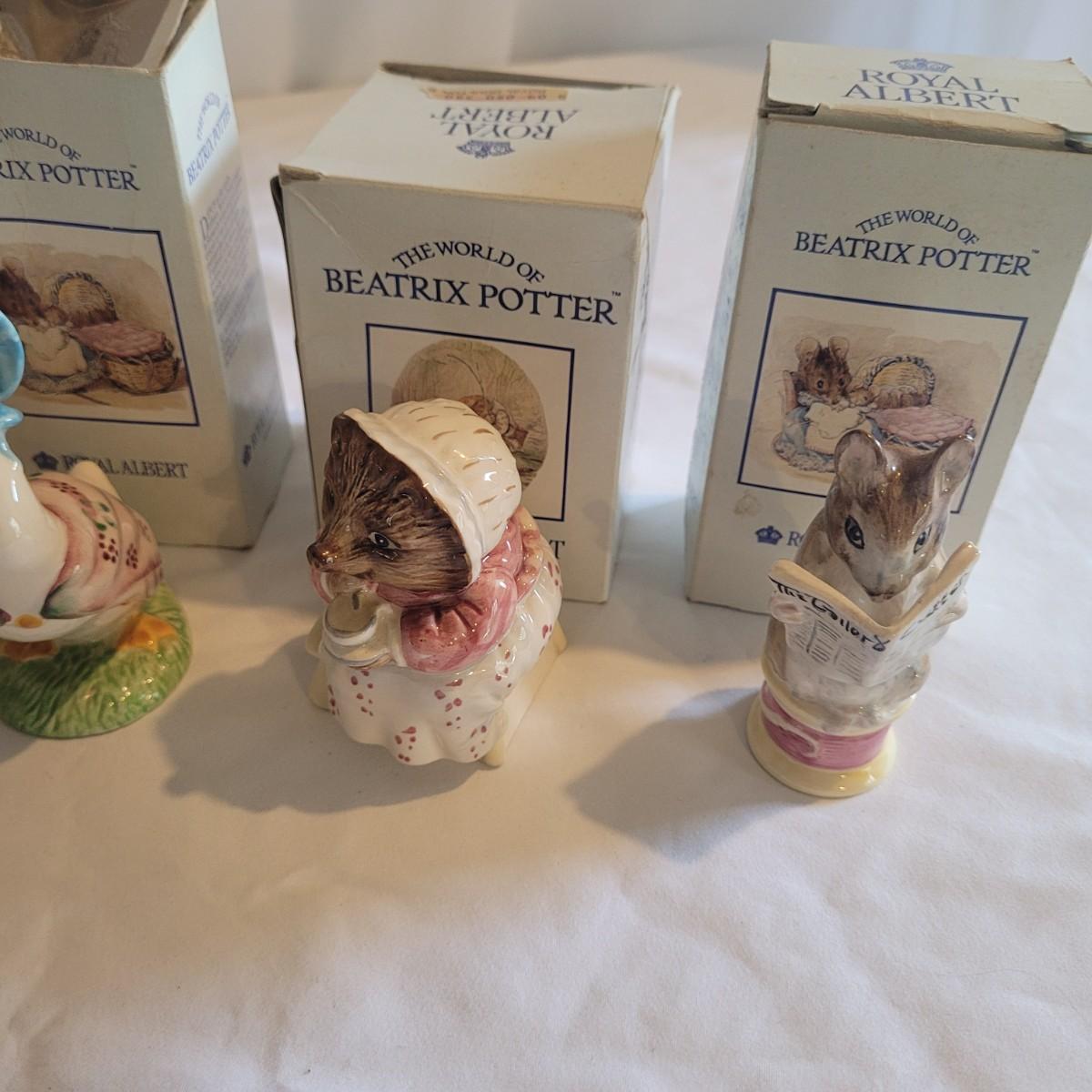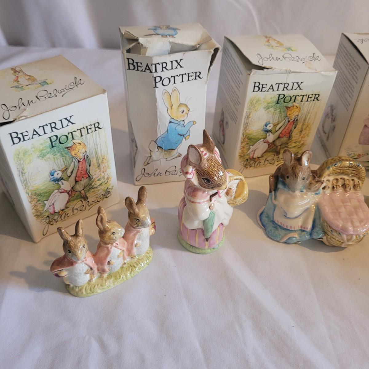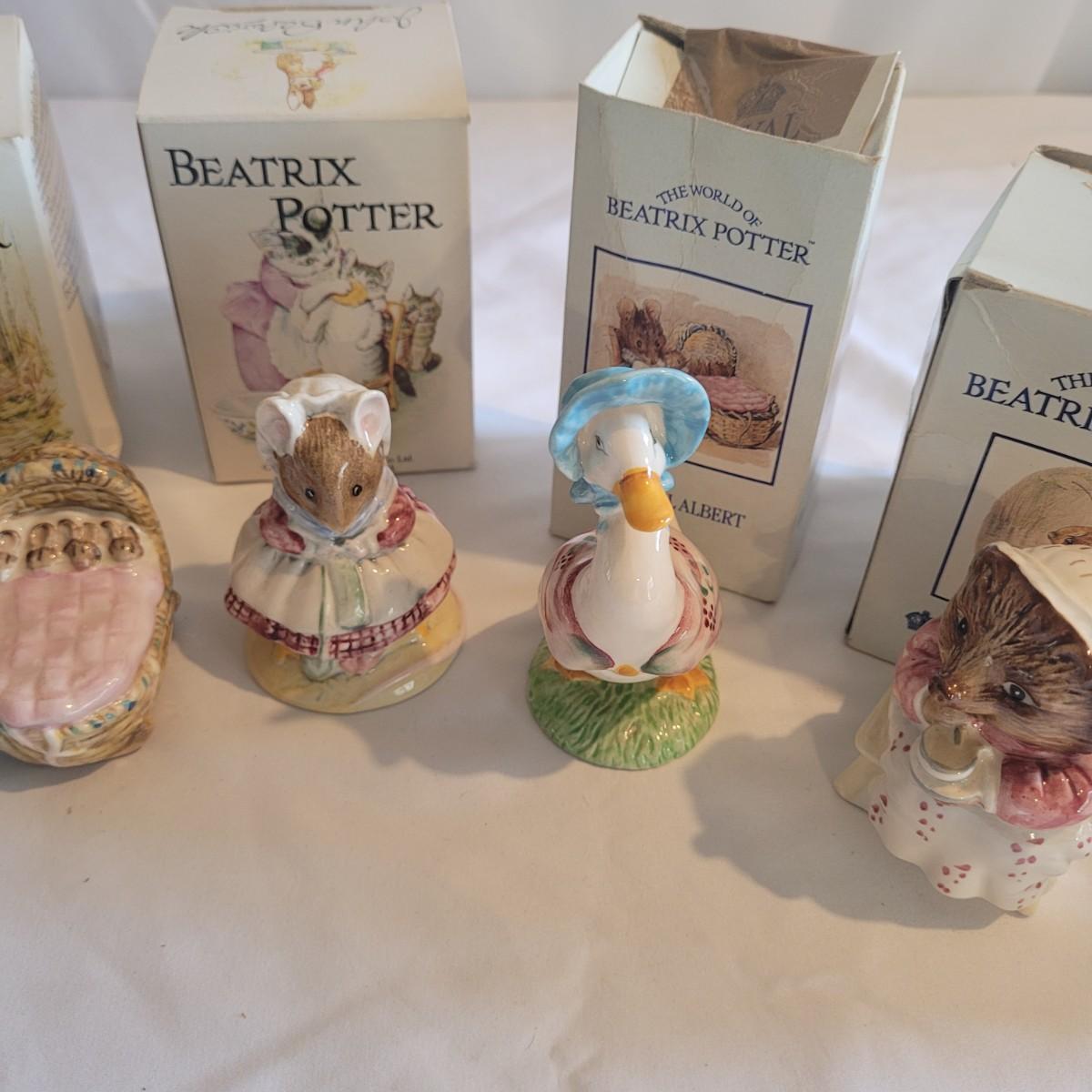 This lo is for seven individual Beatrix Potter porcelain figurines. All boxes are also included with varying degrees of quality. Figurines include "Flopsy, Mopsy and Cottontail", "Mrs. Rabbit", "Hunca Munca", "The Old Woman Who Lived In a Shoe", "Jemima Puddleduck", "Mrs. Tiggy Winkle Takes Tea", and "Tailor of Gloucester". The tallest figurine is 4.5" tall. None of the figurines have any visible damage.