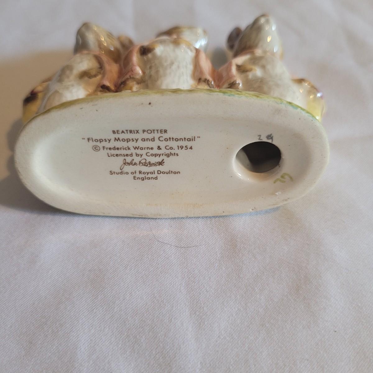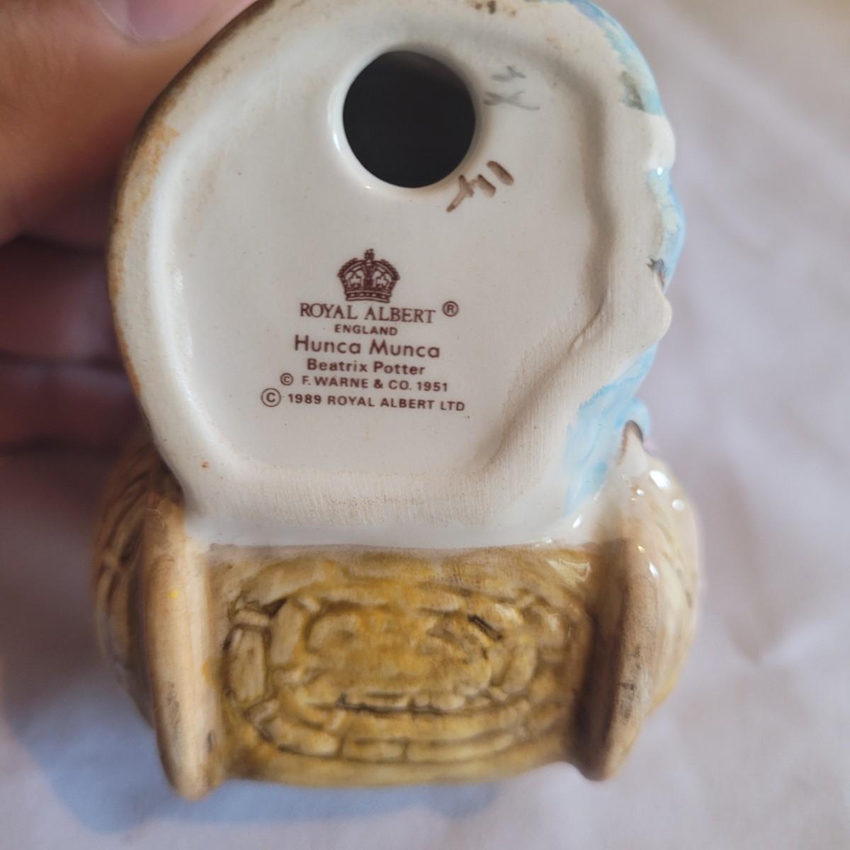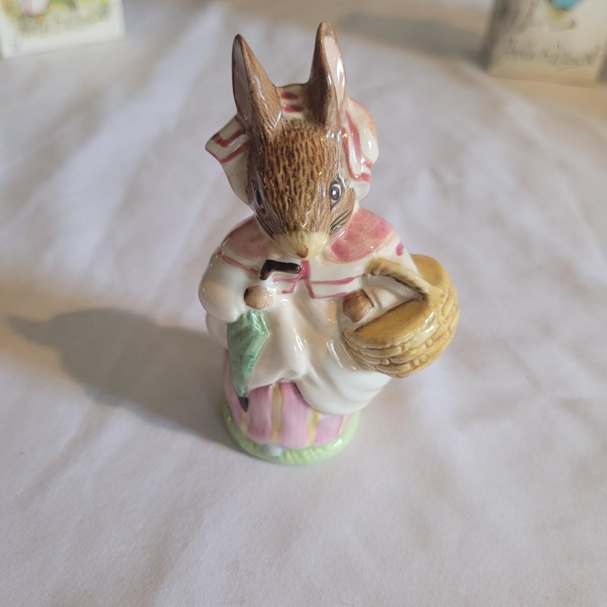 This lo is for seven individual Beatrix Potter porcelain figurines. All boxes are also included with varying degrees of quality. Figurines include "Flopsy, Mopsy and Cottontail", "Mrs. Rabbit", "Hunca Munca", "The Old Woman Who Lived In a Shoe", "Jemima Puddleduck", "Mrs. Tiggy Winkle Takes Tea", and "Tailor of Gloucester". The tallest figurine is 4.5" tall. None of the figurines have any visible damage.