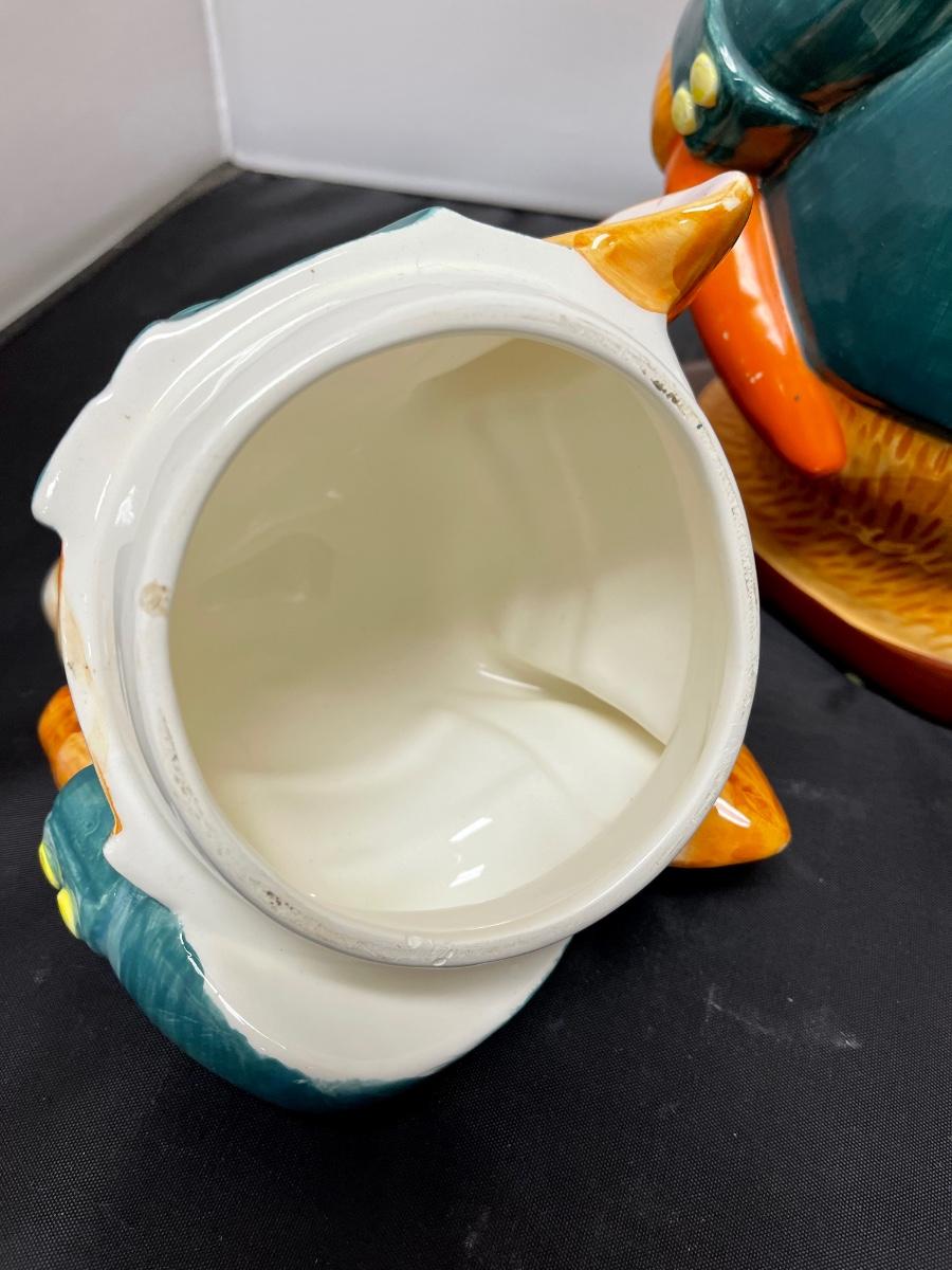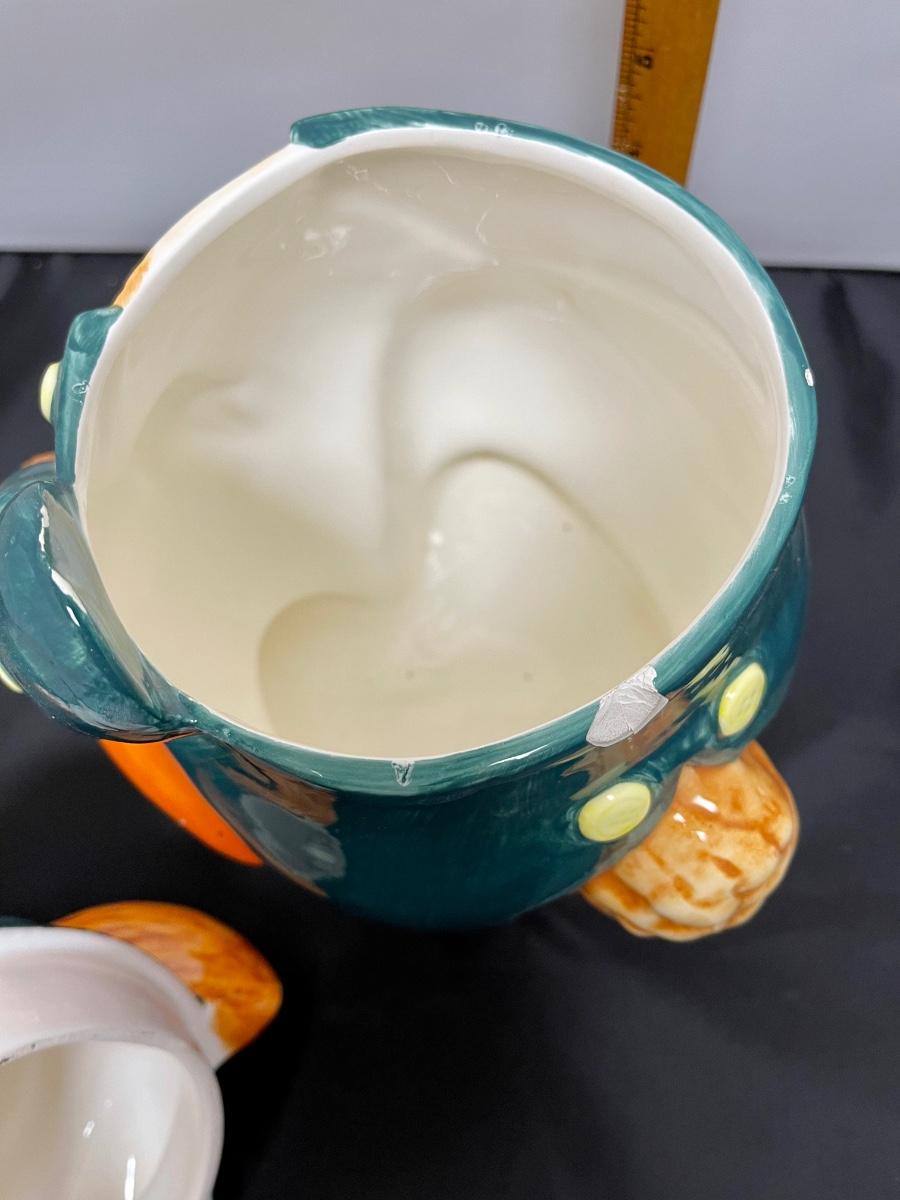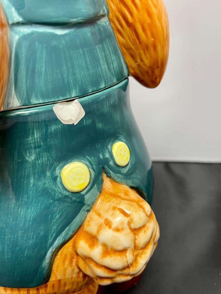 Beatrix Potter Peter rabbit ceramic cookie jar is chipped but most of the damage is hard to tell. Measures approx 12” high.