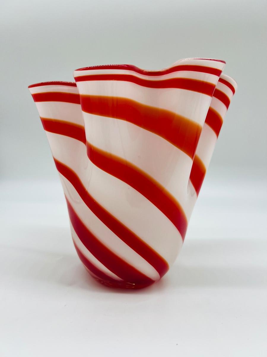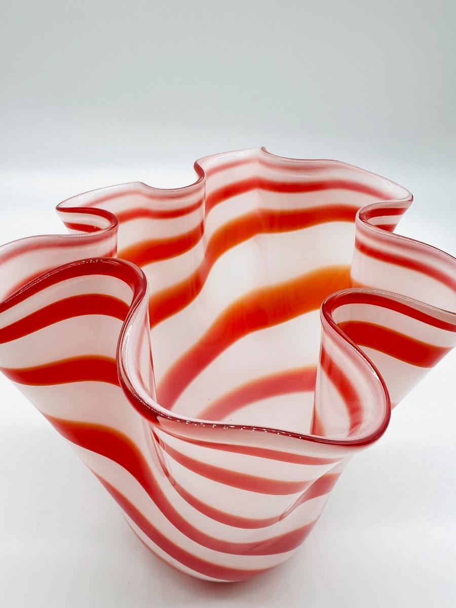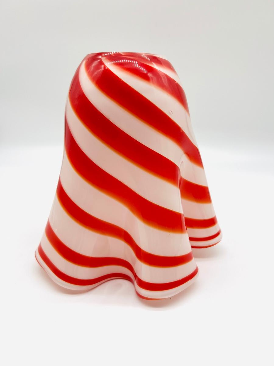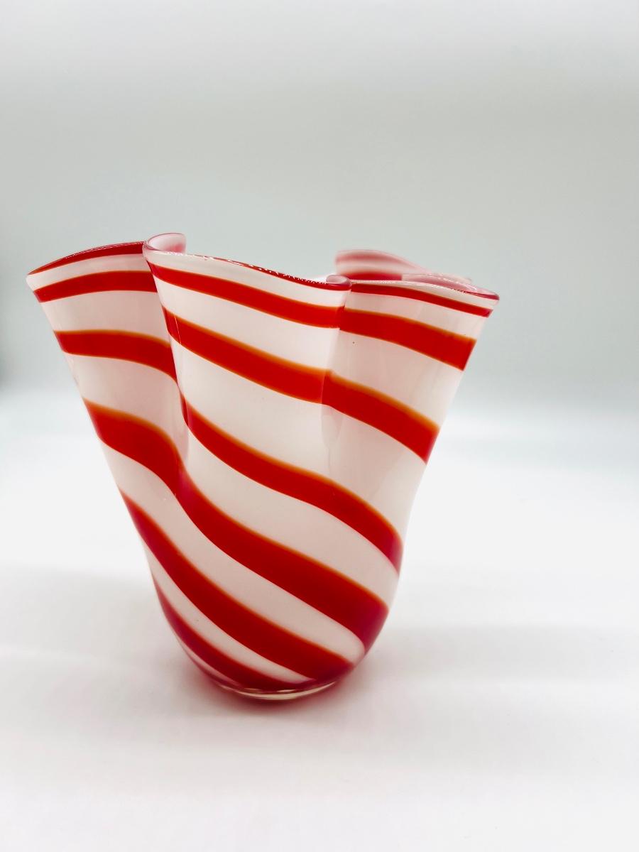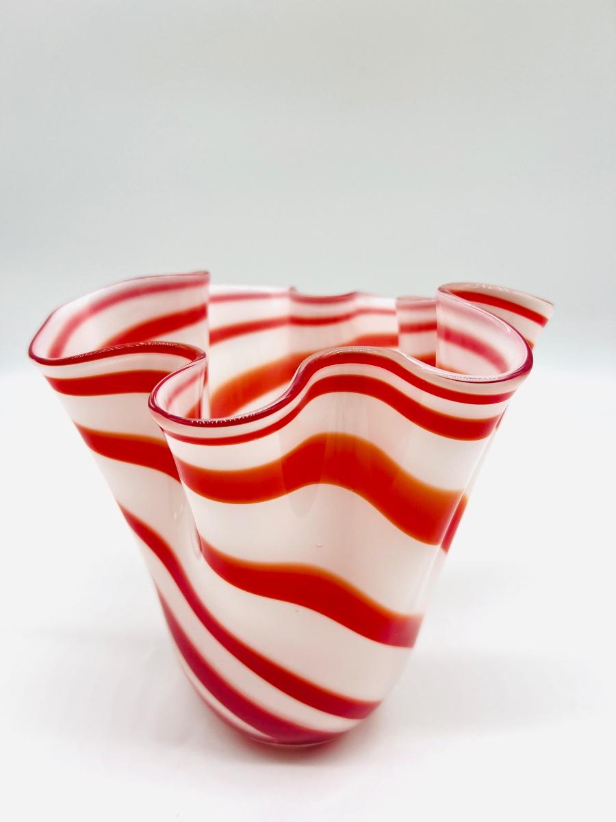 Beau Rivage handkerchief ruffle peppermint stripe blown glass vase. Measures 8 inches tall and 8 inches at its widest.