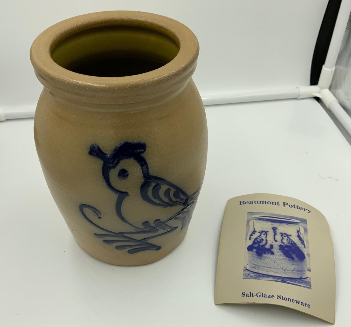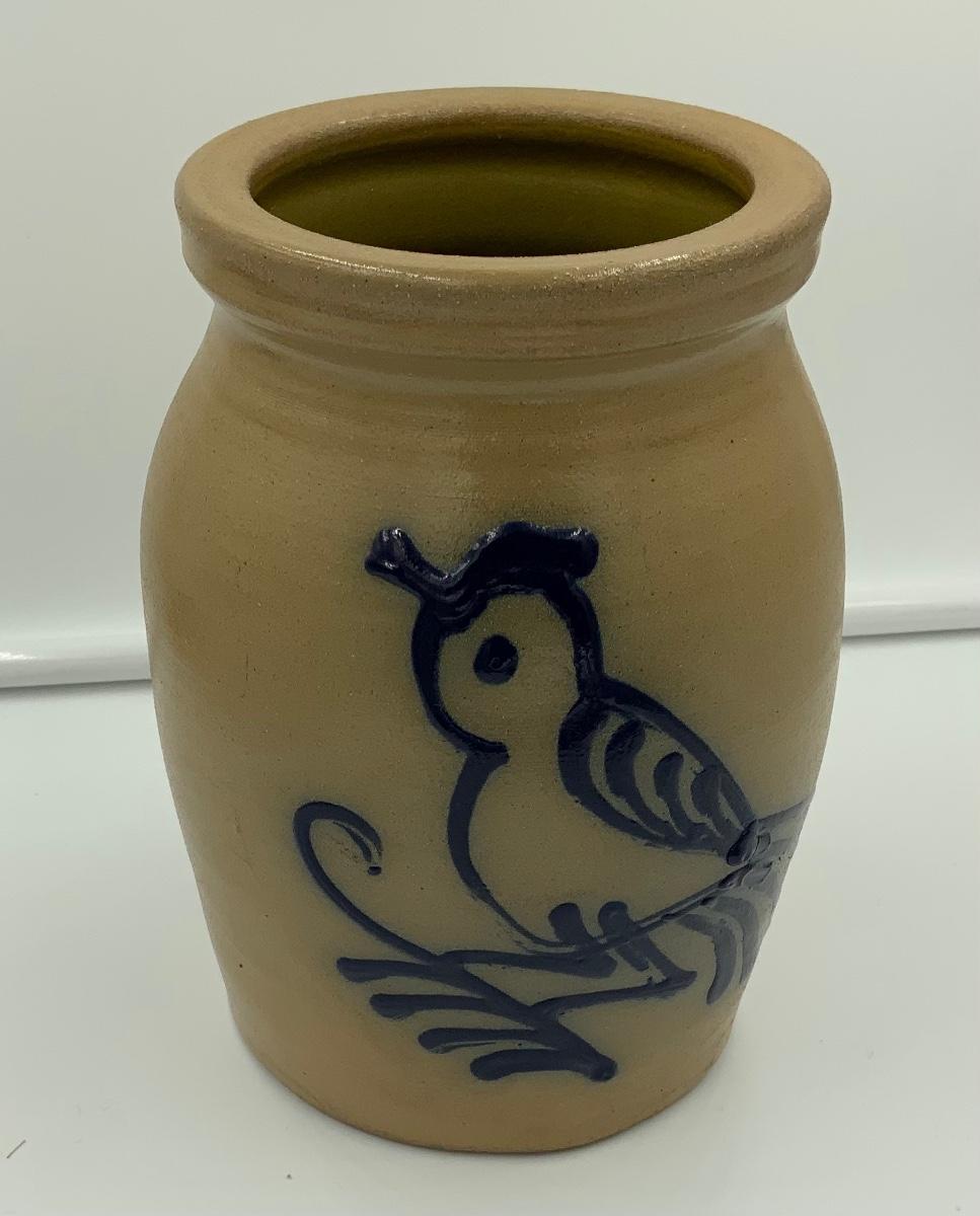 Fantastic crock with cobalt bird pattern! Measures 7”H x 5🔔W and in perfect condition.