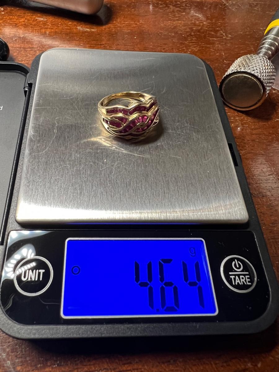 This is a beautiful 10 karat gold ring with pinkish red stones. It is size 6.25.
